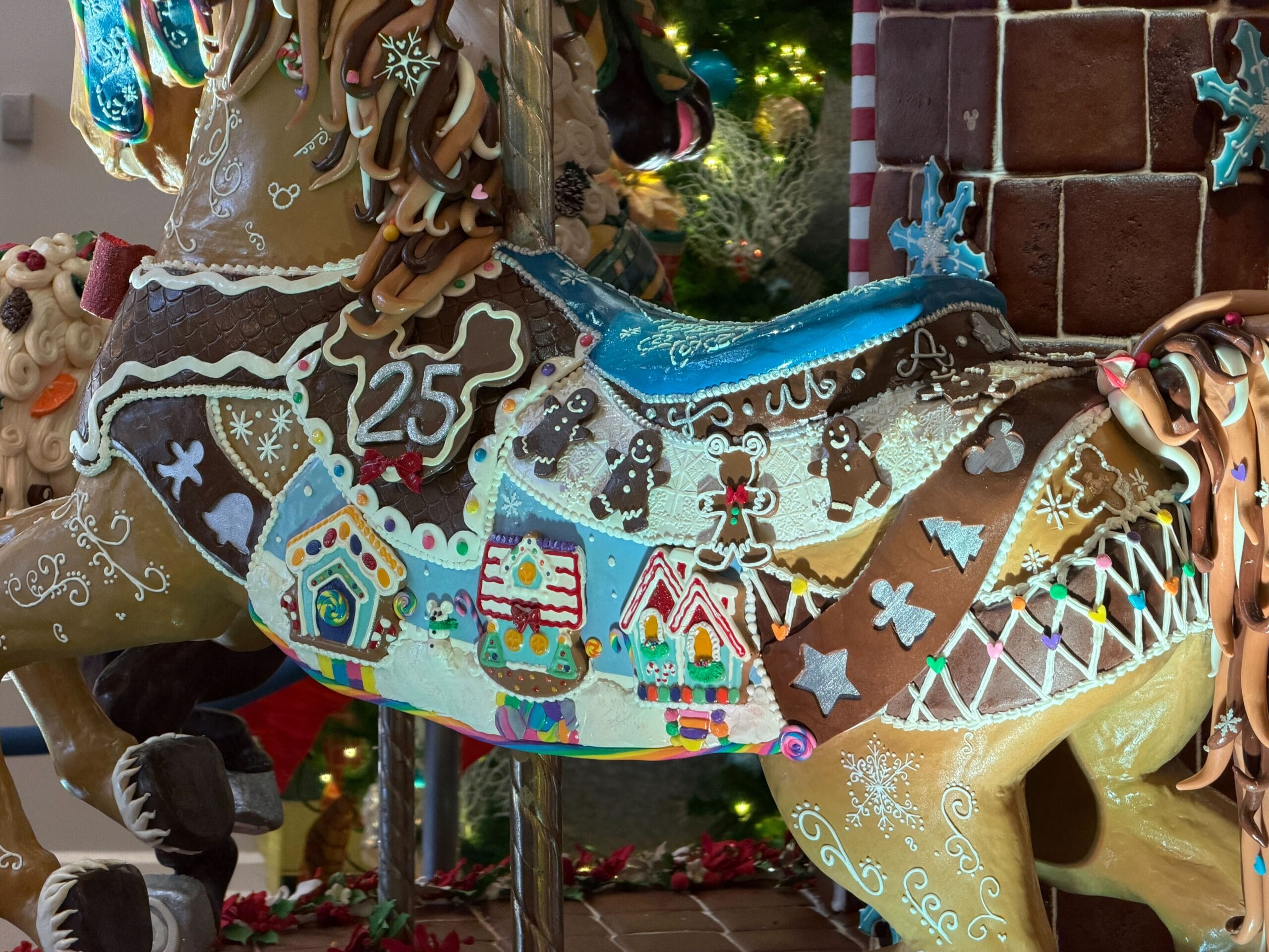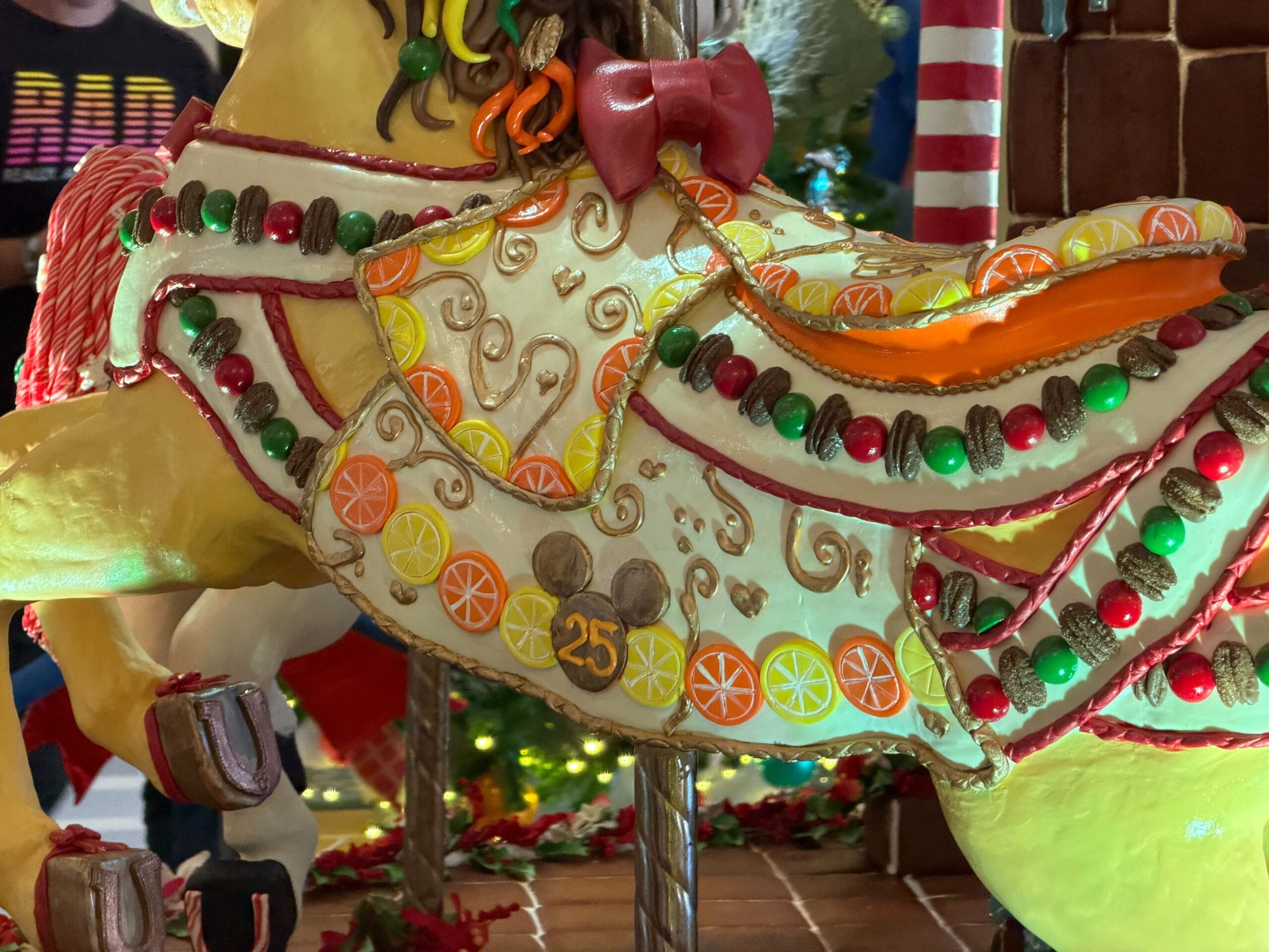 The number 25 is on a Mickey-shaped gingerbread cookie on its side. Cookie cutouts are on the straps of its saddle. It has snowy details on its neck and legs.