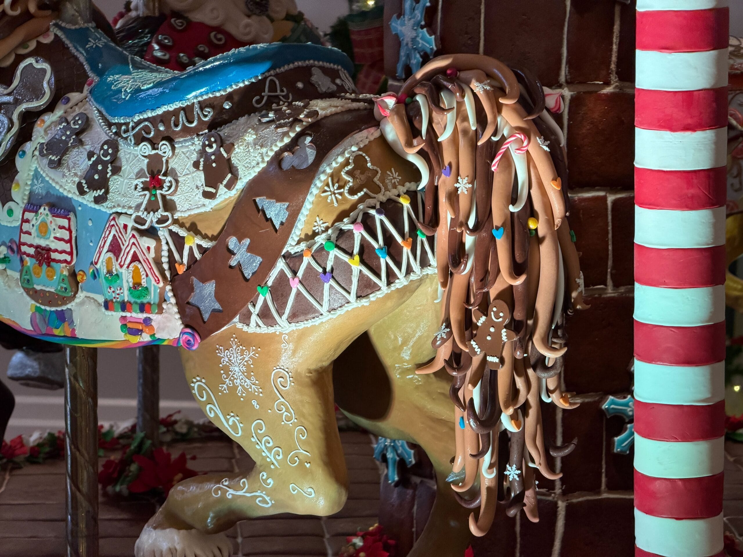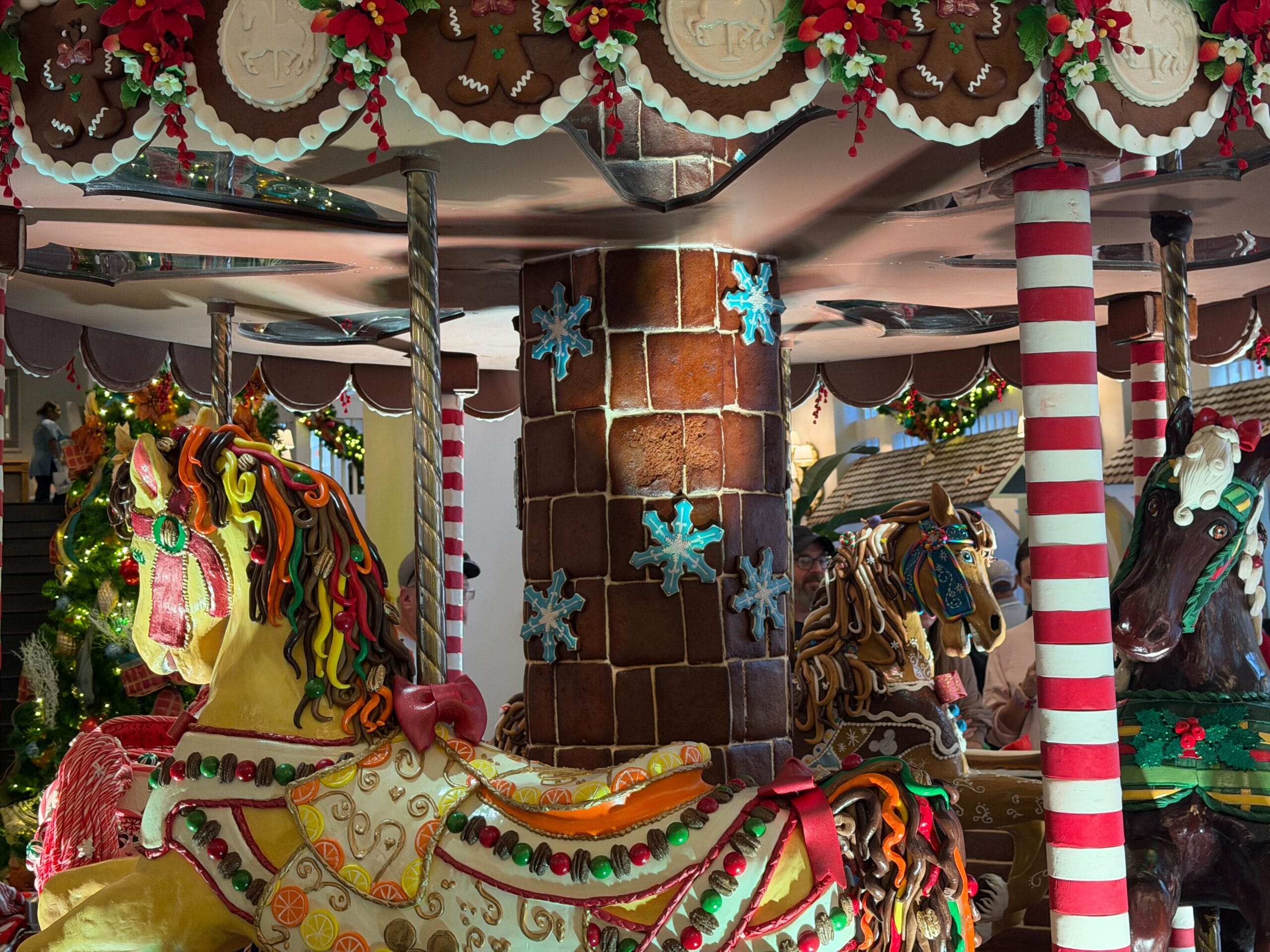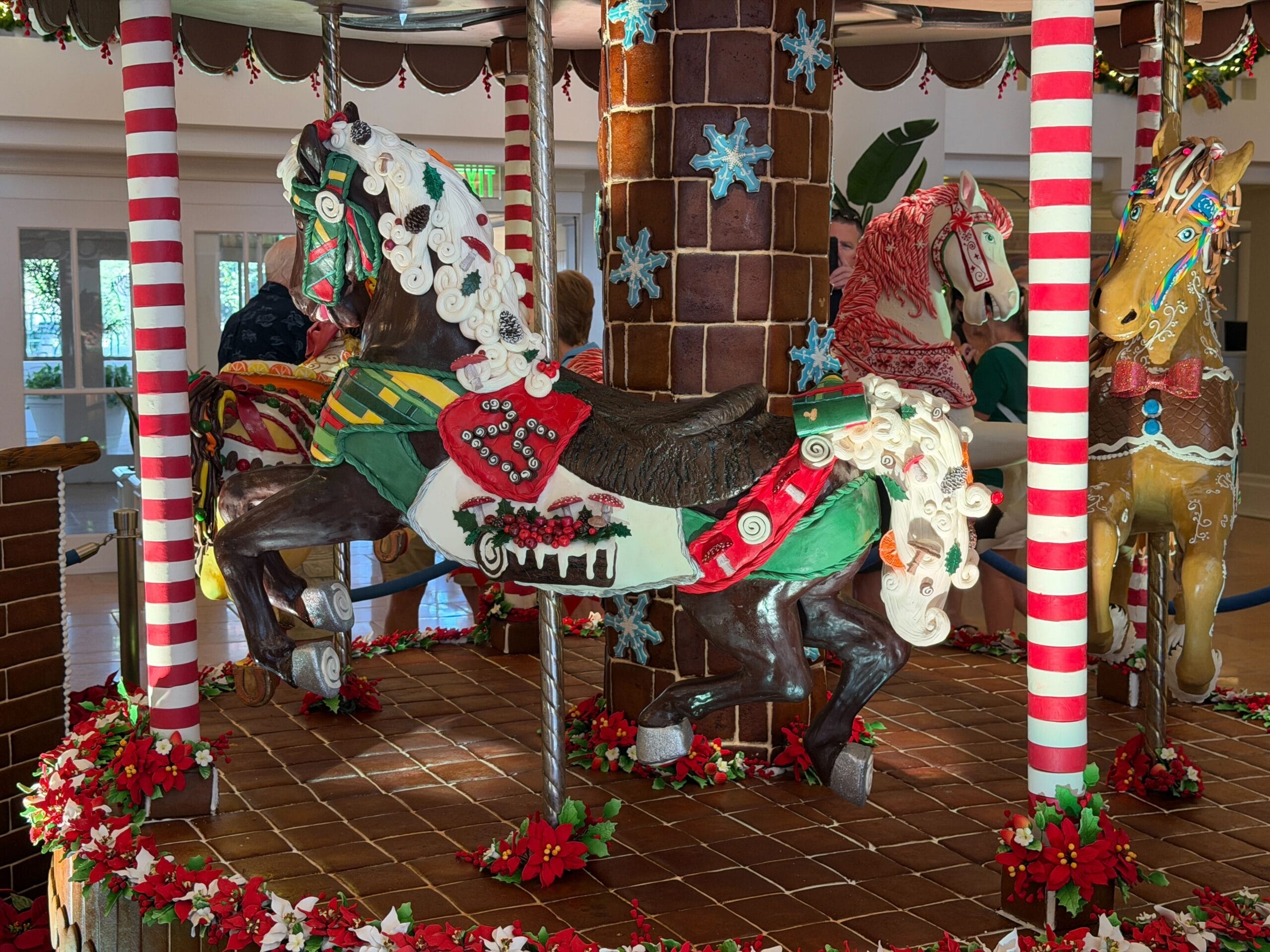 The gingerbread carousel actually spins, showing off four horses with a fifth stationary horse to the side. Foliage surrounds the display and stanchions keep guests from touching it.