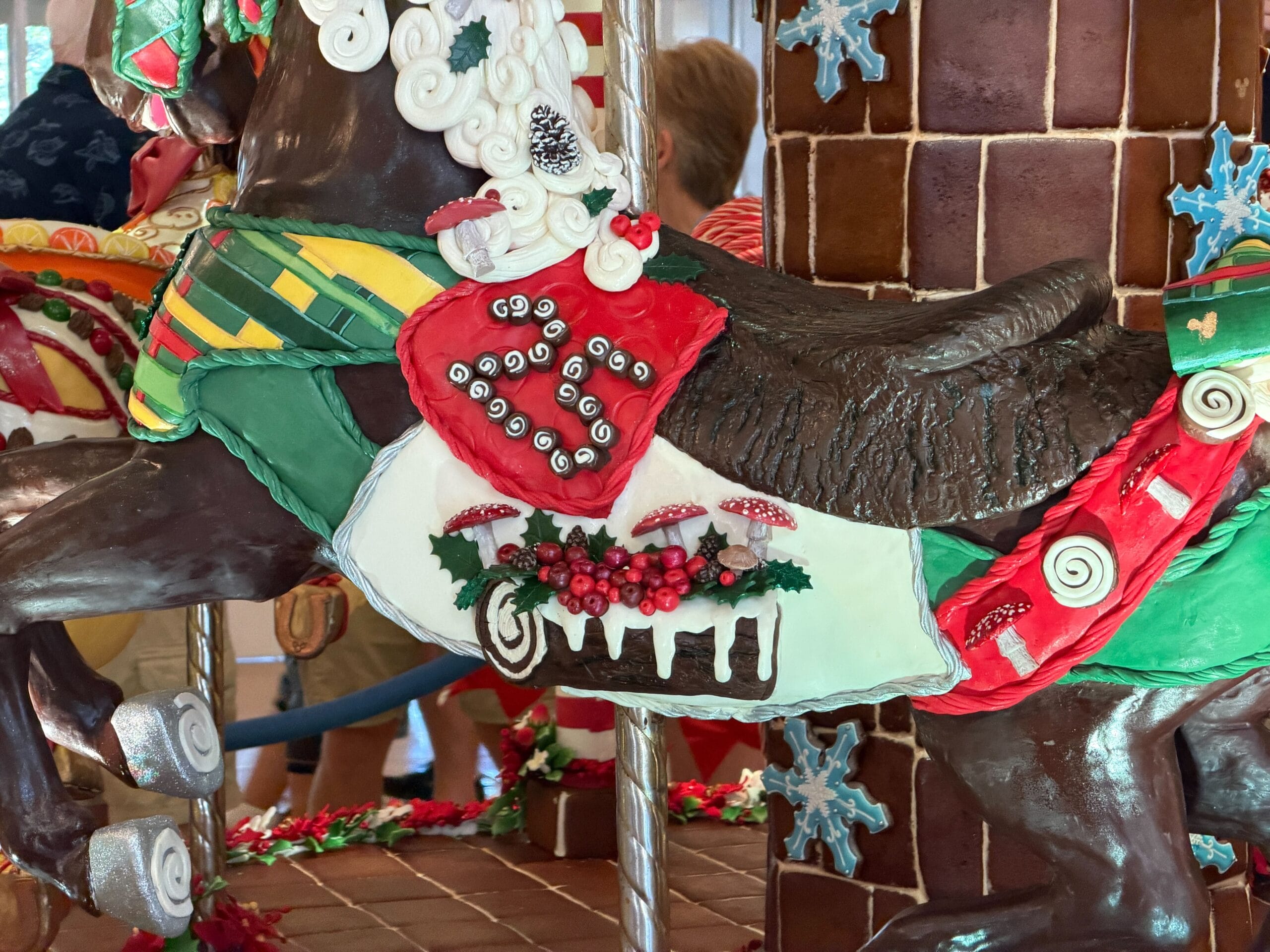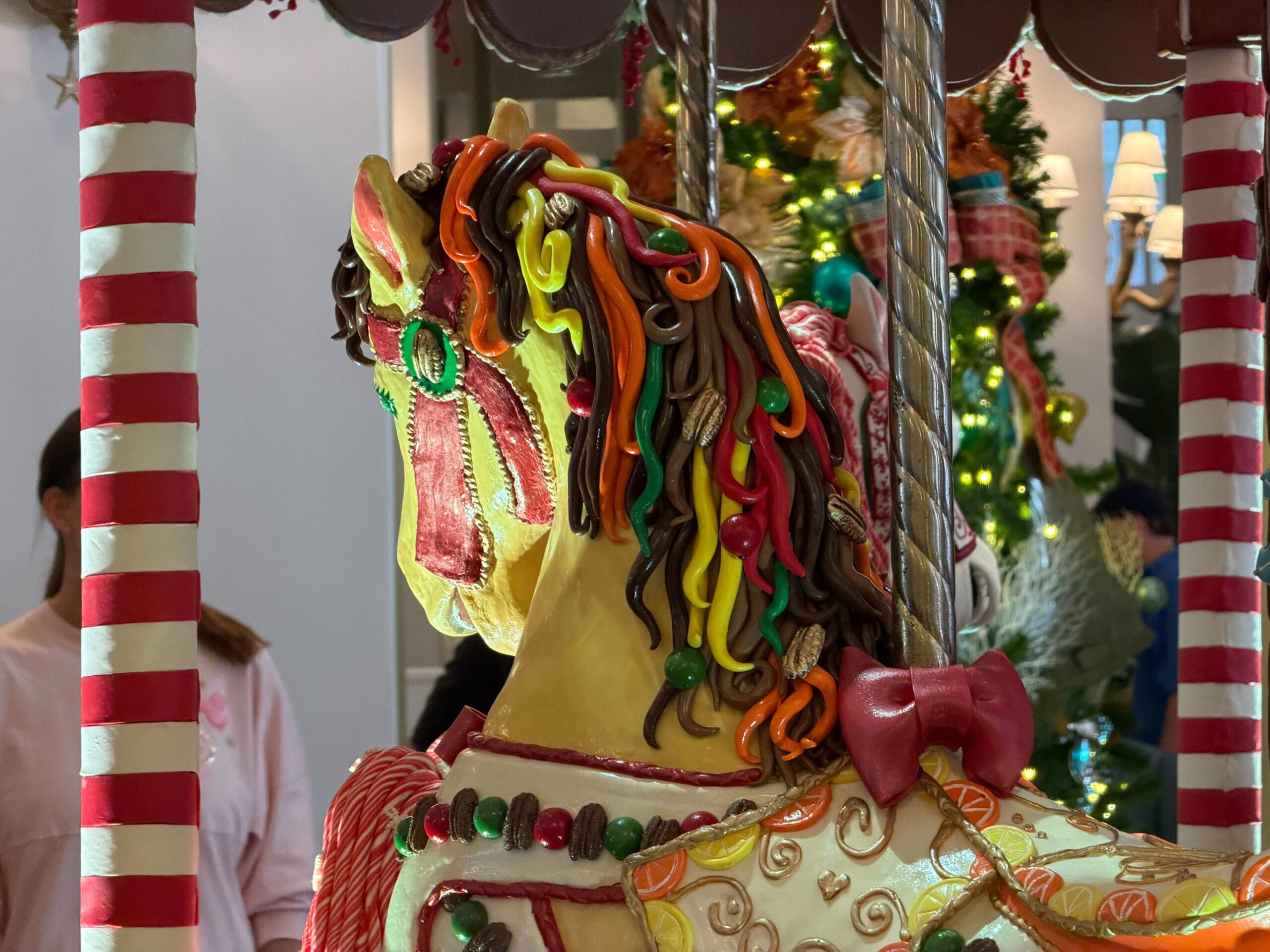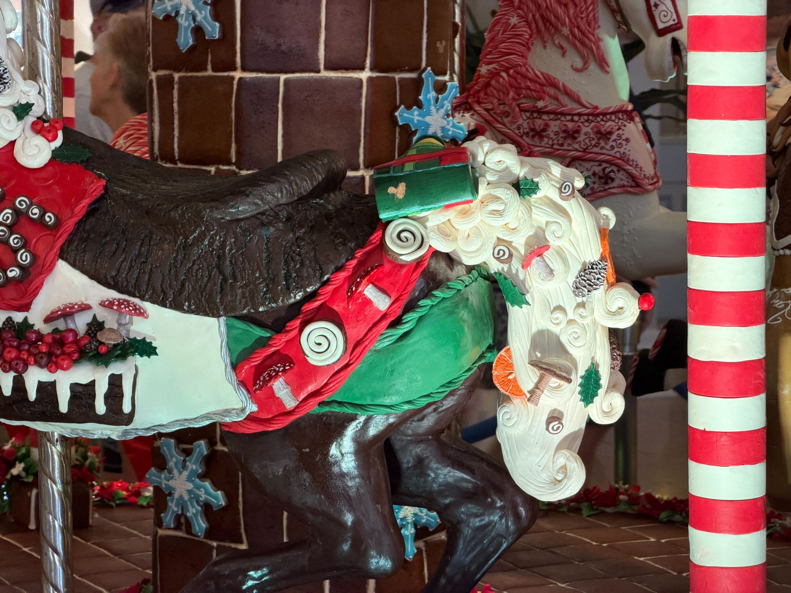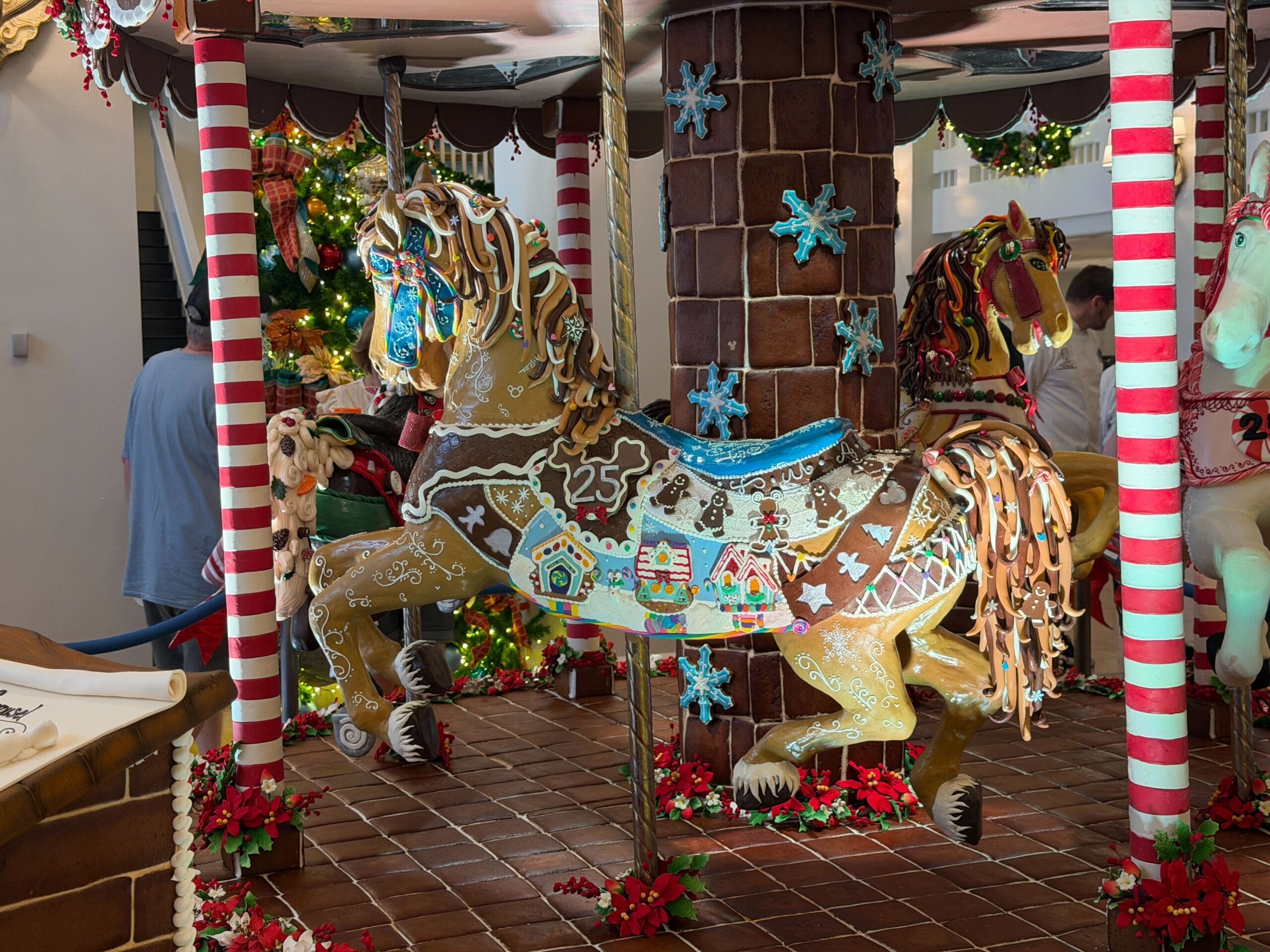 The gingerbread carousel actually spins, showing off four horses with a fifth stationary horse to the side. Foliage surrounds the display and stanchions keep guests from touching it.