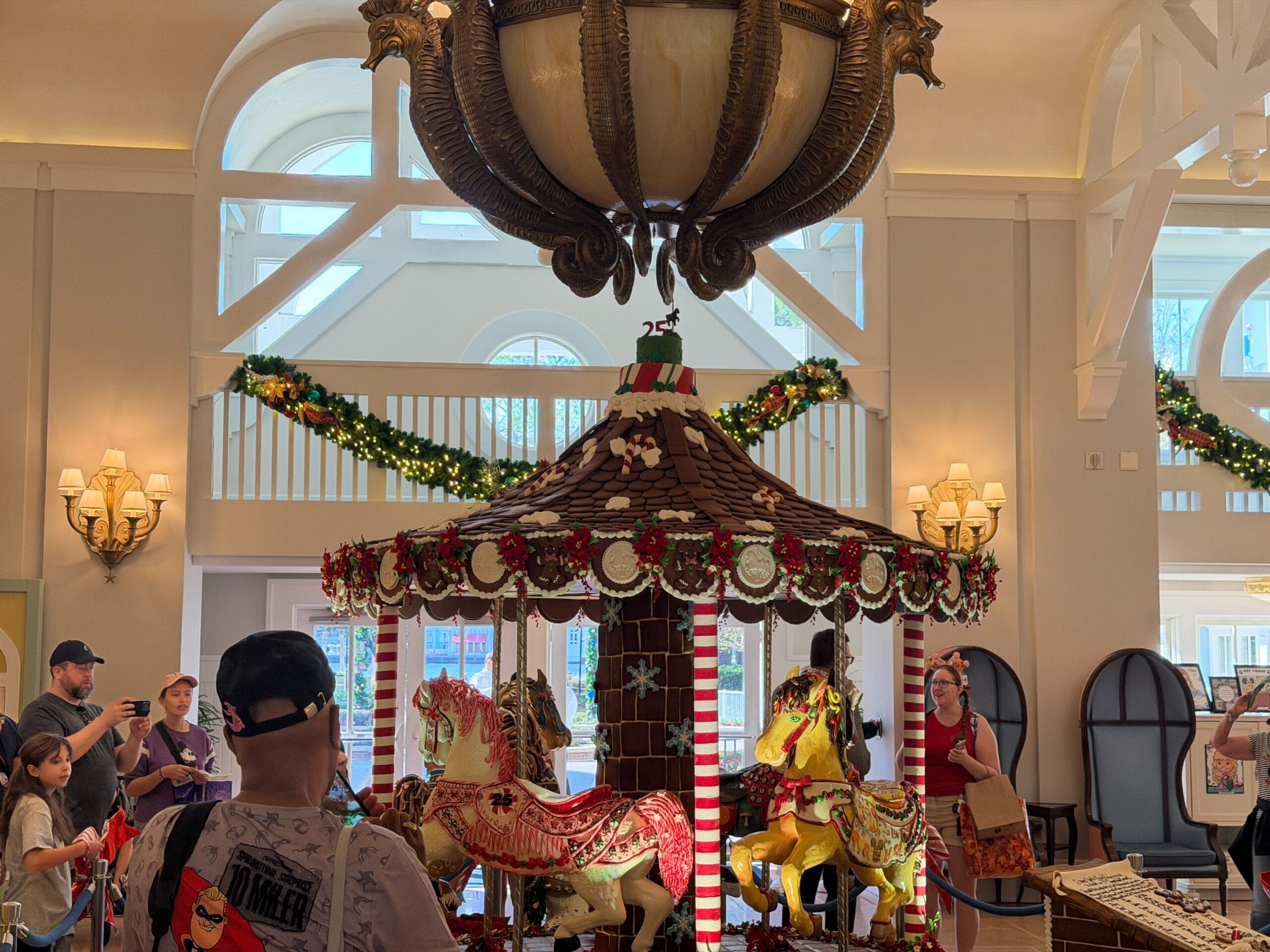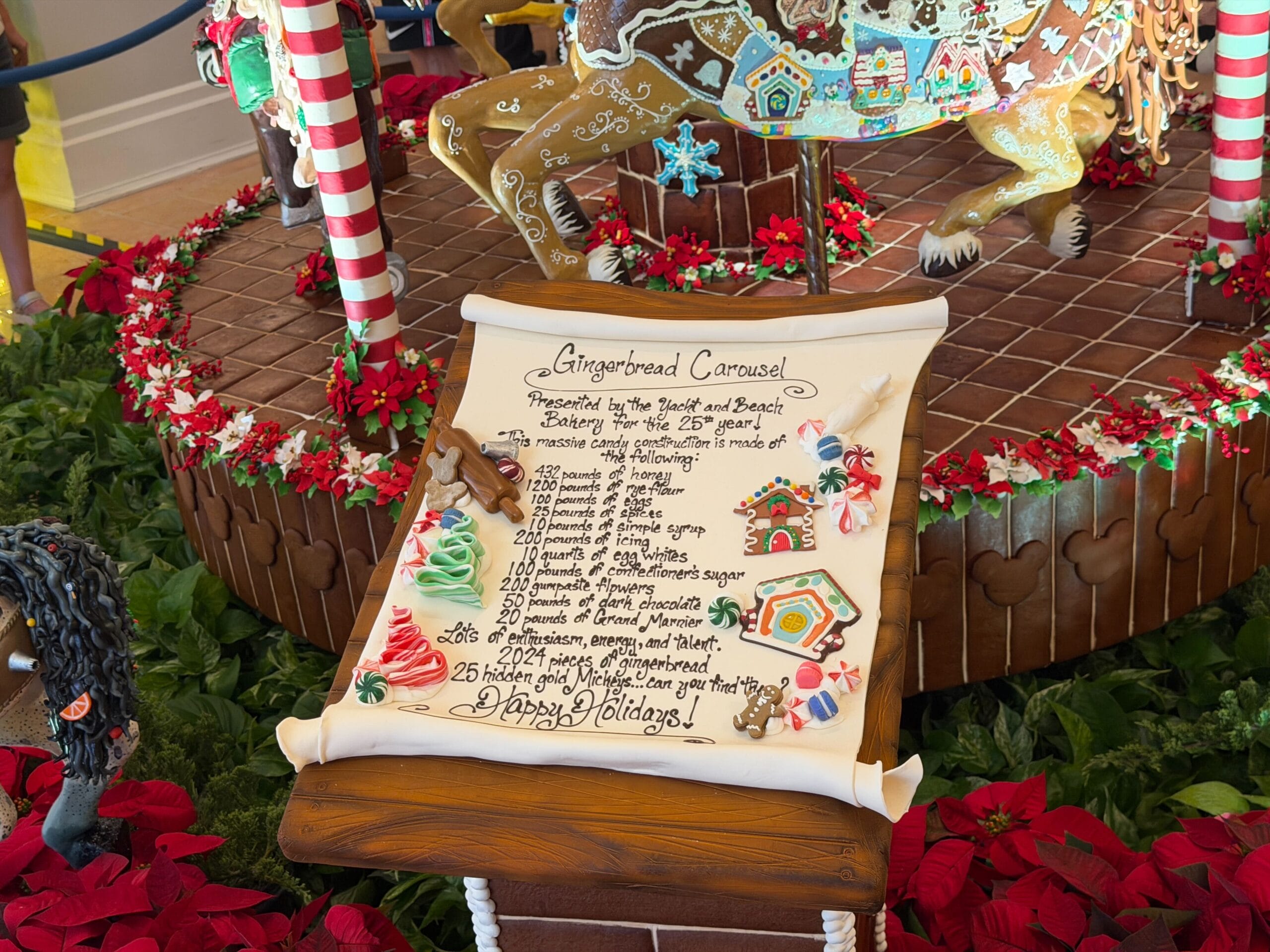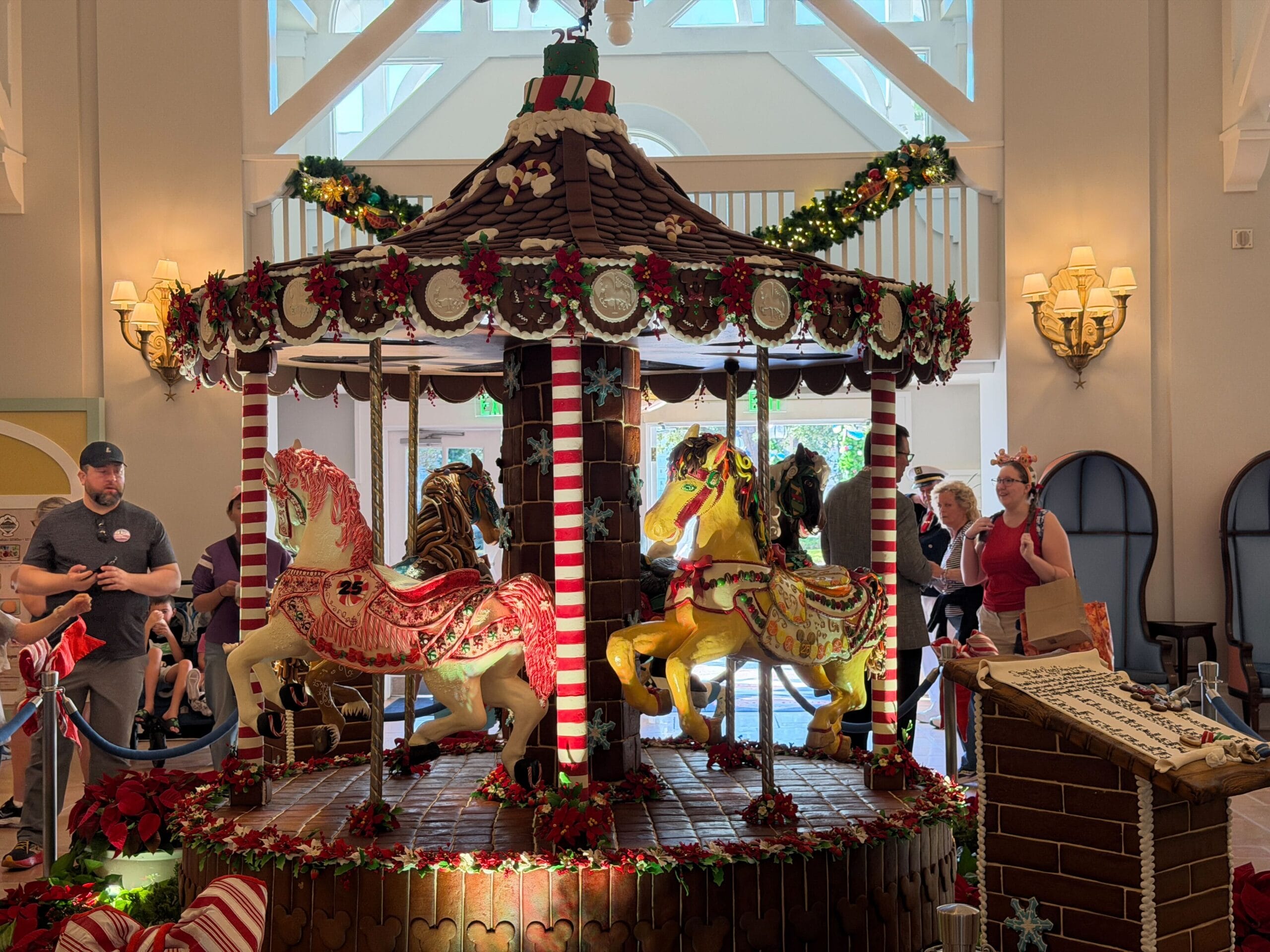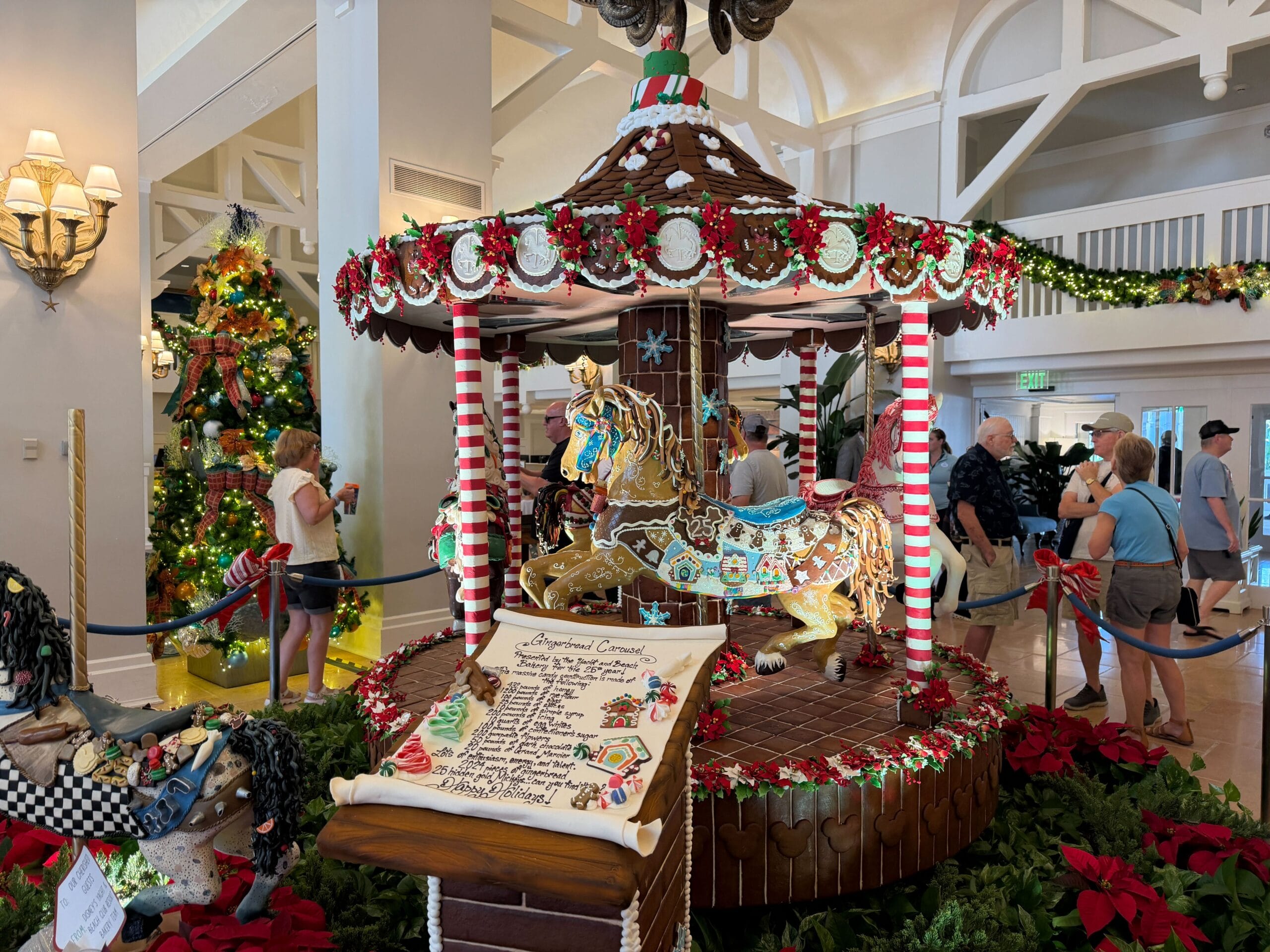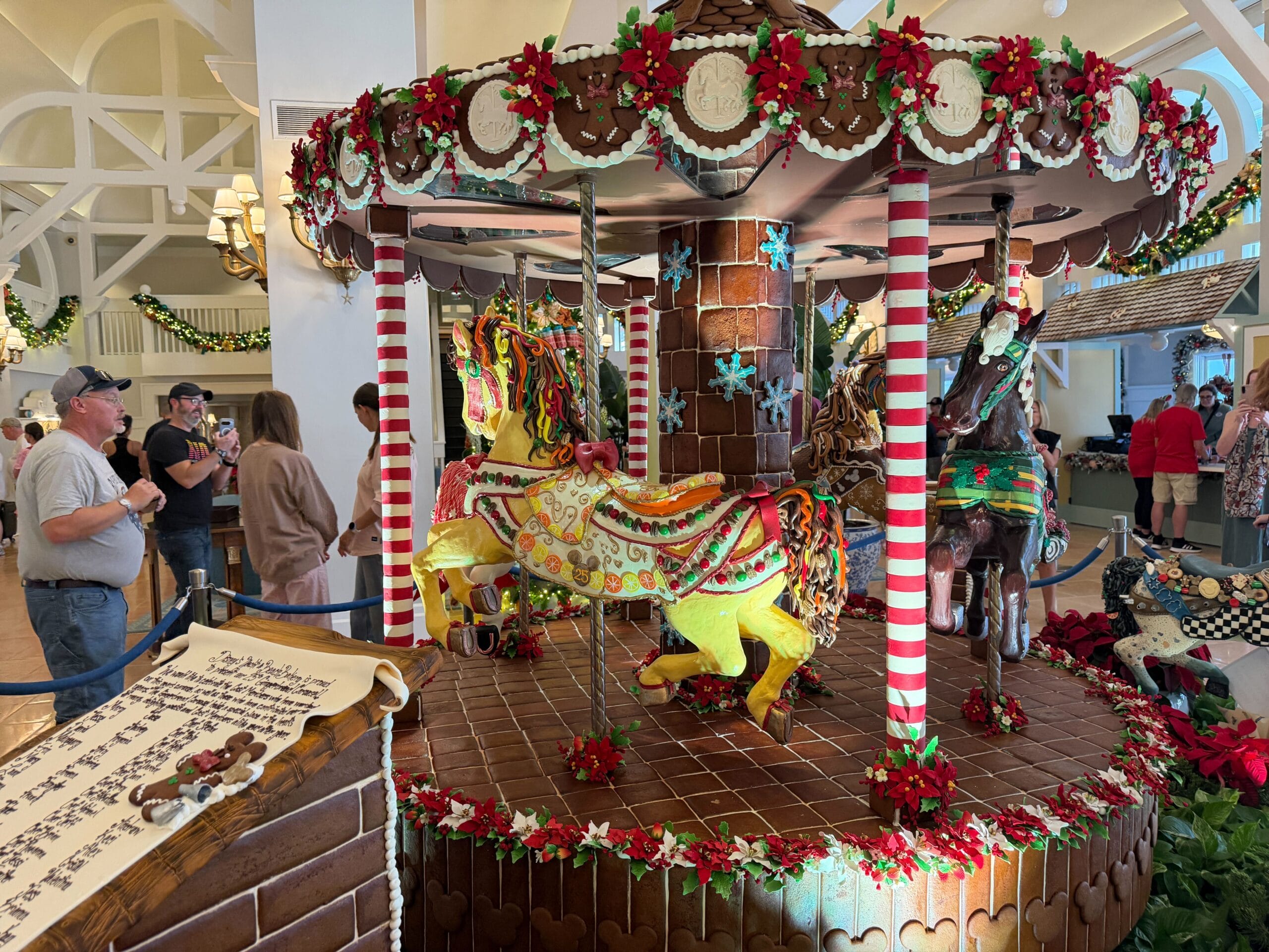 The annual gingerbread carousel at Disney’s Beach Club Resort is complete and the adjacent treats counter is open. The Beach Club and Yacht Club were putting the final touches on the lobby display yesterday. This year marks the 25th anniversary of the gingerbread carousel and it features the number 25 throughout.