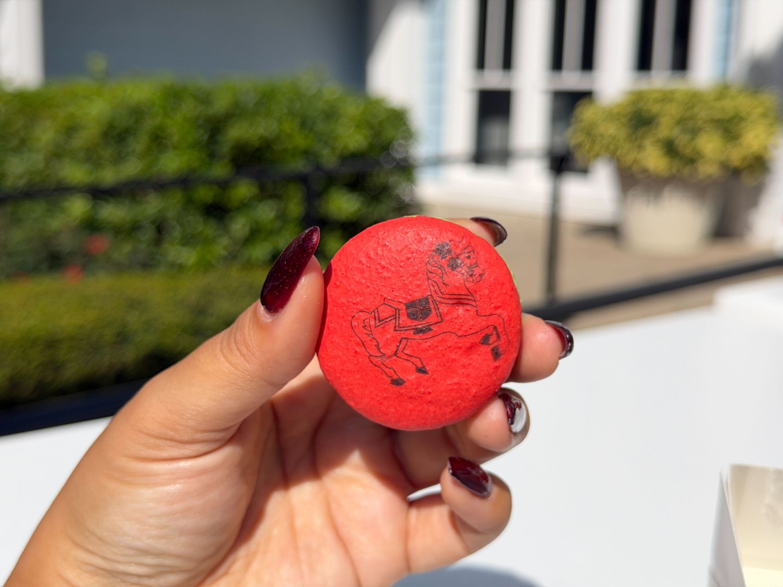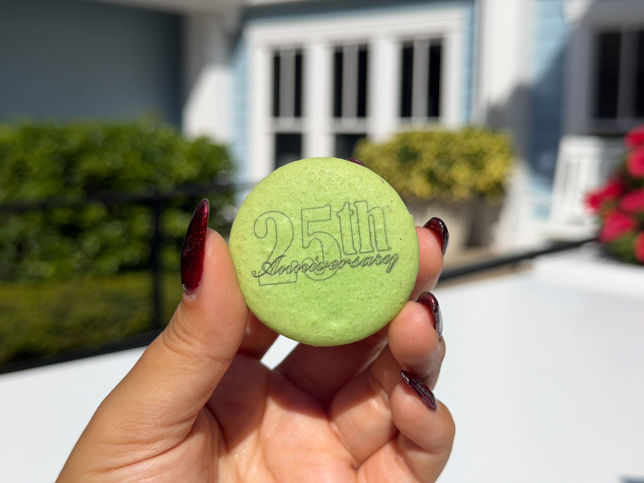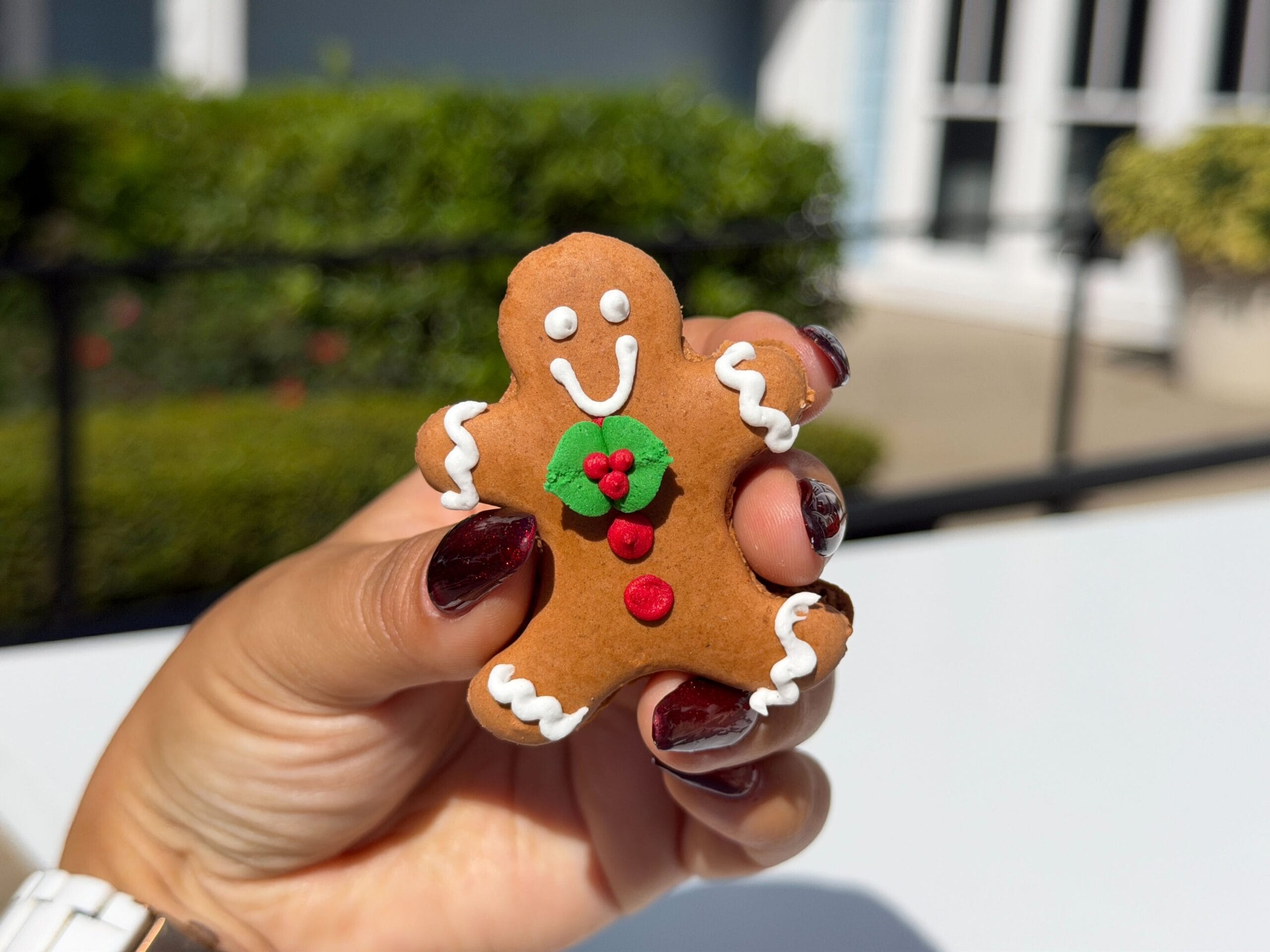 One of the circular cookies features “25th Anniversary” text while the other has a carousel horse. They are all filled with chocolate gingerbread spiced ganache. We mostly tasted chocolate with a hint of gingerbread. The almond flour shells make them a gluten-friendly treat. They are crispy with a festive presentation but aren’t anything special. We wish they had different flavors.