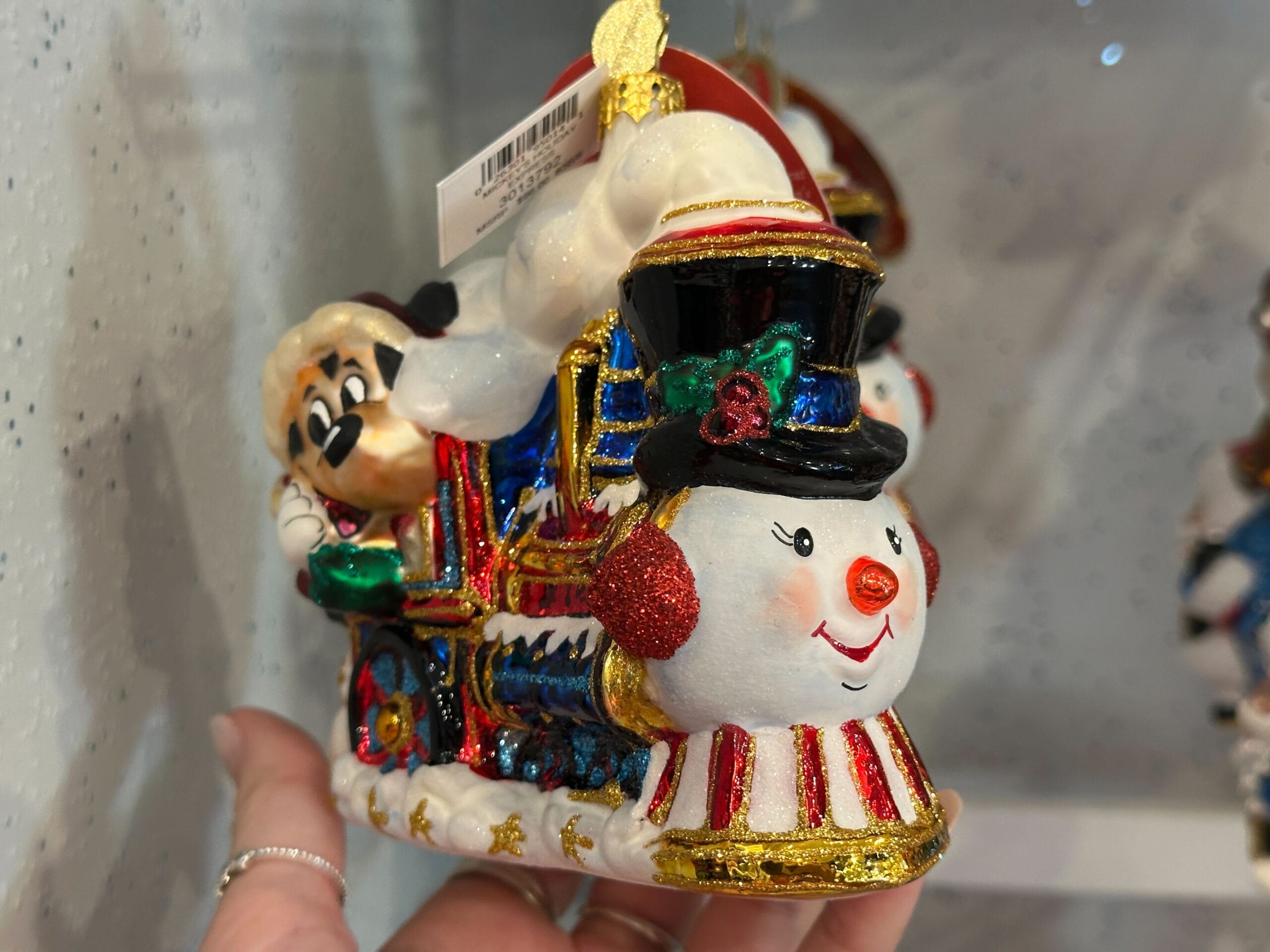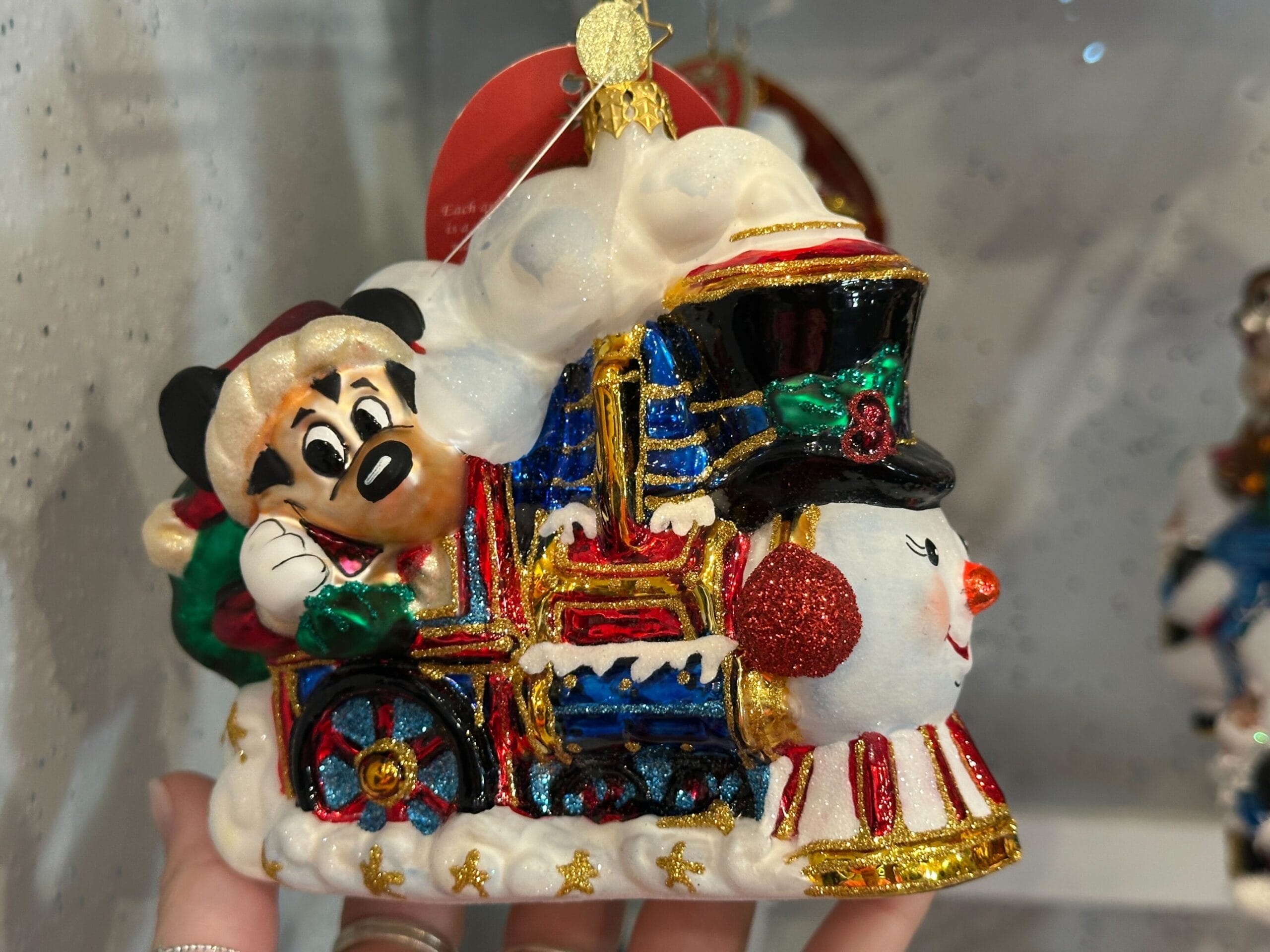 The last of the ornaments is a locomotive hauling Mickey and Christmas gifts through the snow. The front of the train looked like a snowman wearing a black top hat decked out in holly and sparkles.