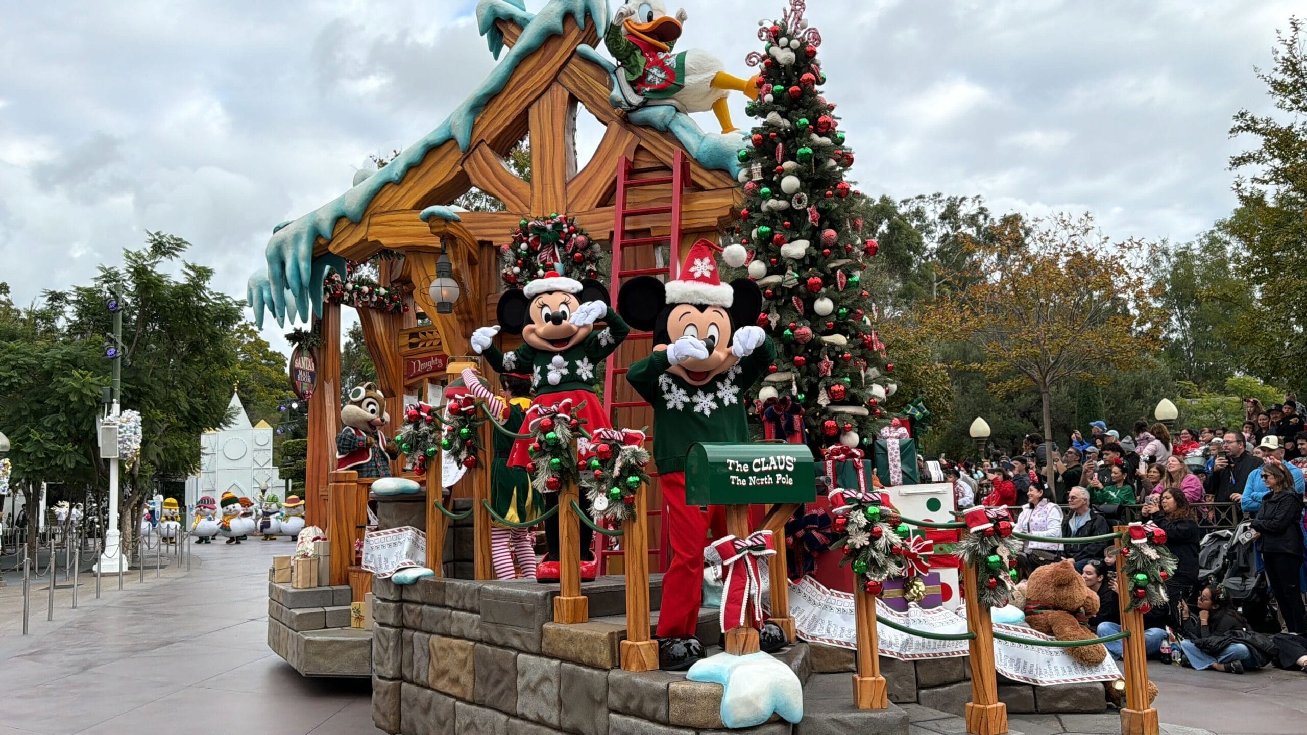 The next float resembles a wooden structure with a mailbox for “The Claus’.” Mickey and Minnie, in their green and red holiday sweater outfits, are at the front of the mailroom float with a Christmas tree and presents. Donald sits above them on a snowy roof beam