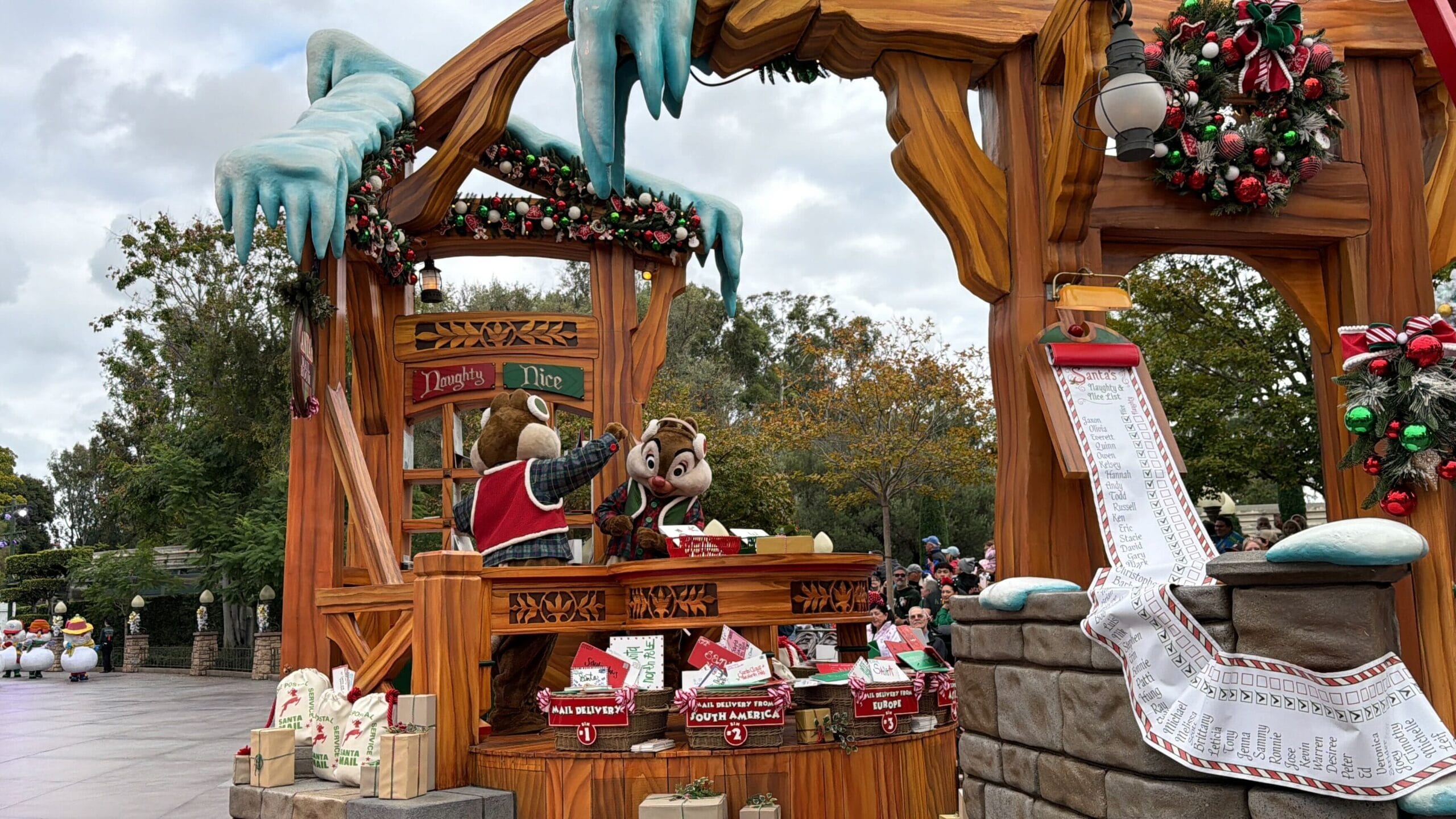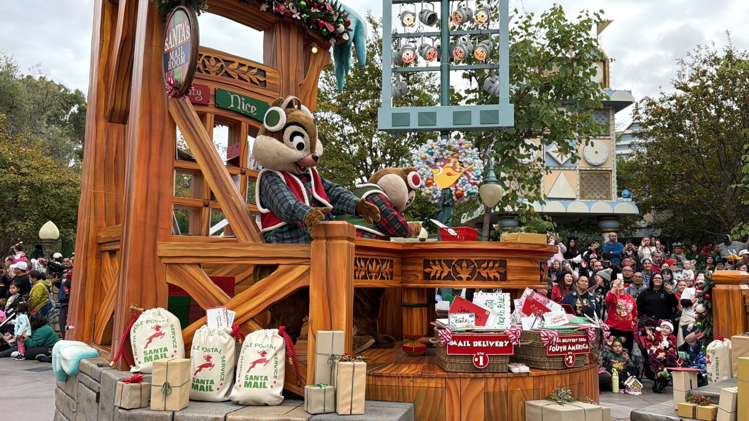 At the back of the float, Chip and Dale are sorting Santa’s mail into “Naughty” and Nice” piles. They wear coordinating red and green plaid outfits with earmuffs.