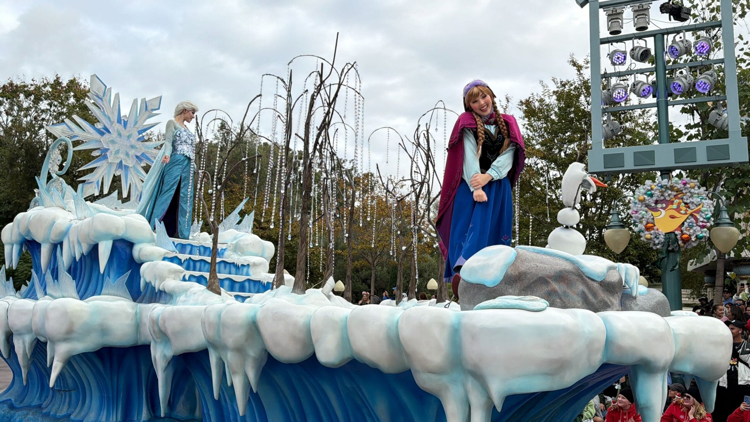 Anna and Olaf are at the front of the float, while Elsa stands on an elevated platform at the back.