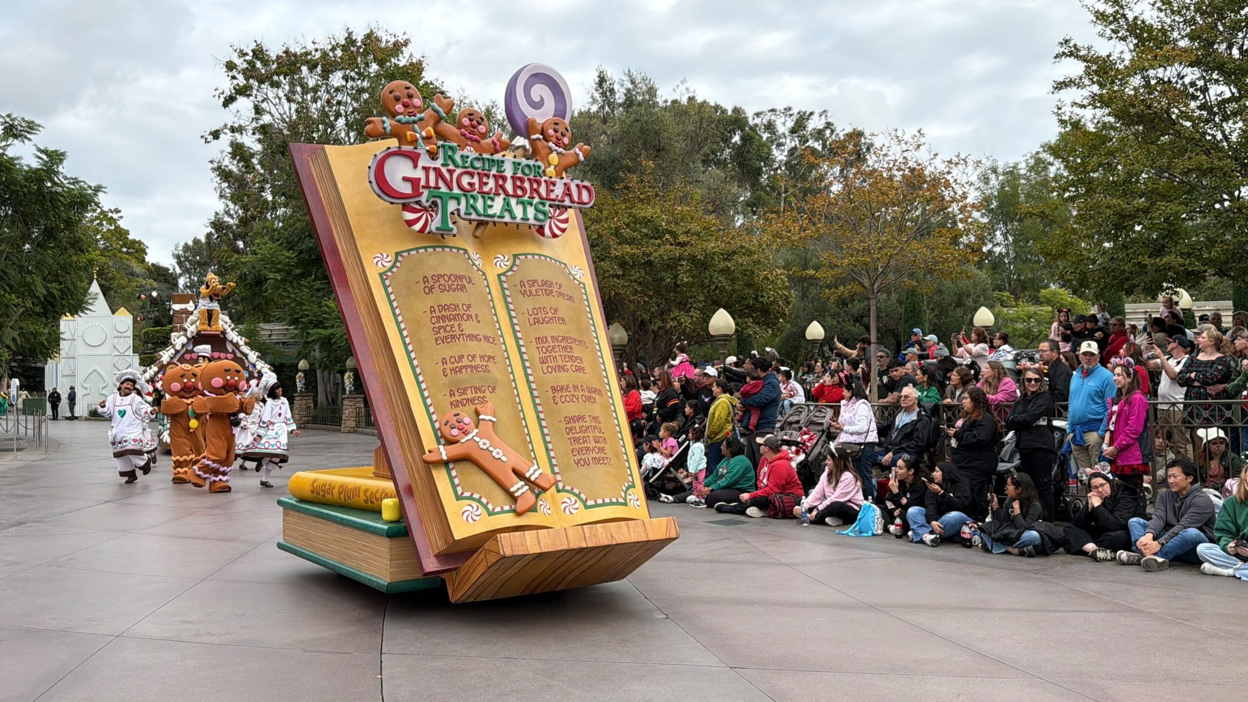 Behind the “Recipe for Gingerbread Treats” book float is another of a gingerbread house. Goofy is in the doorway wearing chef’s whites, while Pluto, wearing an apron, sits on the roof waving to the crowd.