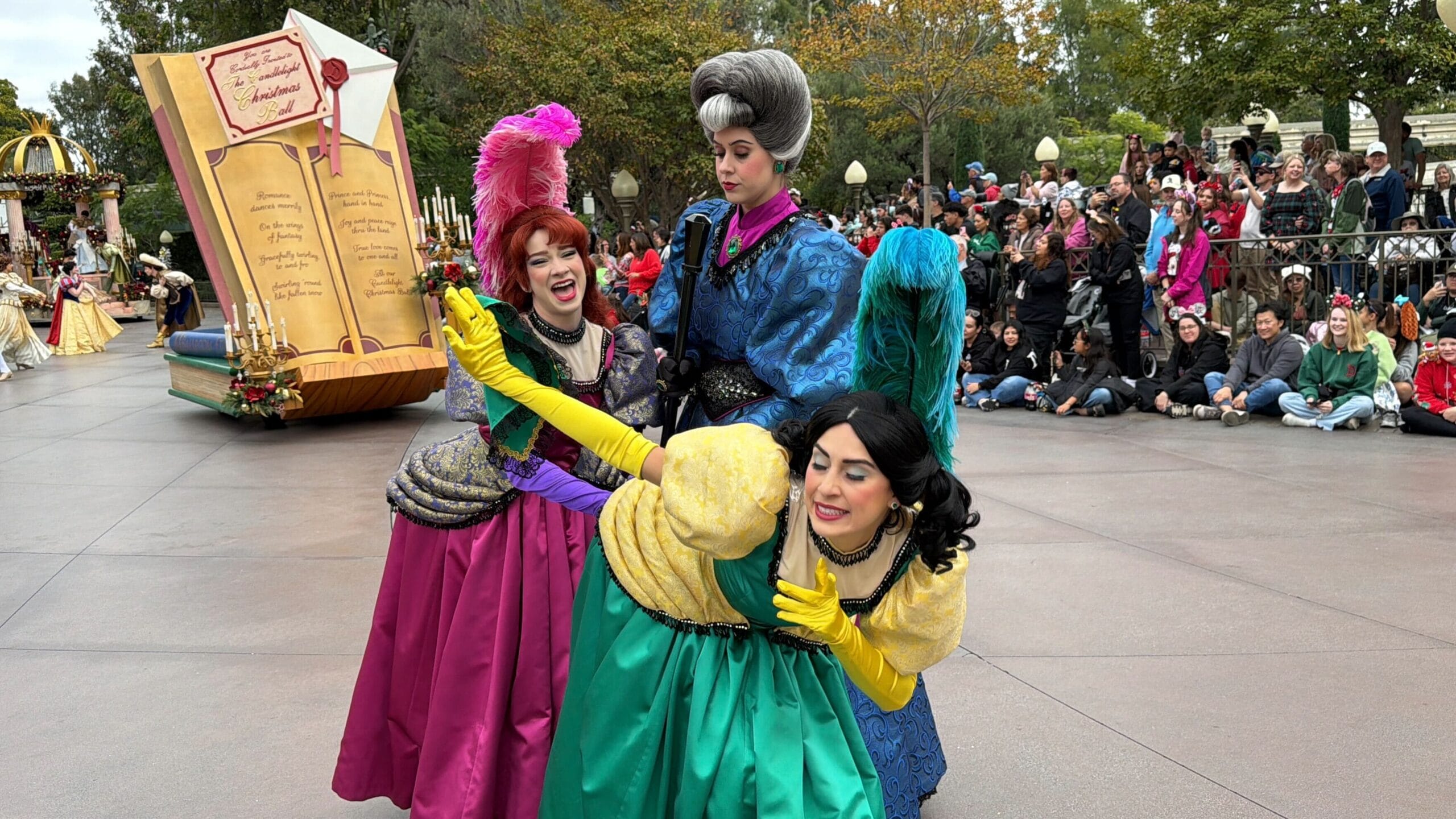 Lady Tremaine, Anastasia, and Drizella precede the Princesses, flouncing along the route. The giant book float behind them features an invitation to The Candlelight Christmas Ball (but they aren’t on the list).