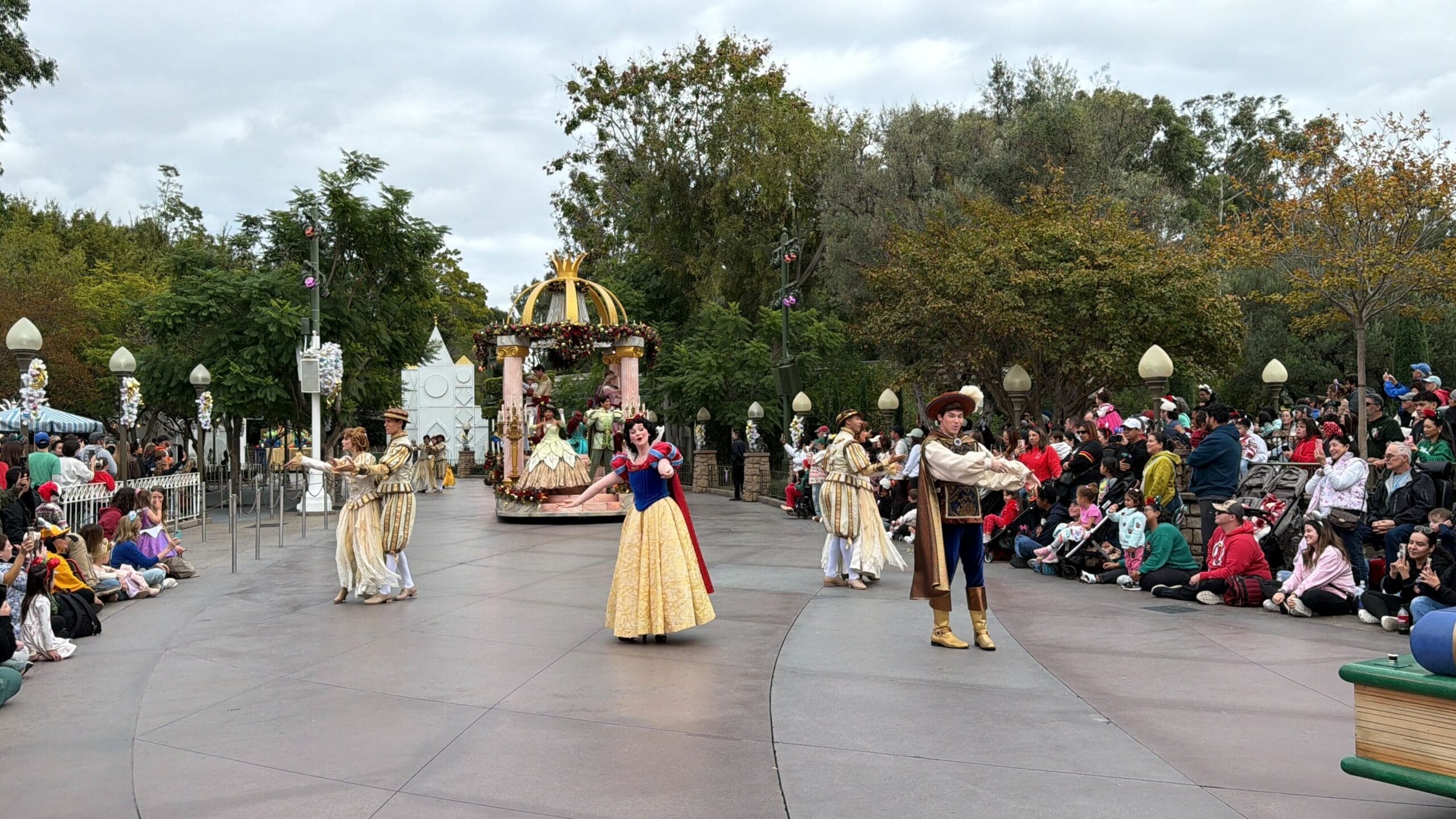 Snow White and Prince Charming are dancing behind the book float, accompanied by ballroom dancers in white and gold ensembles.