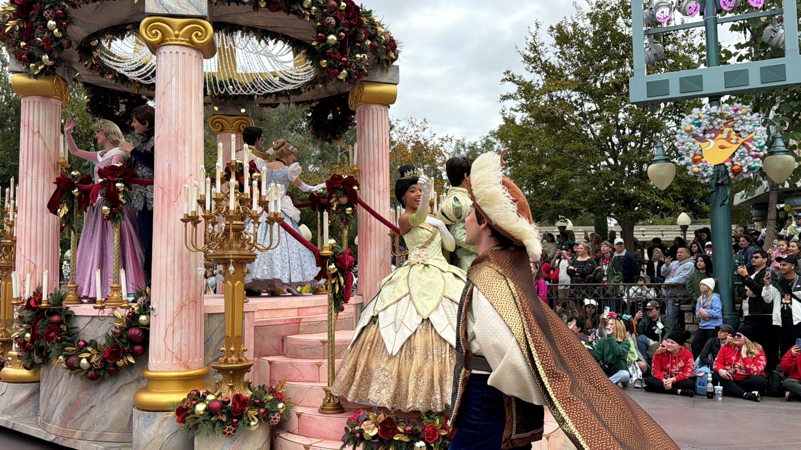 Princess Tiana and Prince Naveen are on the front of the ballroom float, which is festooned with rich garland. Standing on the dais are Aurora with Prince Phillip and Cinderella with Prince Charming.