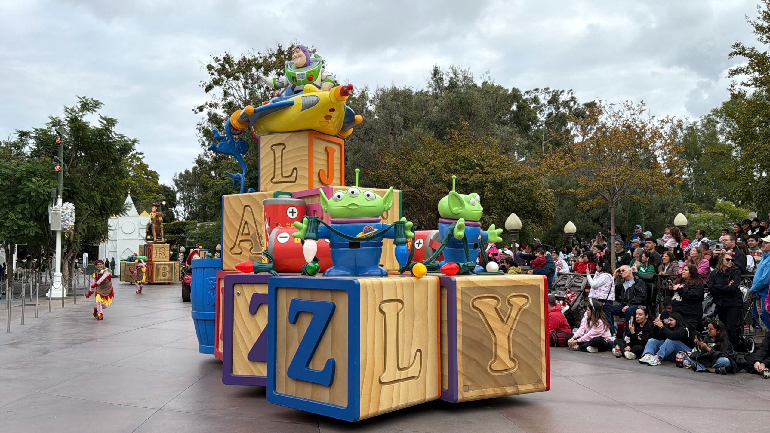 Buzz Lightyear kicks off the toy section riding atop his toy block float.