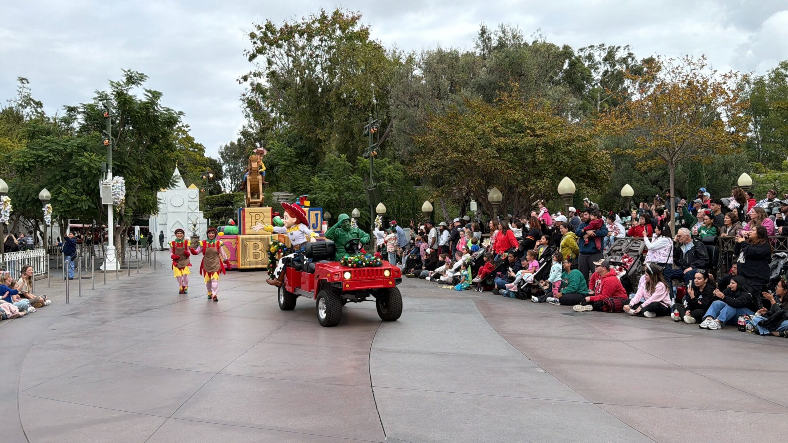 Behind Buzz, a Green Army Man drives a red vehicle decorated with garland. Jessie waves from the backseat. Toy factory elf dancers follow behind.