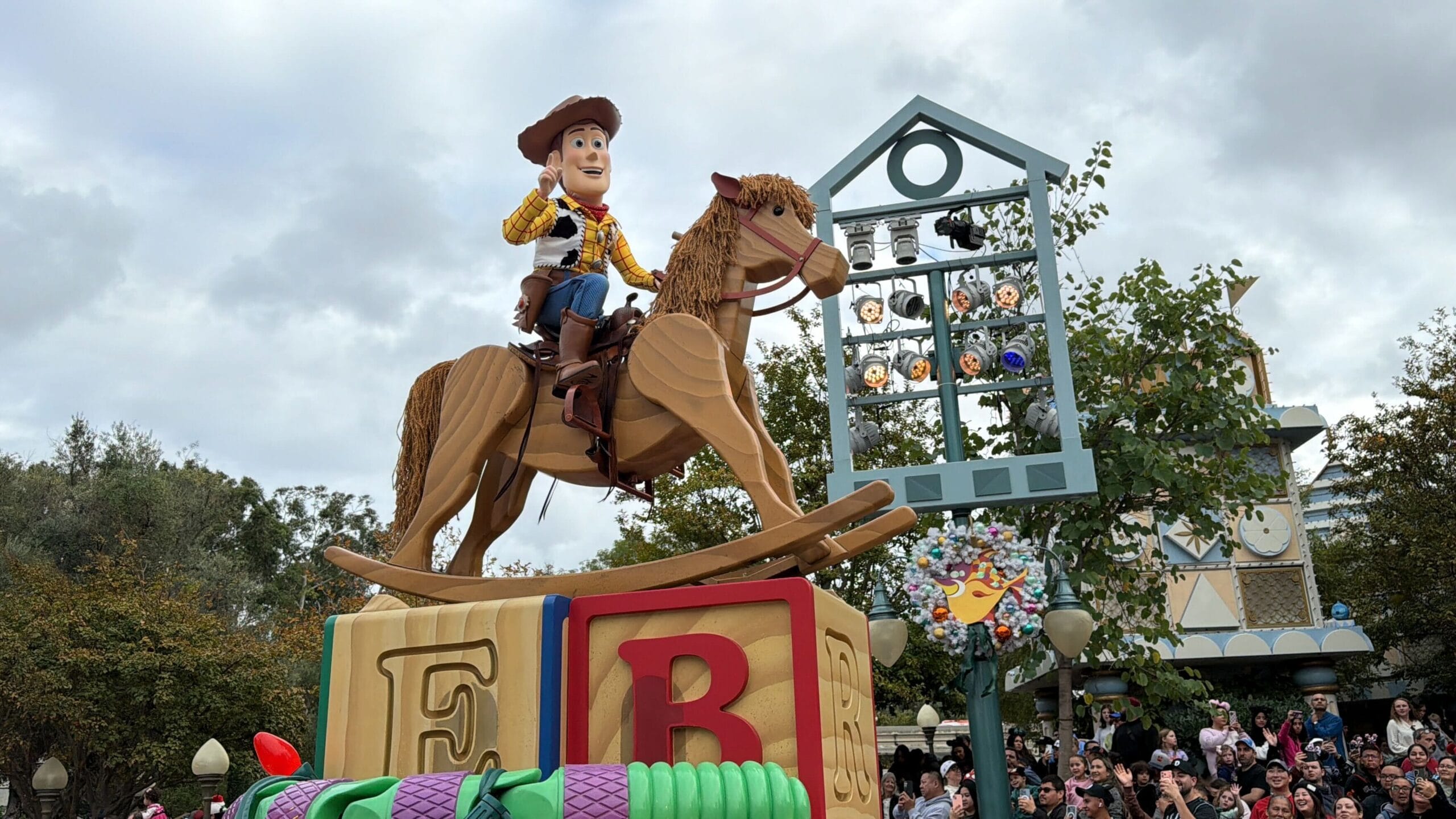 The second toy block float features Woody riding a rocking horse.