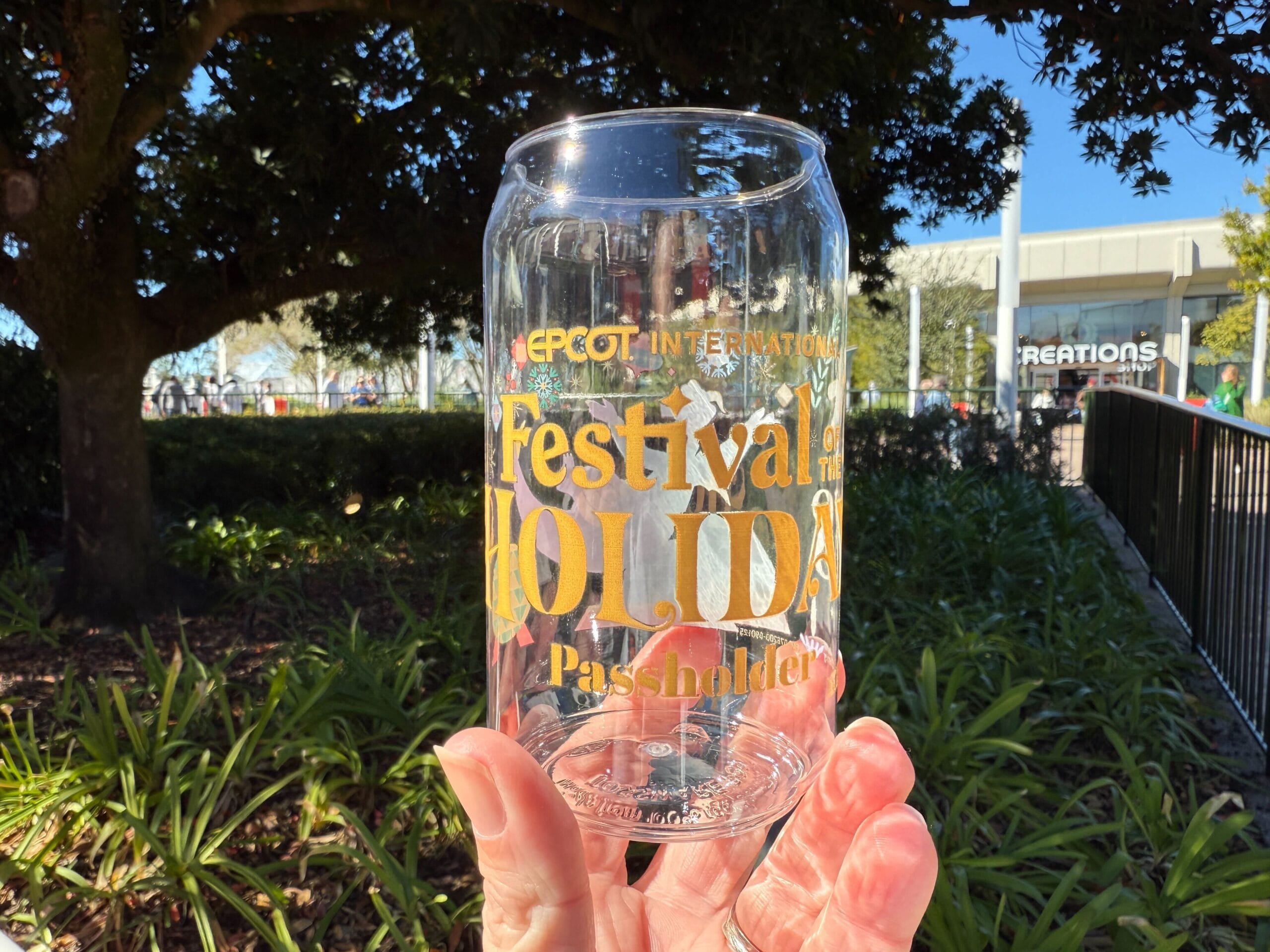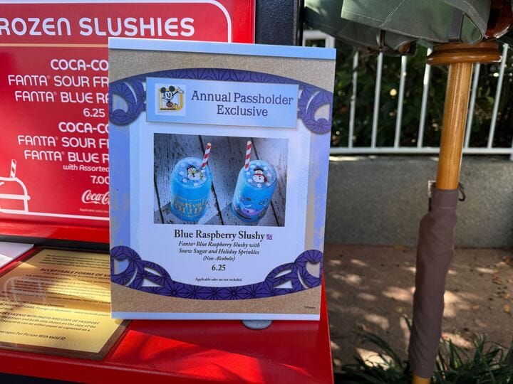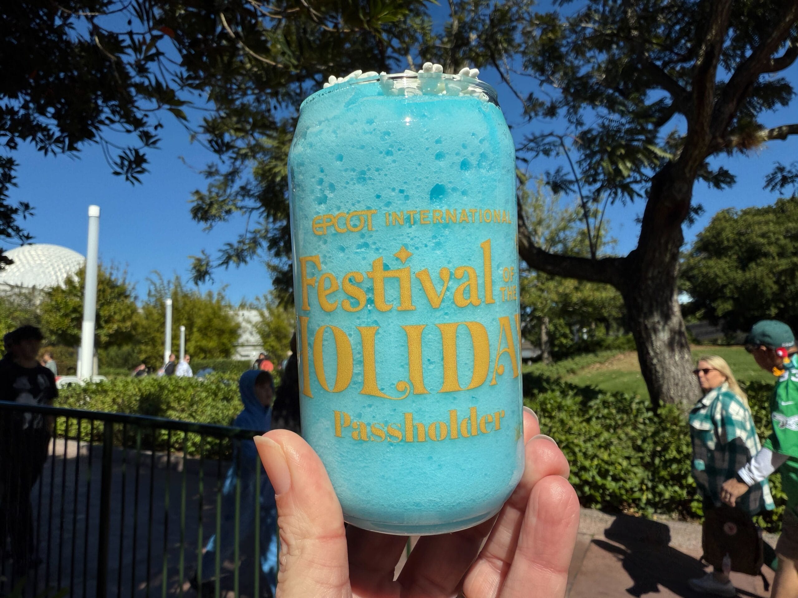 It comes with the Fanta Blue Raspberry Slushy with Assorted Candies (called Frostbite last year). The EPCOT International Festival of the Holidays logo and “Passholder” are written in gold on the opposite side.