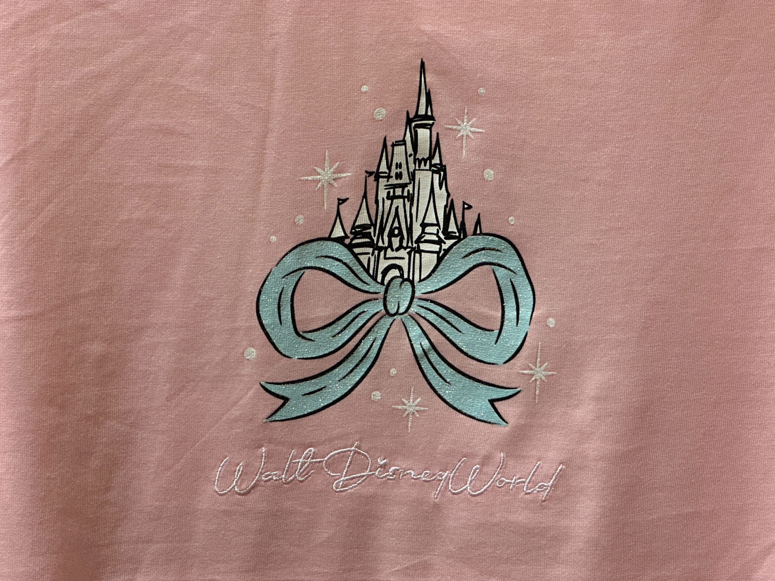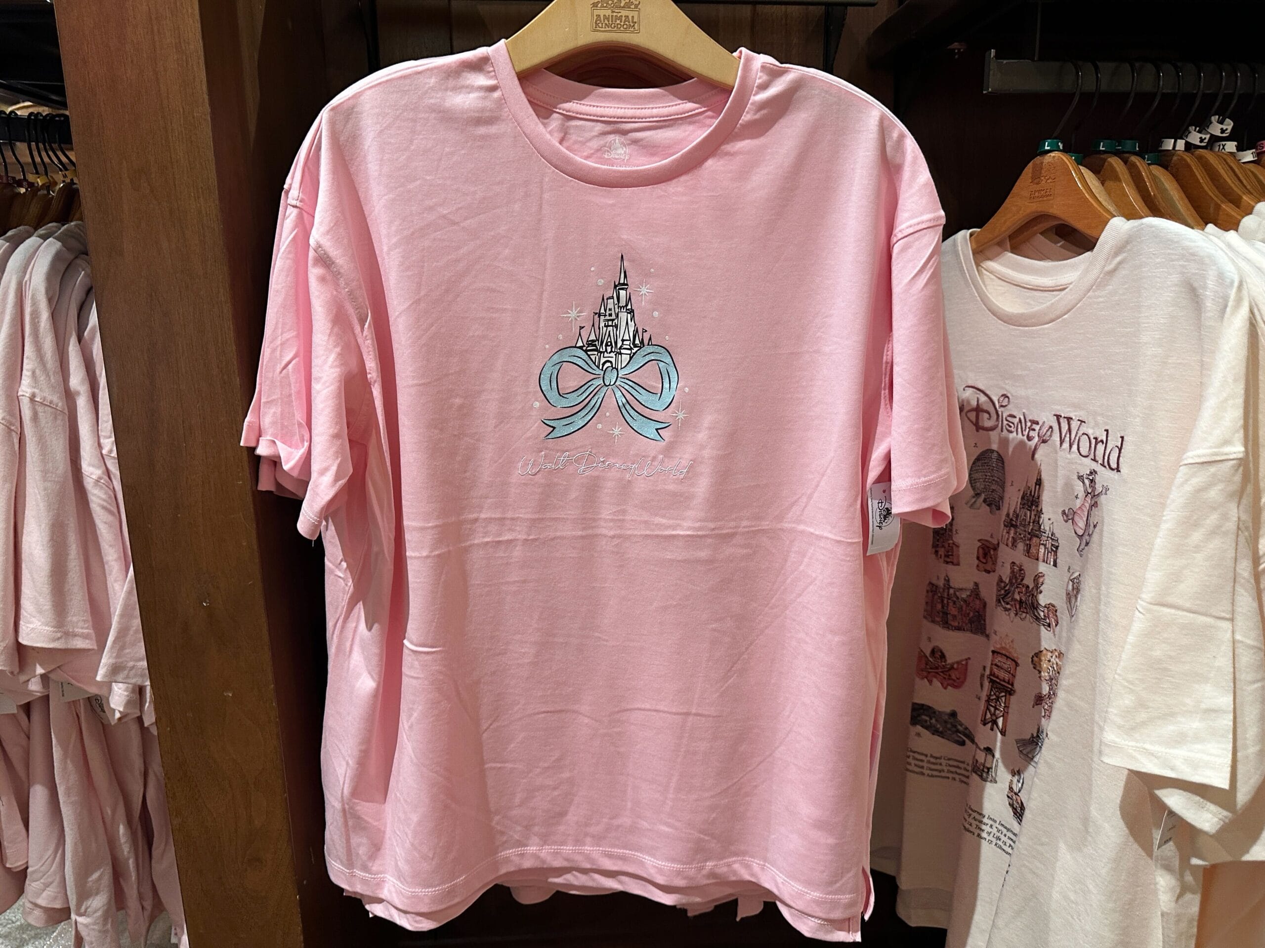 The pink short-sleeve T-shirt has a white image of Cinderella Castle, a pastel blue bow, and “Walt Disney World” embroidered cursive text on the front.