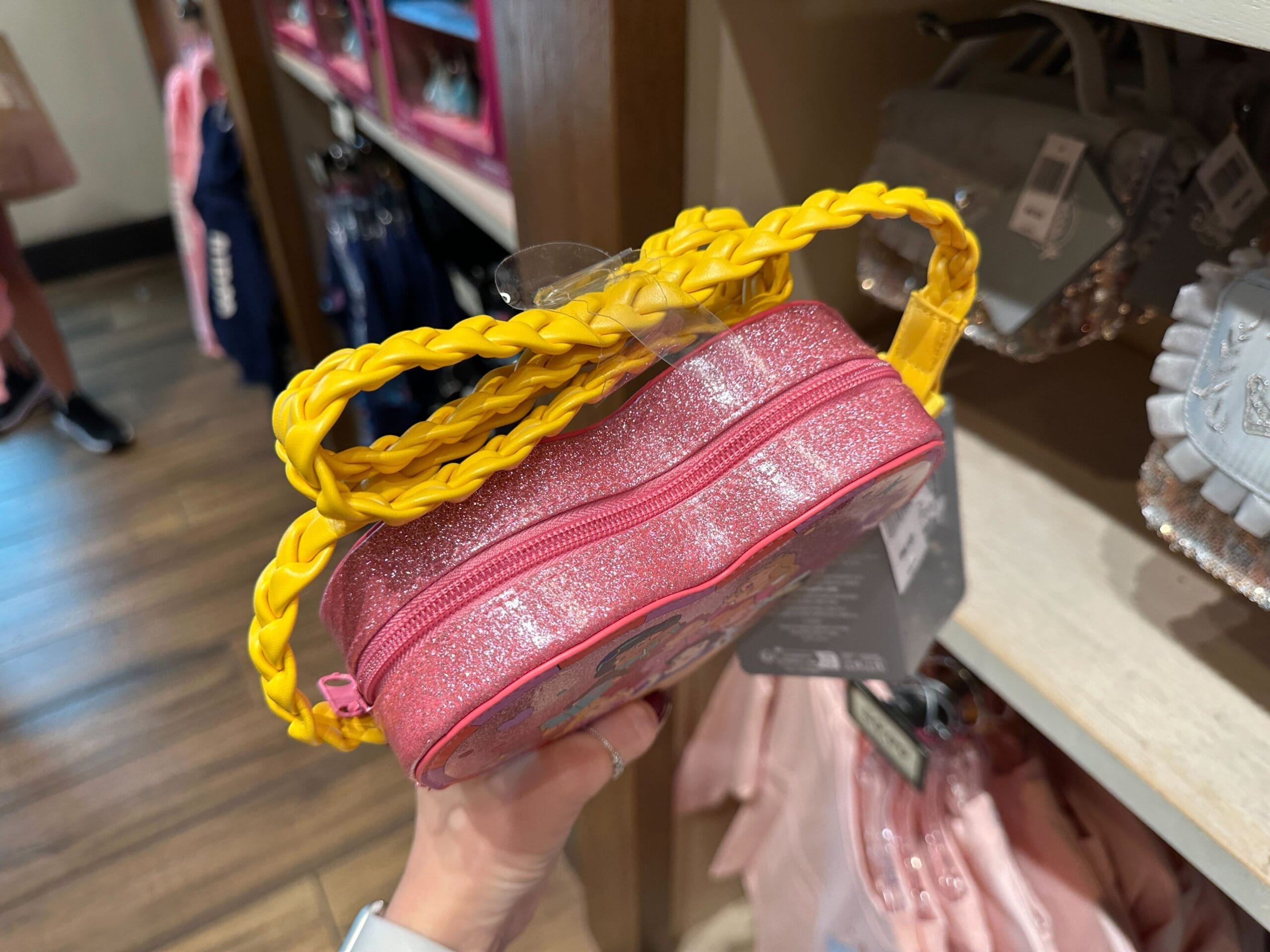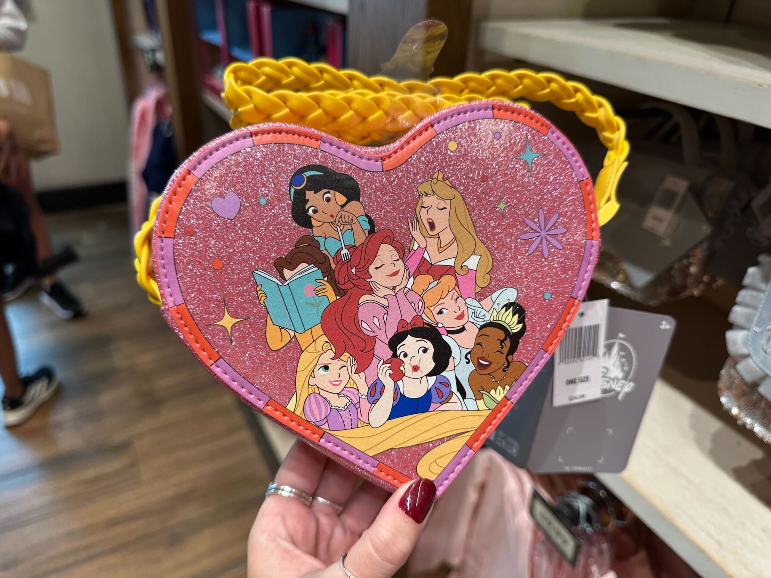 World of Disney in Disney Springs has a glittery pink purse with Belle, Jasmine, Aurora, Ariel, Cinderella, Tiana, Snow White, and Rapunzel making various faces.
