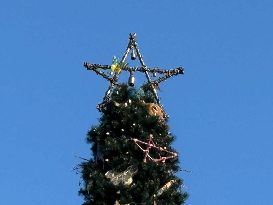 The tree is topped with it’s usual stick star and adorned with golden lights to light at night.