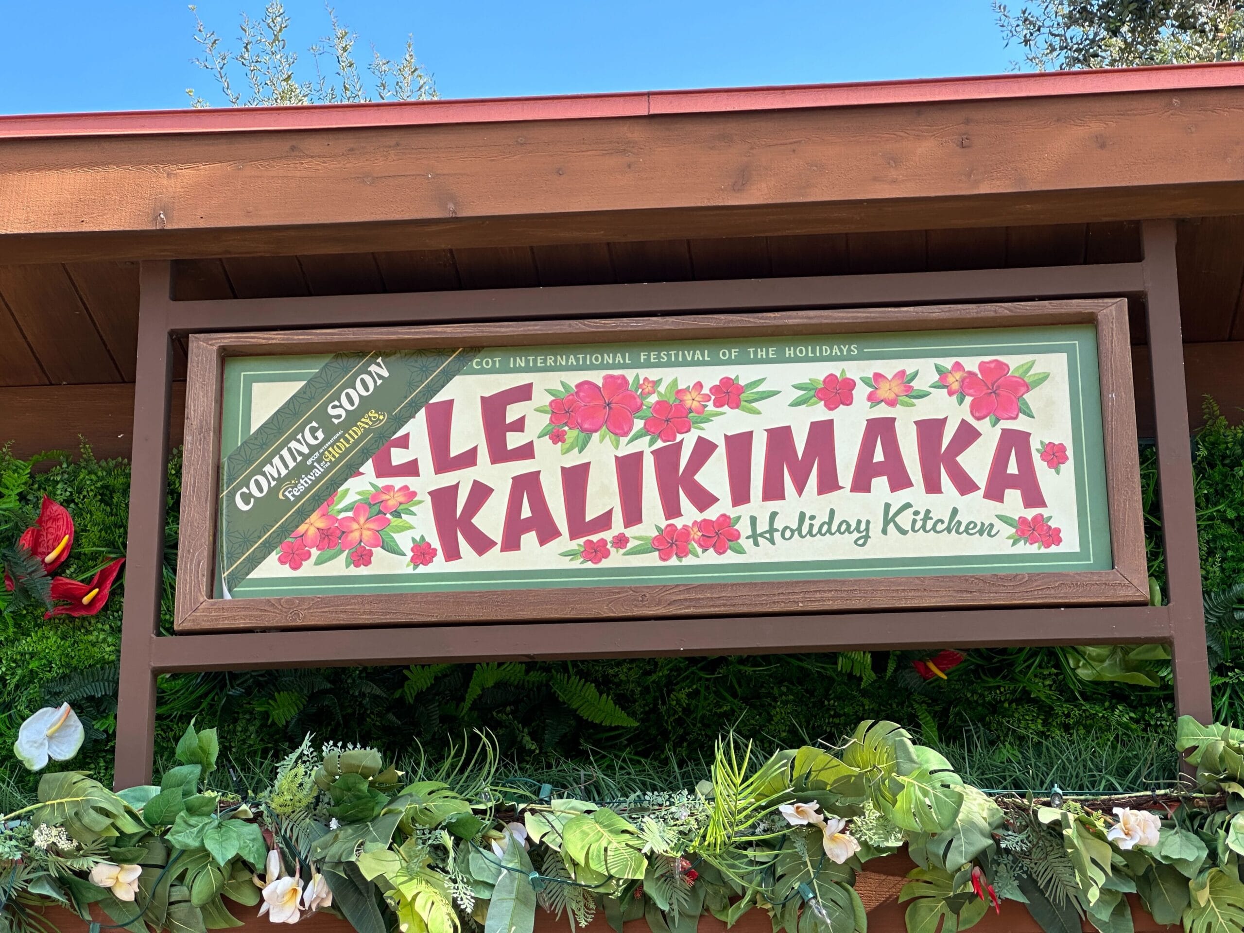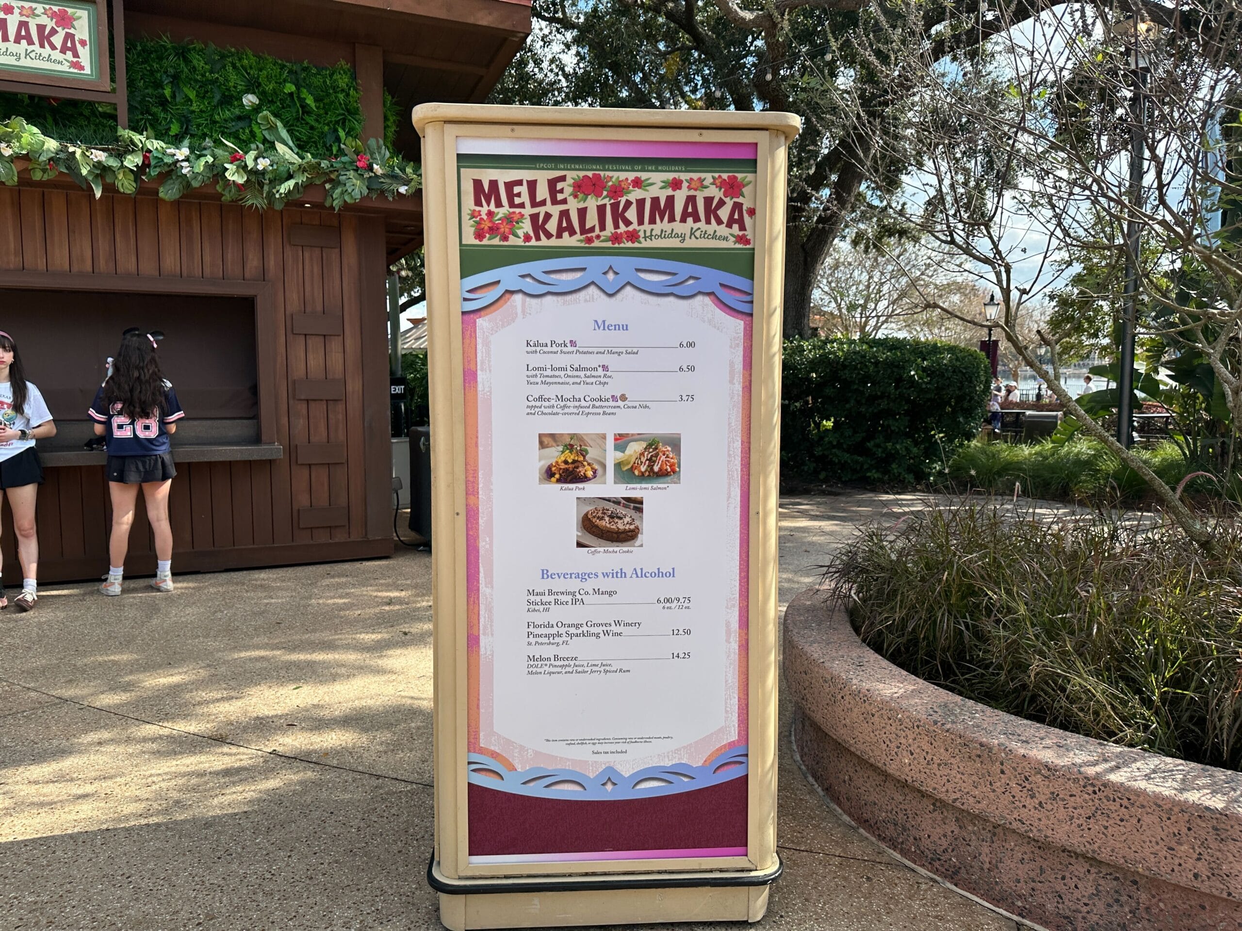 The Mele Kalikimaka Holiday Kitchen, representing Hawaii, is on the pathway between the Canada Pavilion and the Imagination Pavilion. Unlike the other booths, it has a full menu posted.