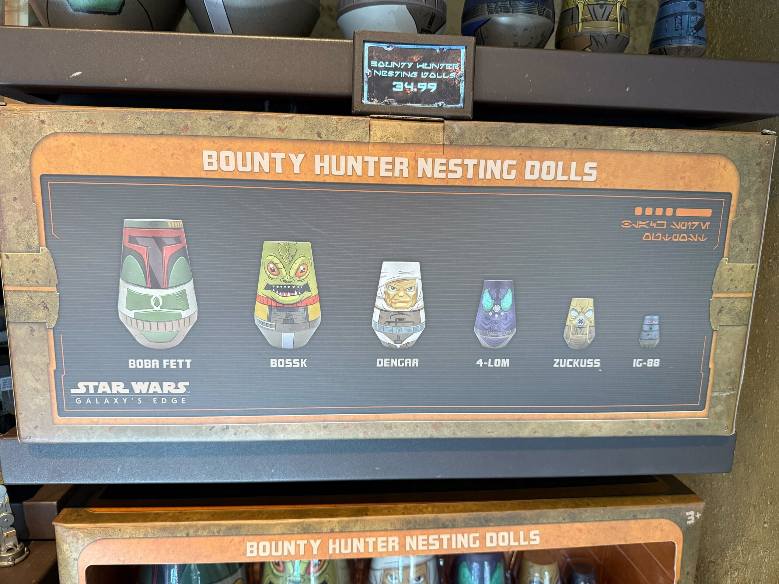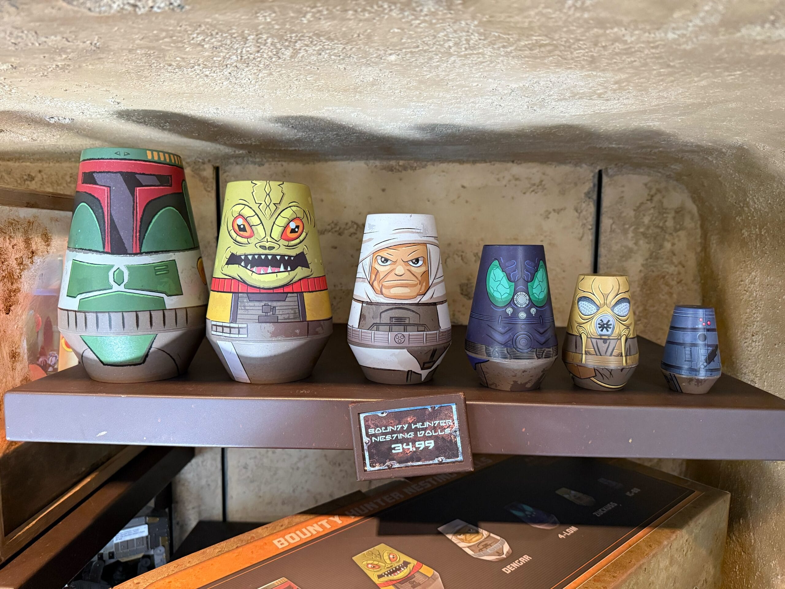 This set includes a series of six nesting dolls, each inspired by a different bounty hunter from the Star Wars series. The largest doll, which holds all the others, is based on Boba Fett and his green armor.