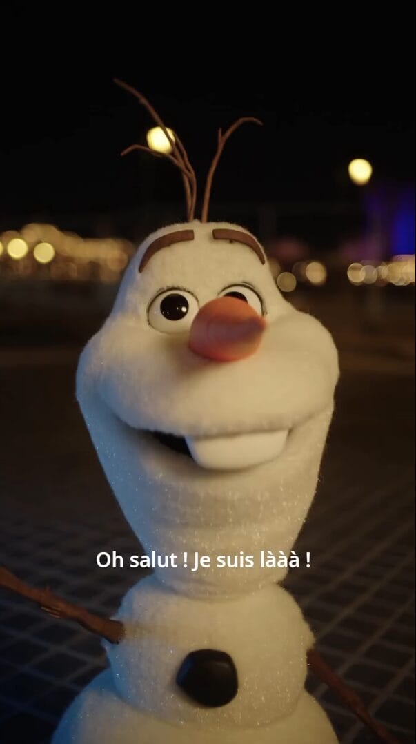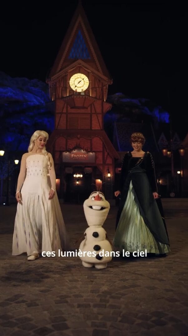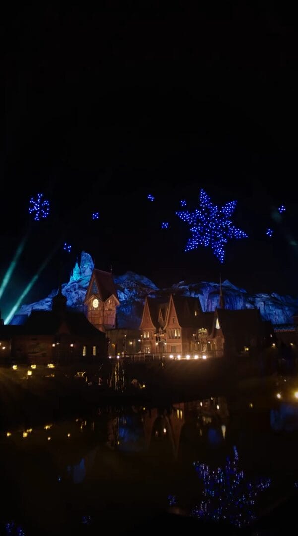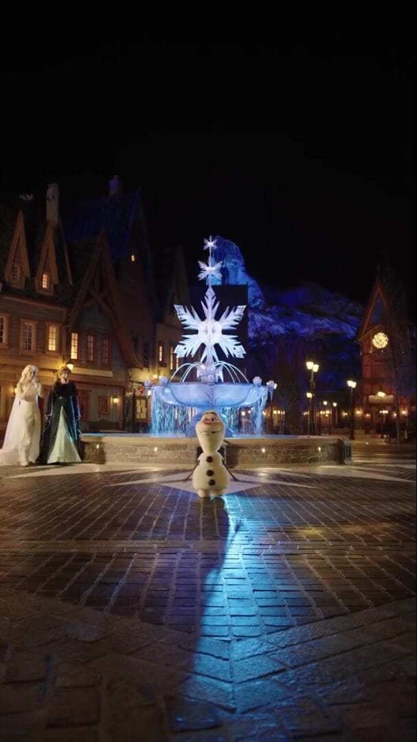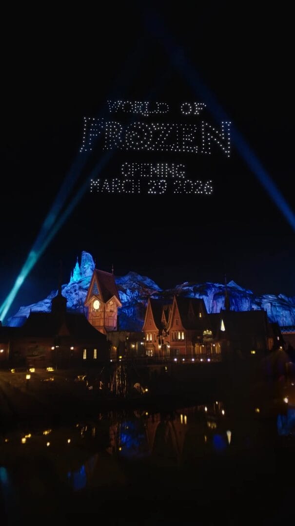 In the video, we see the Elsa and Anna meeting Olaf in front of a snowflake fountain. Elsa then uses her “magic” (drones) to create swirls, snowflakes, and the opening date of March 29, 2026, in the night sky.