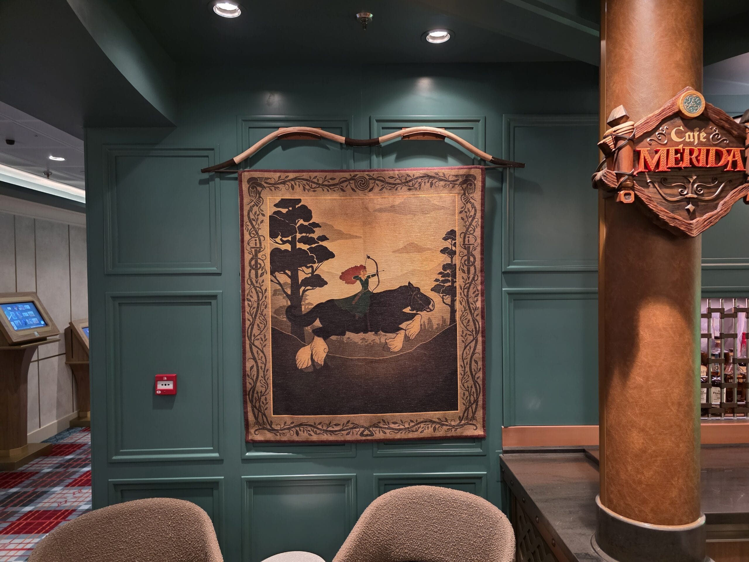 The wall on the left side of the café has a large tapestry-like piece of artwork with Merida riding her horse, Angus. There is a bow above the artwork to match the bow she holds in the painting.