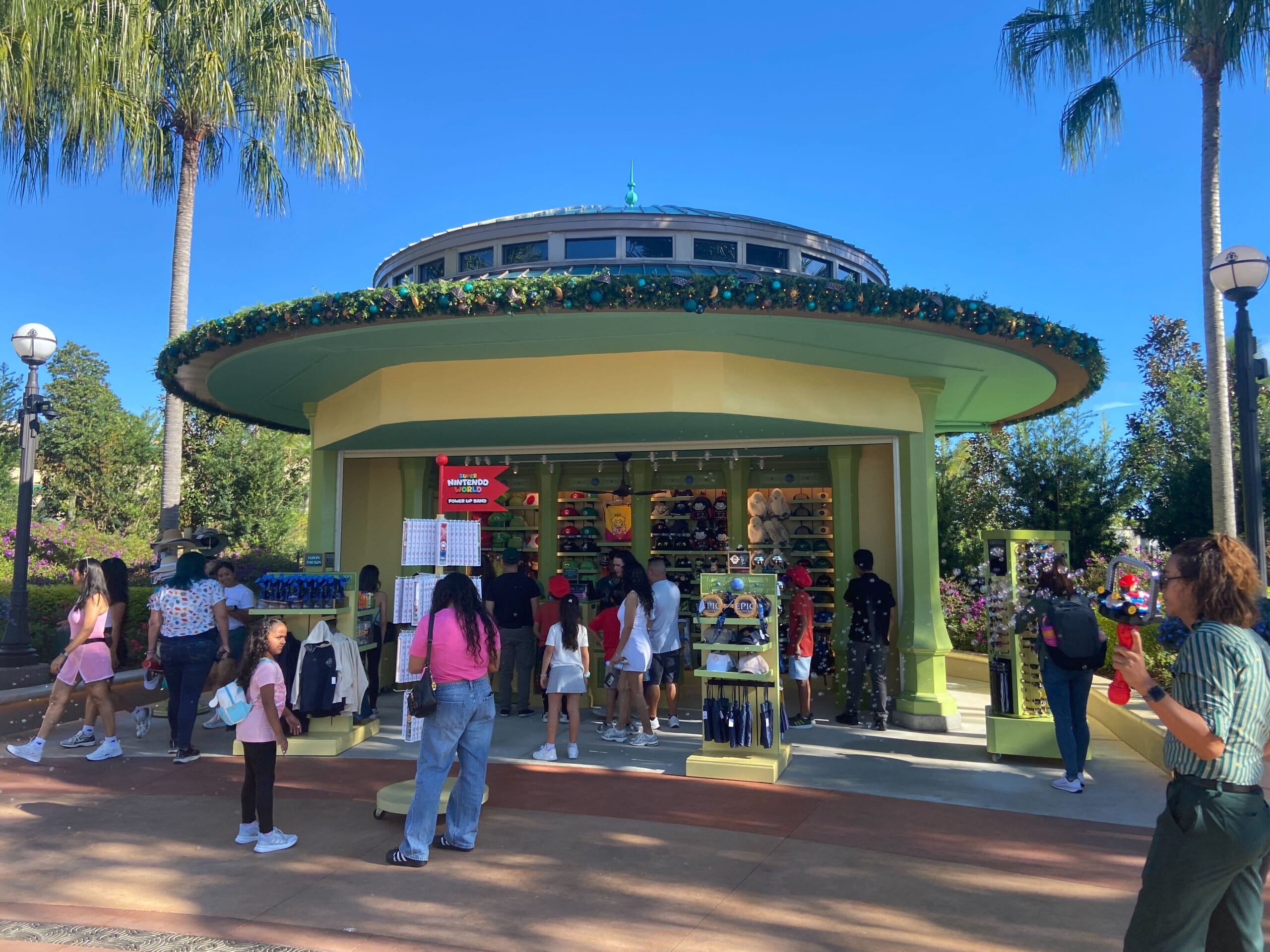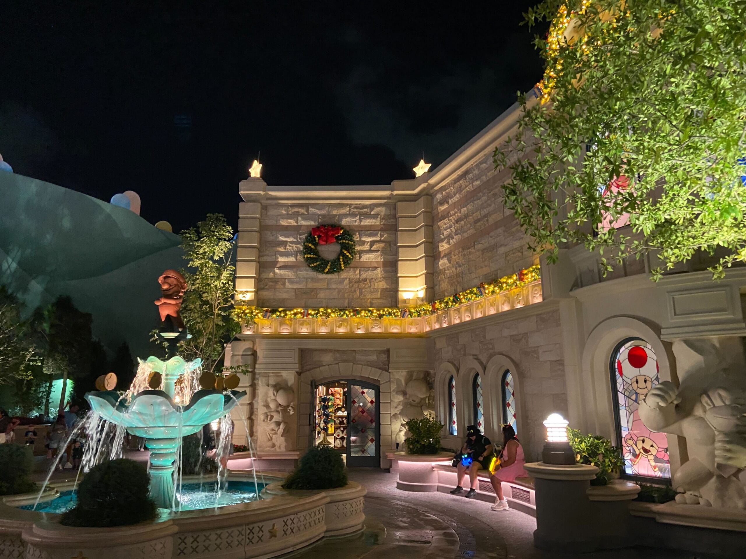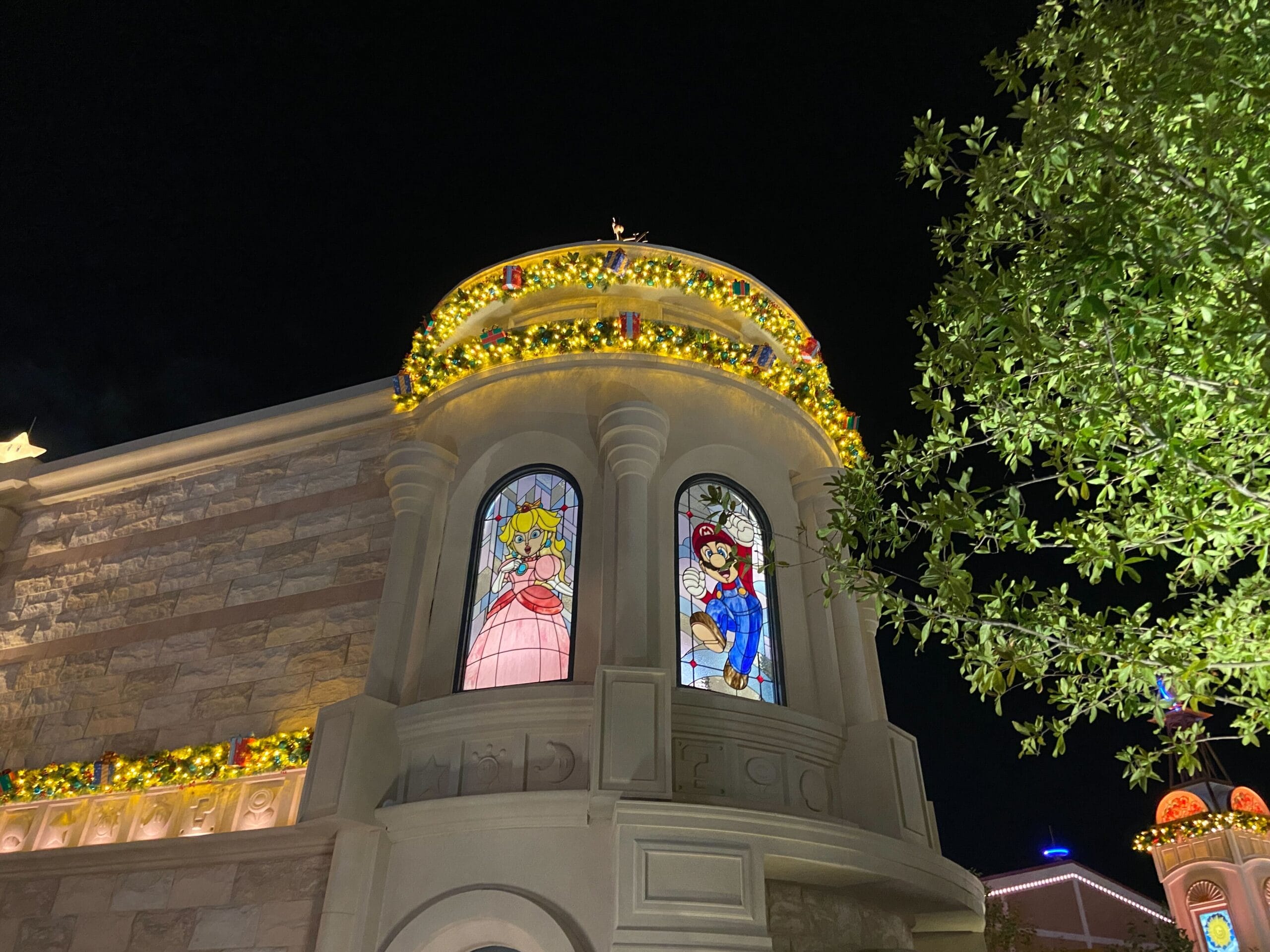 Located just outside the portal to Super Nintendo World in Celestial Park, the Nintendo Super Star Store exterior facade has been decorated with garland and a large wreath.