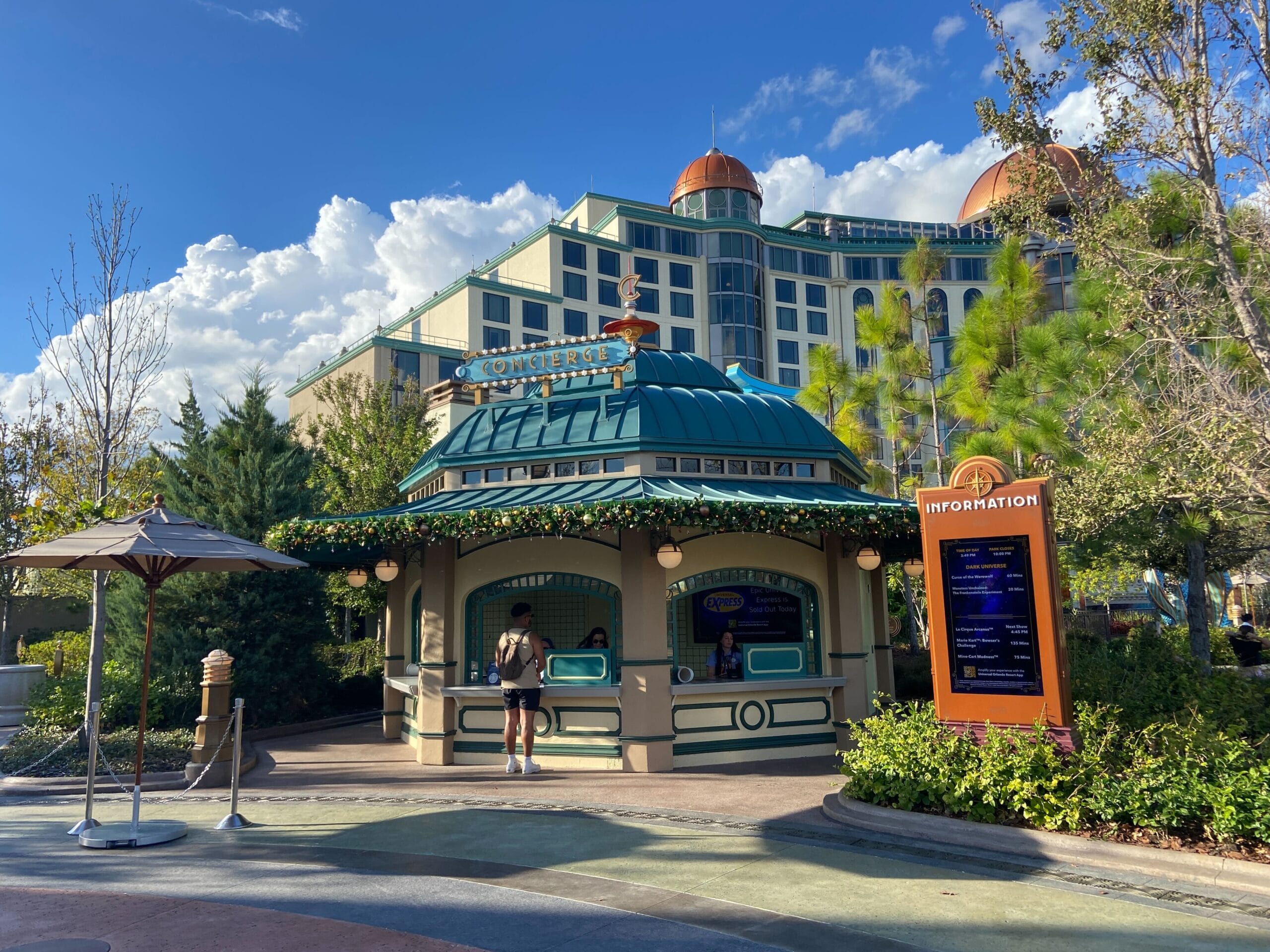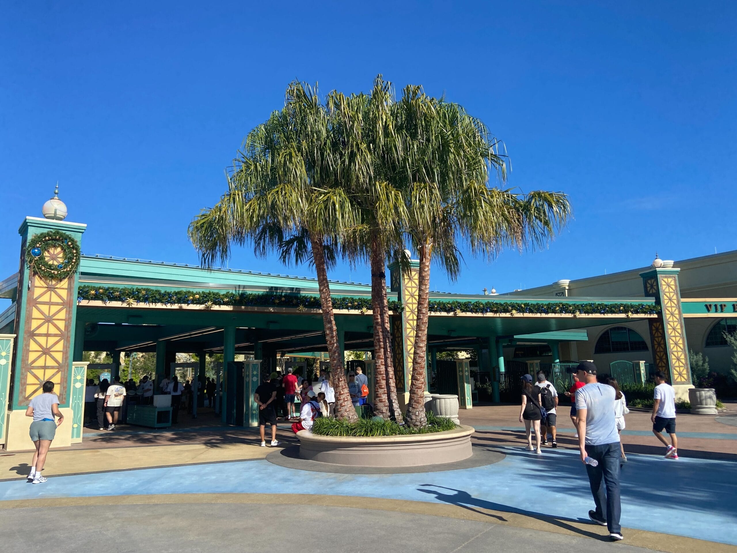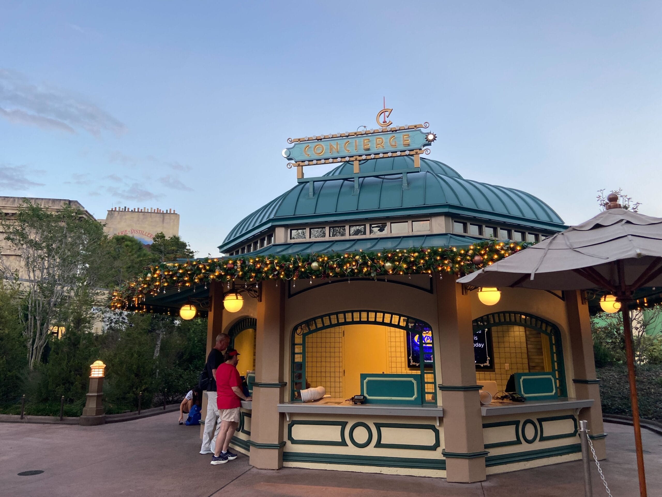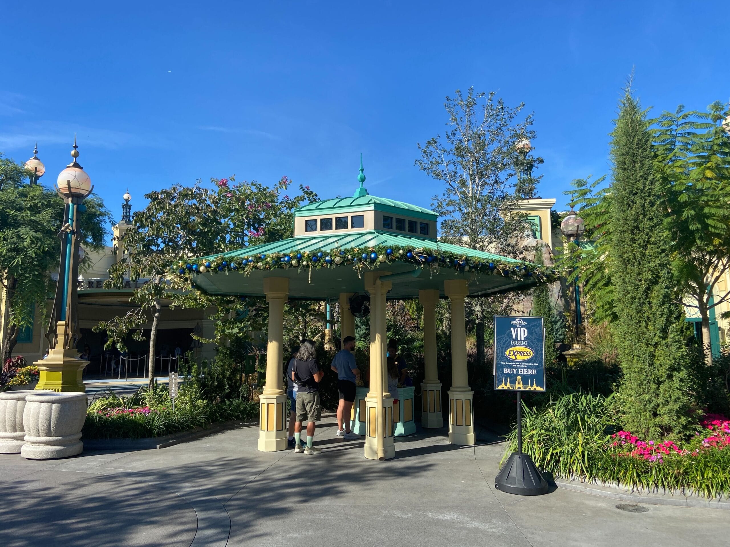 The check-in kiosk for Epic Universe VIP tours is also decorated with themed garland.