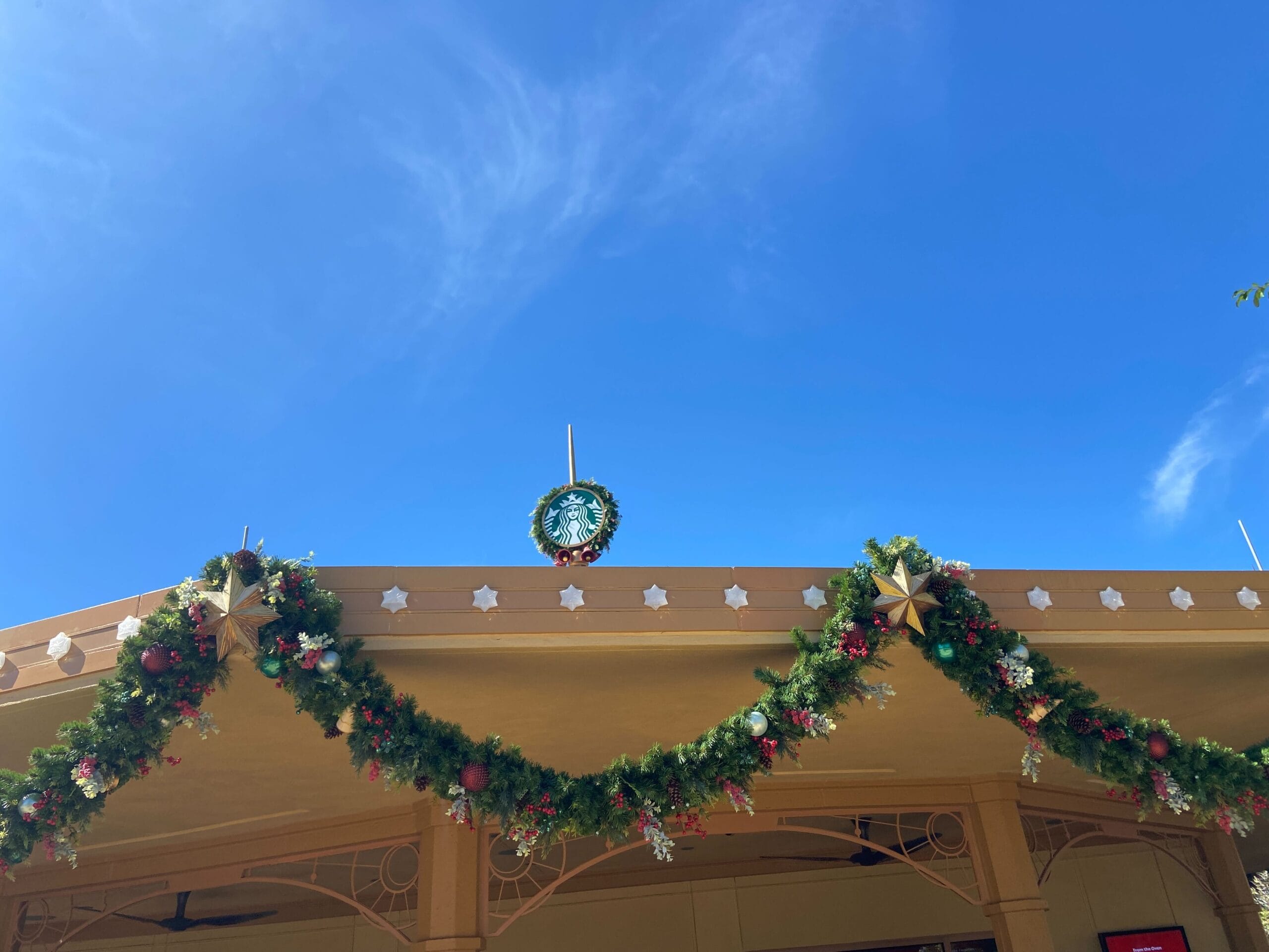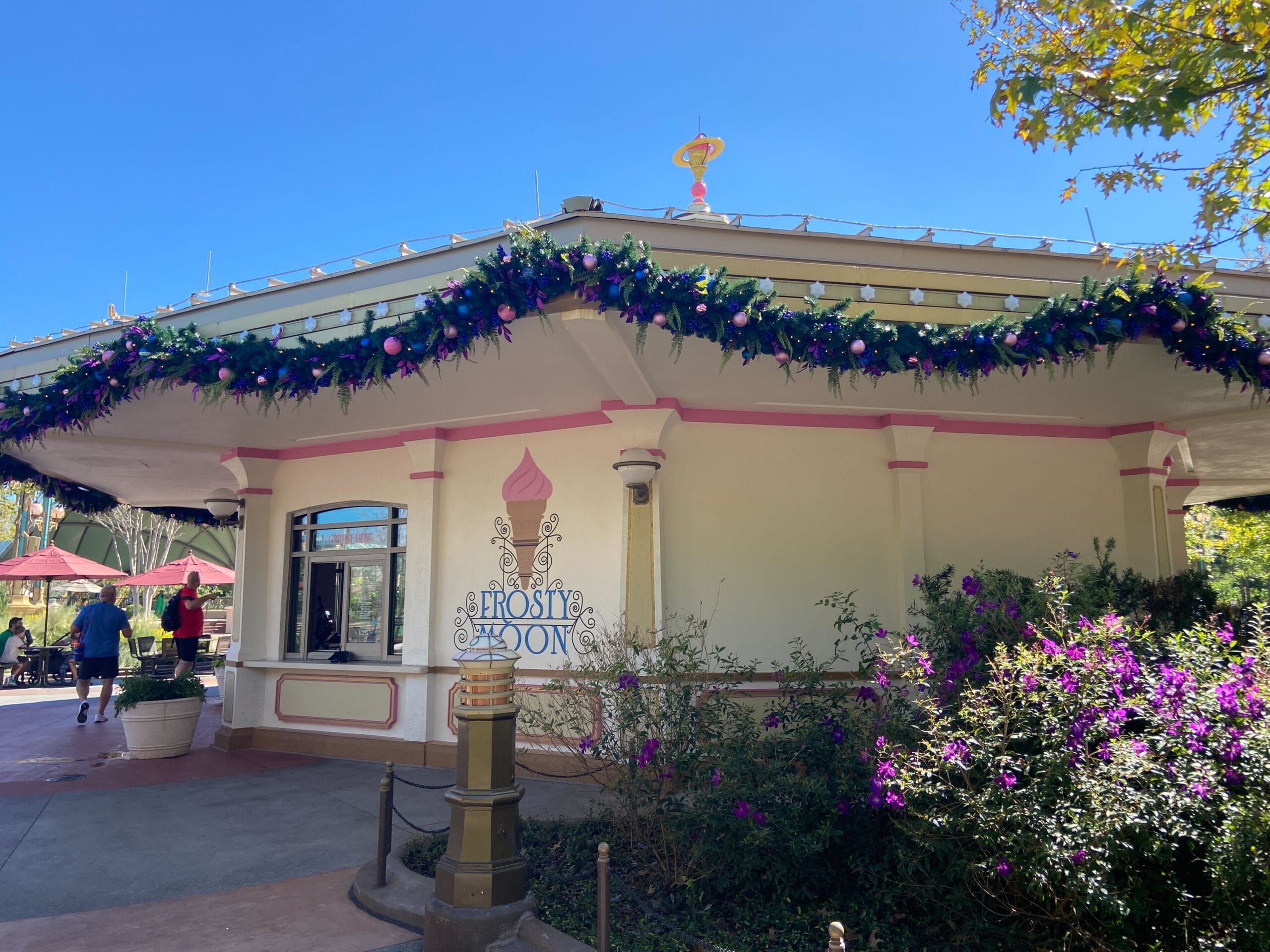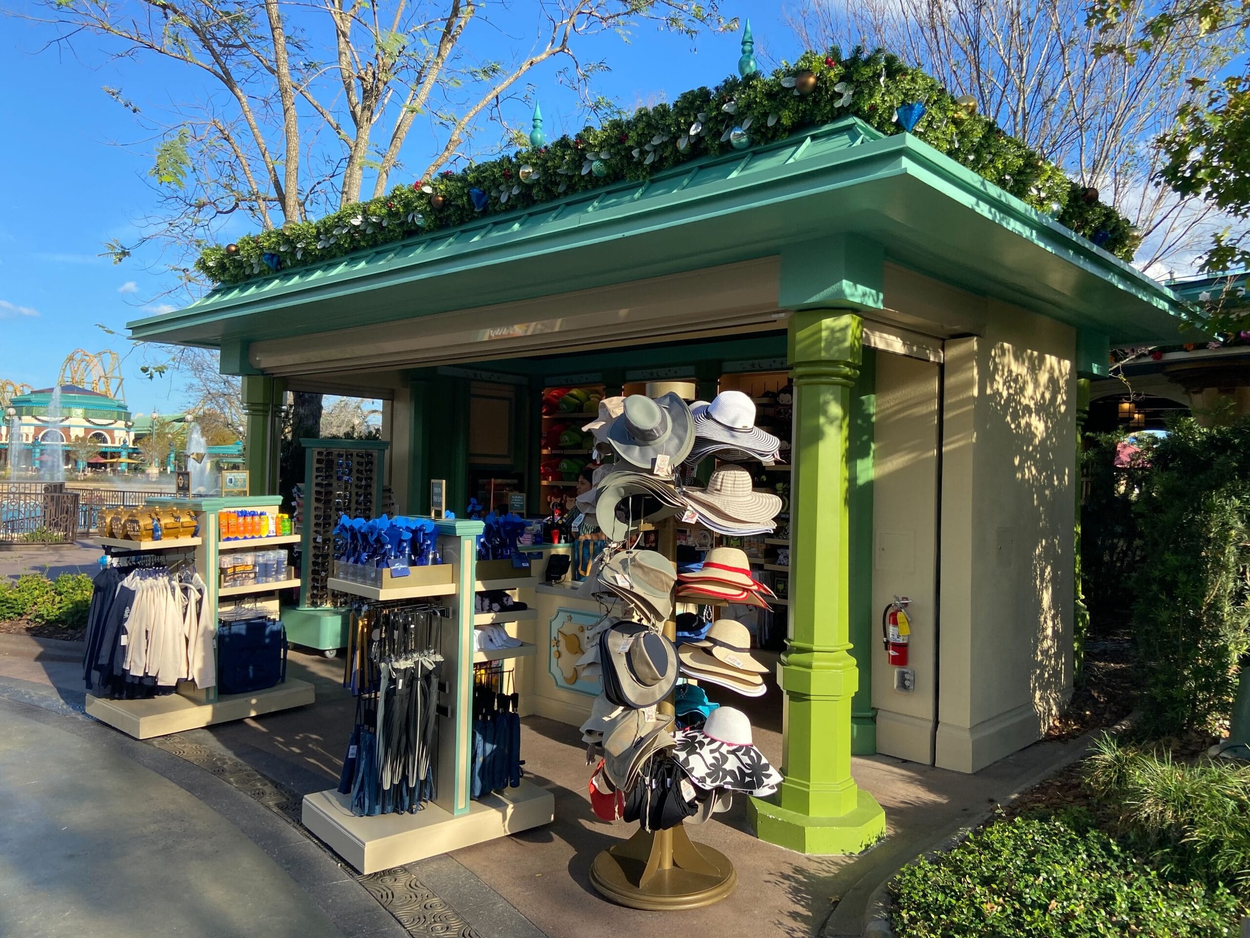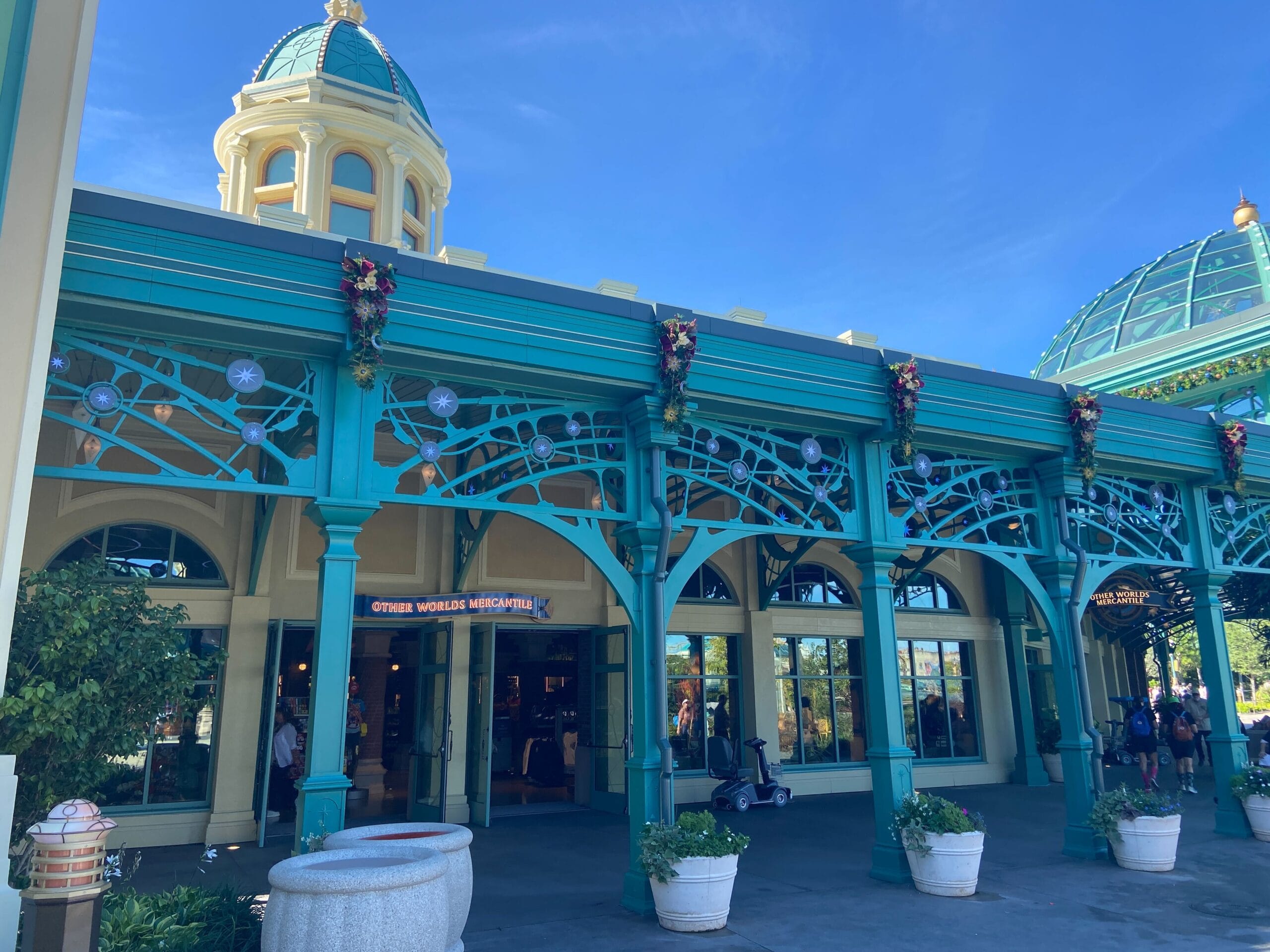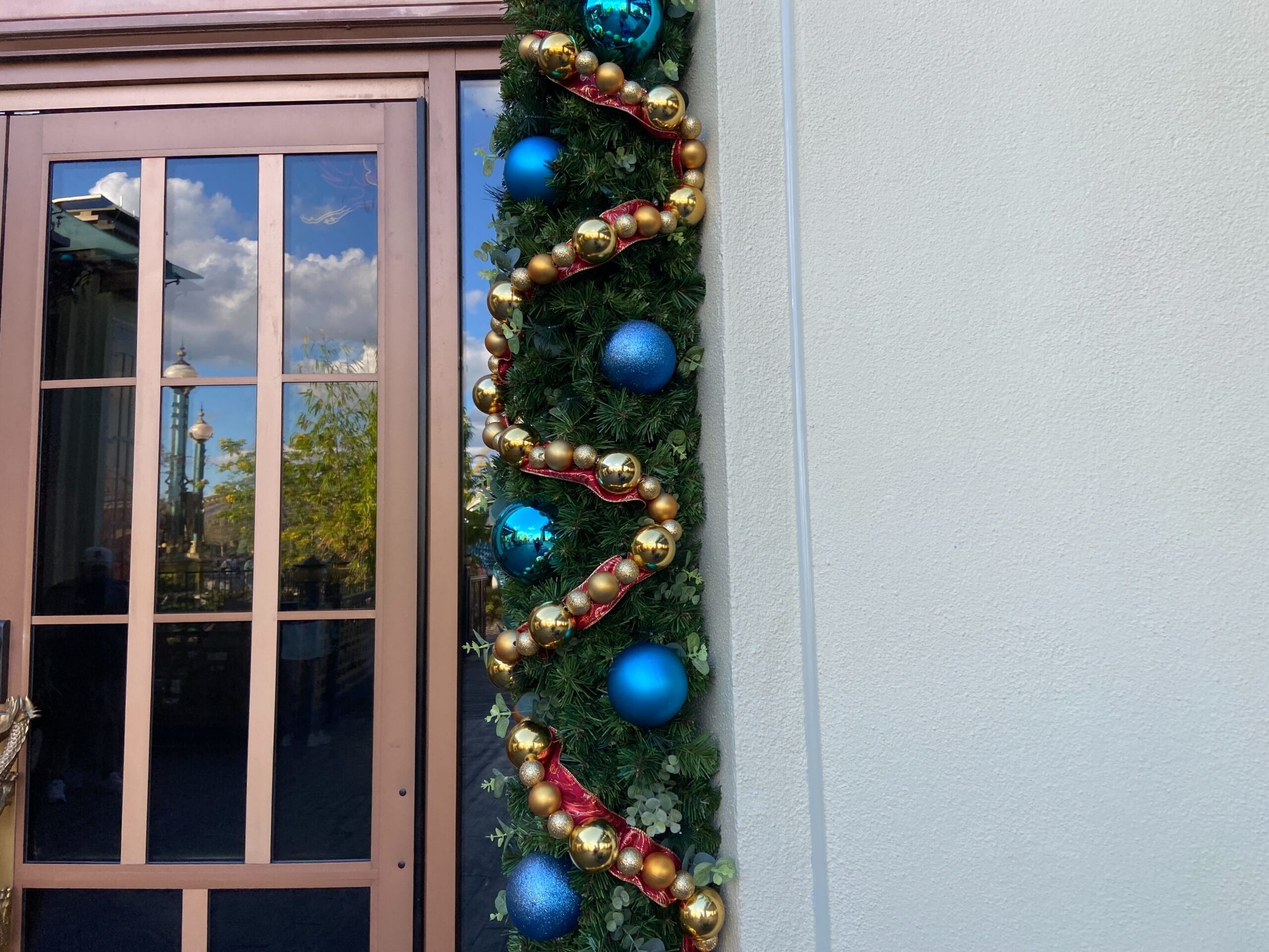 Inside the park, the exteriors of Other Worlds Mercantile and other merchandise locations now have garland and holiday teardrop swags.