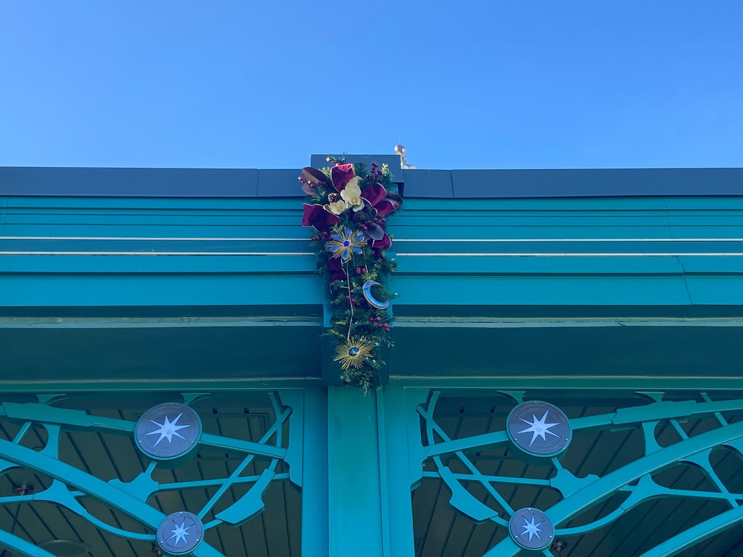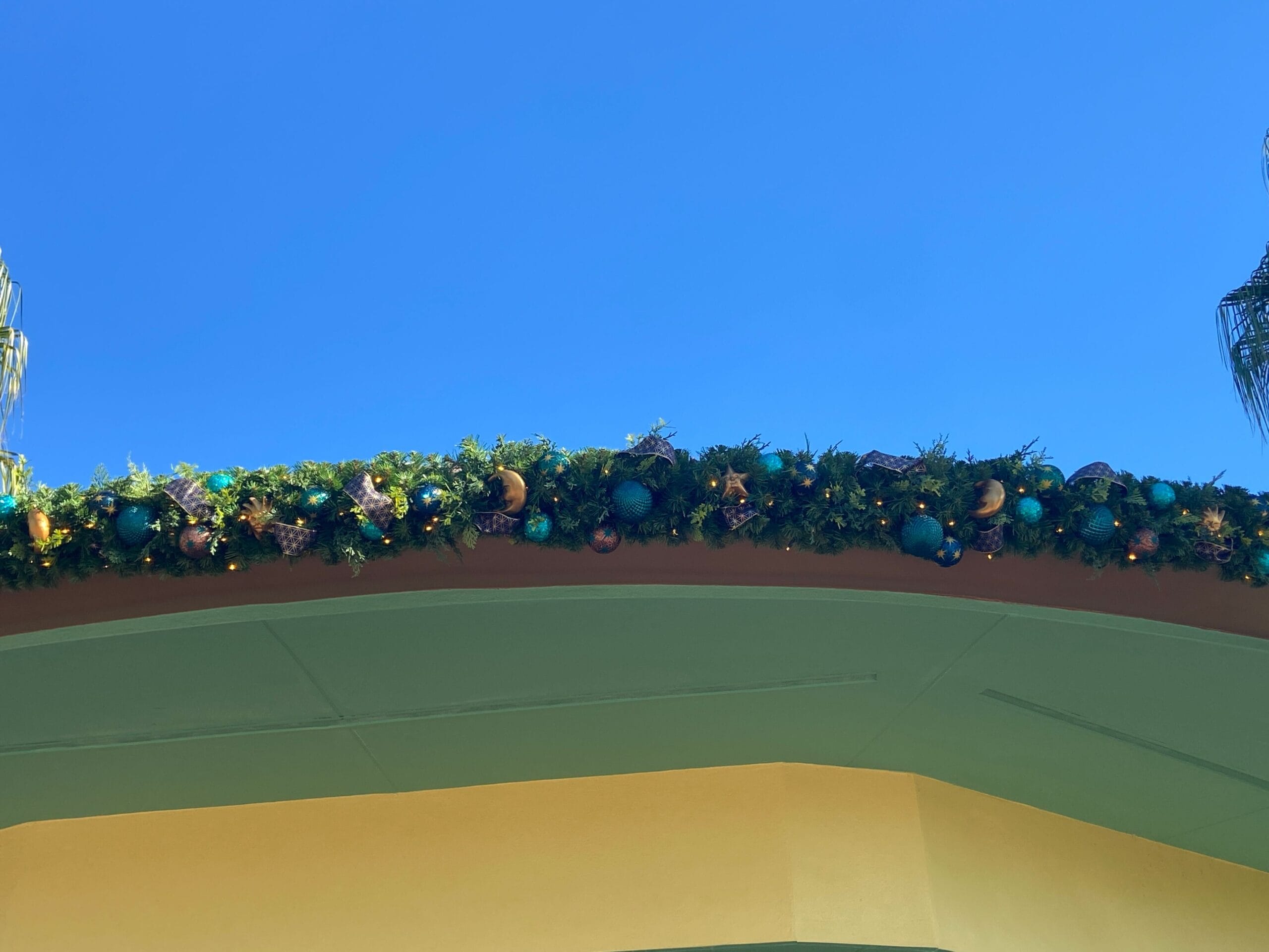 The small gift kiosk located on the walkway from the parking lot to the entry gates has received garland around the roofline. Colorful, celestial-themed baubles decorate the garland.
