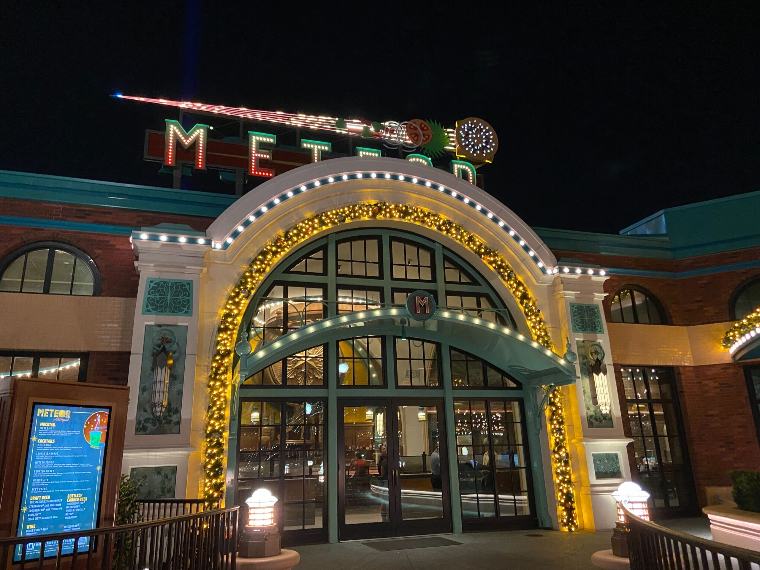 The outdoor Meteor Astropub seating area blends in with the architecture of Celestial Park and the holiday decorations around the park. Lights typically hang from the ceiling, but garland has now been added to the roofline.