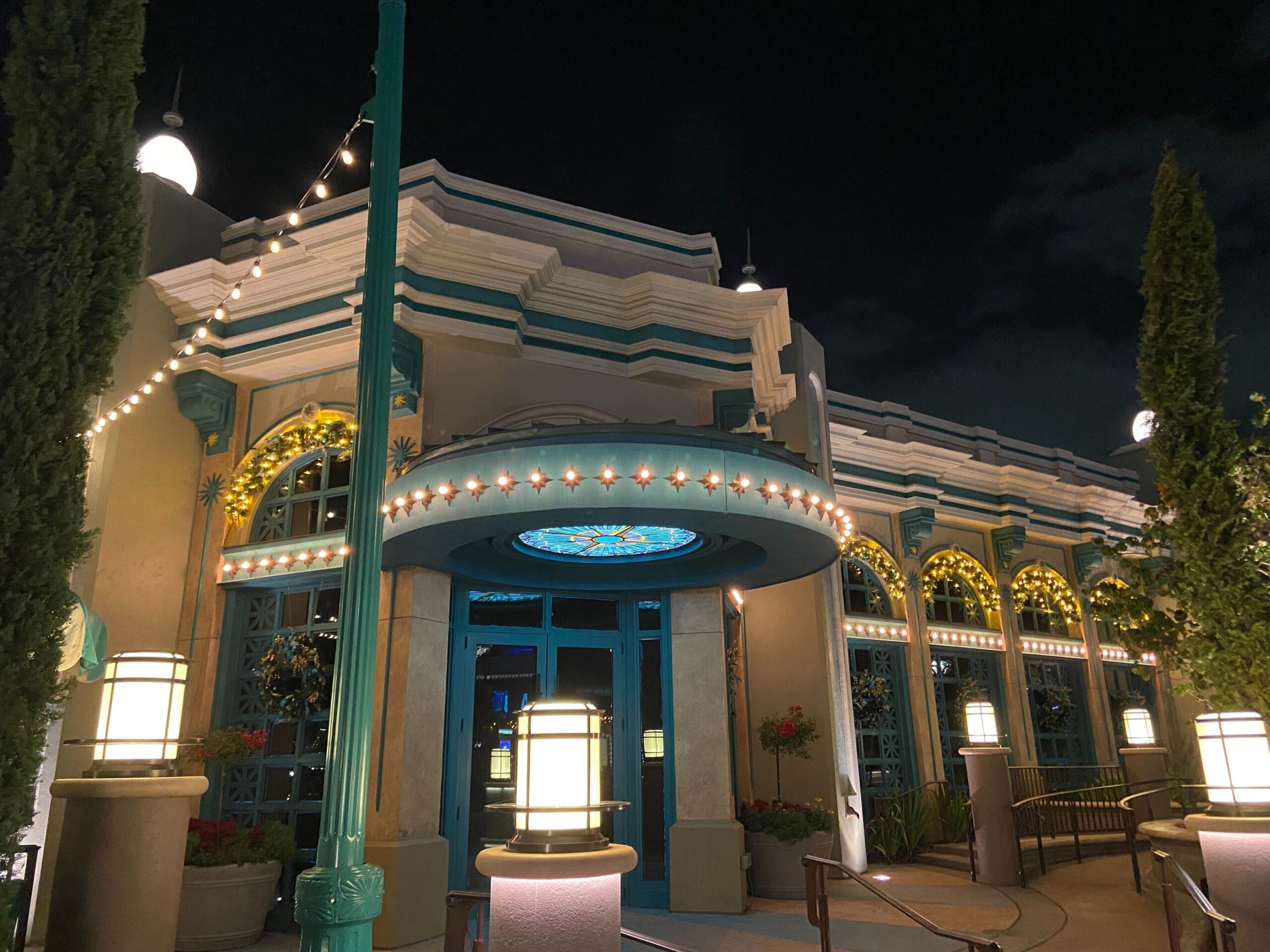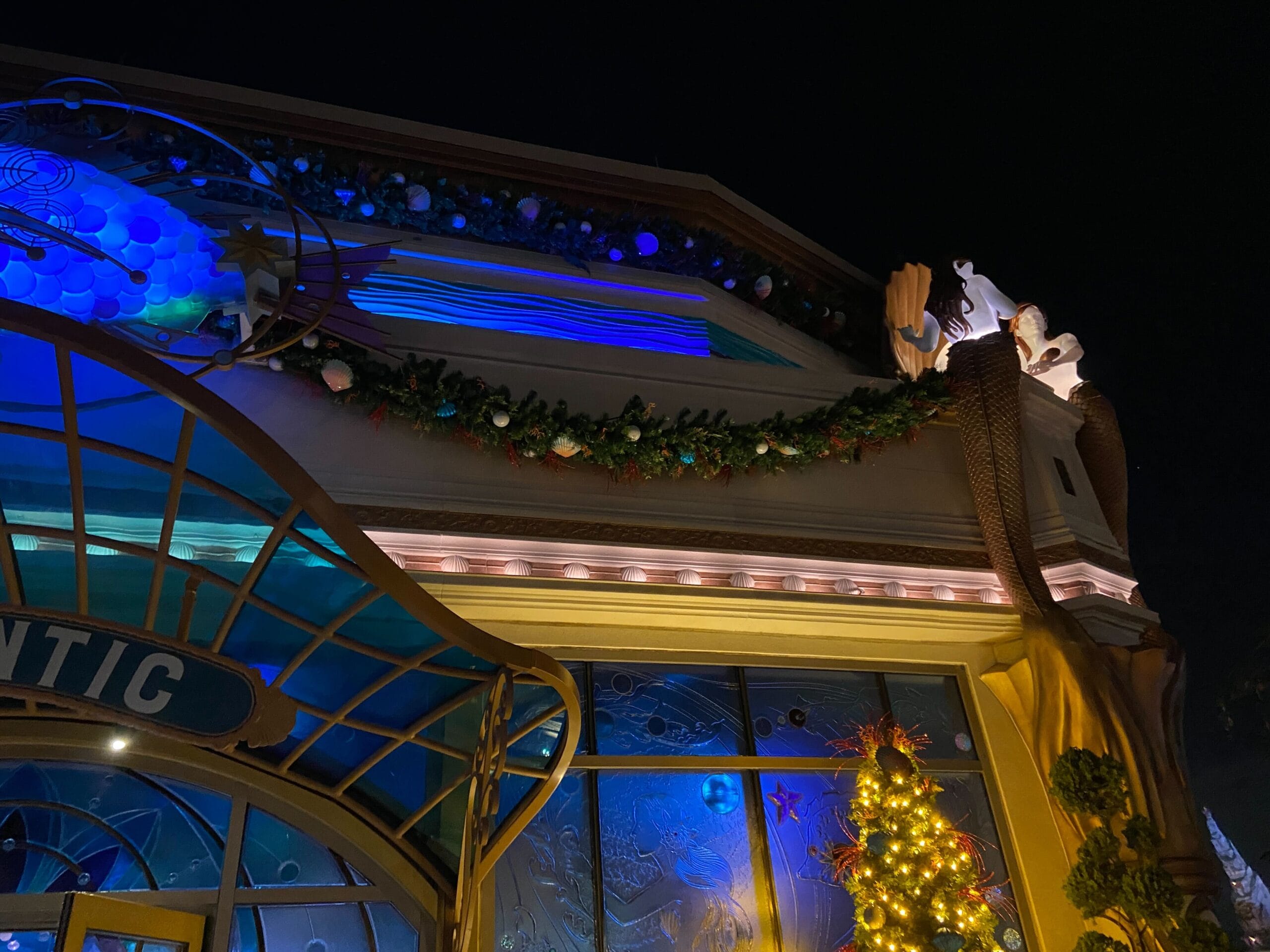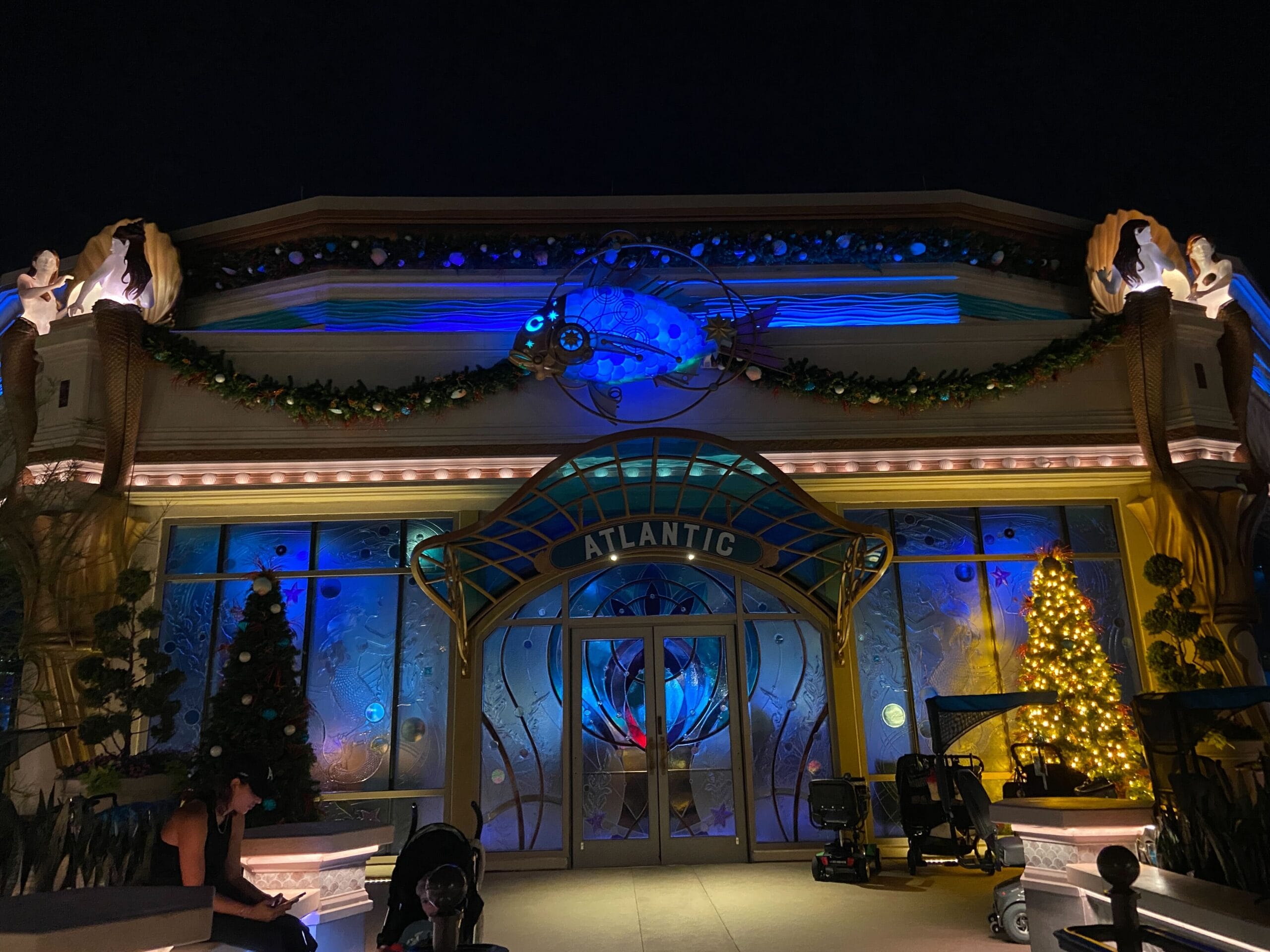 The exterior facade of Atlantic, a table-service restaurant in Celestial Park, features multiple stories of glass windows, surrounded by fountains in the Neptune pool. Themed garland and full-sized trees have been added just outside the main entrance.