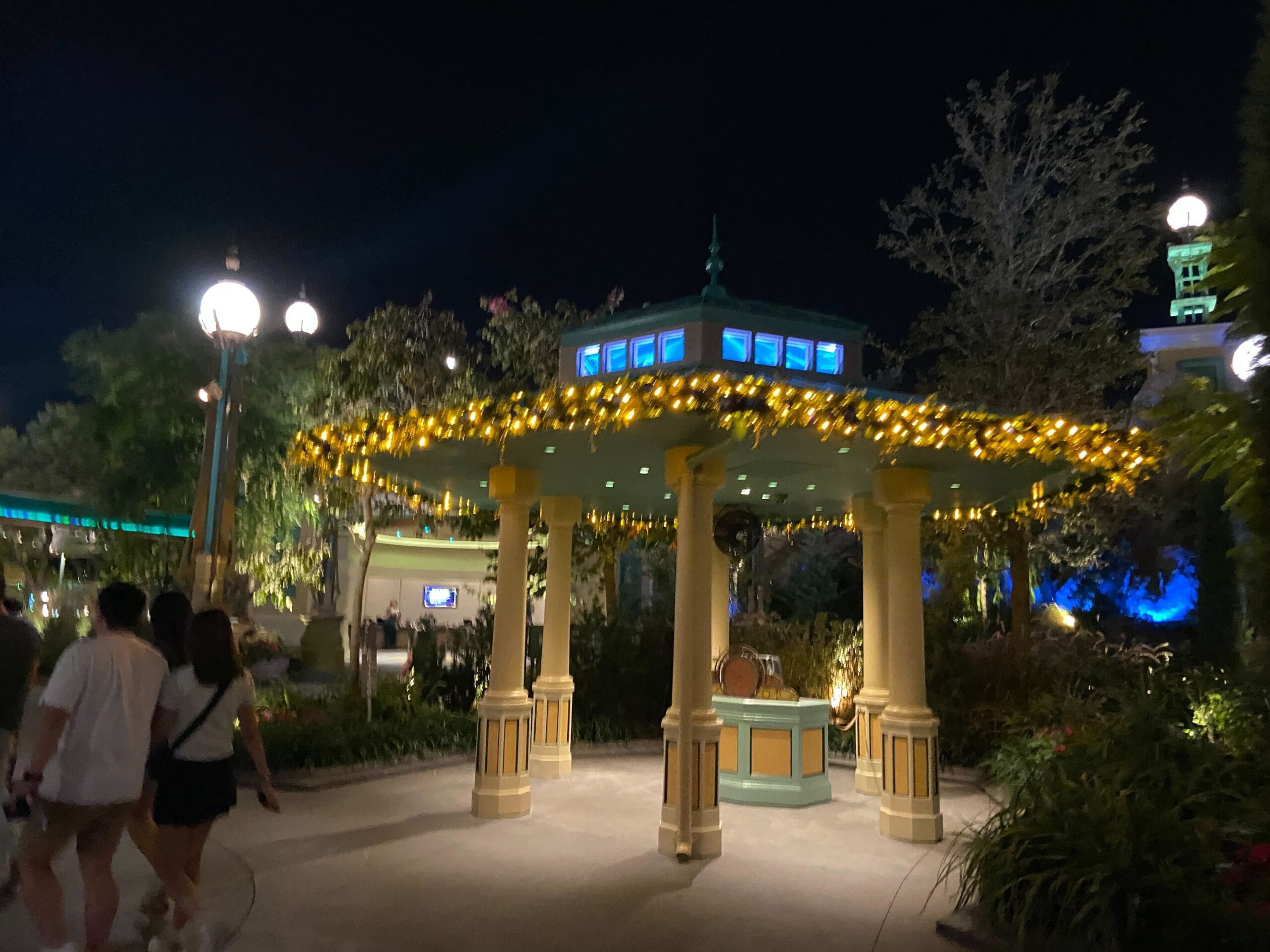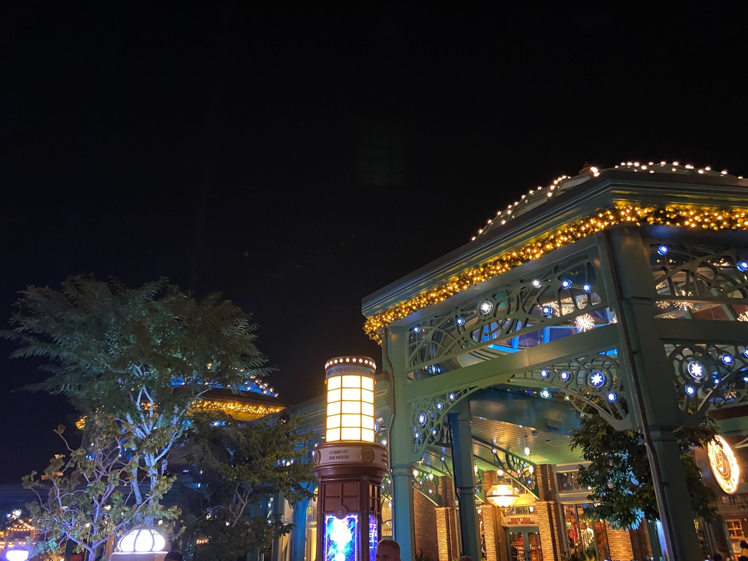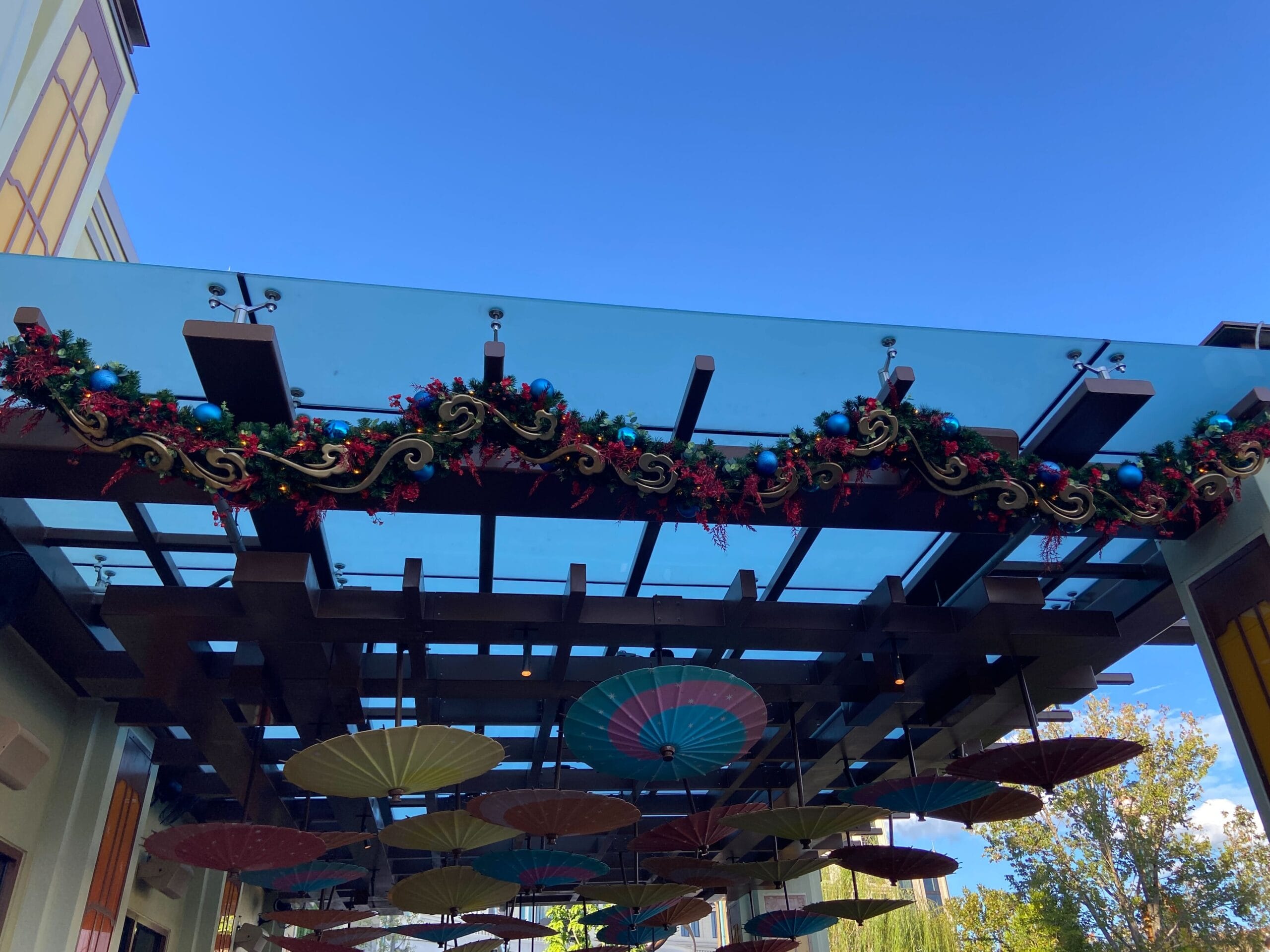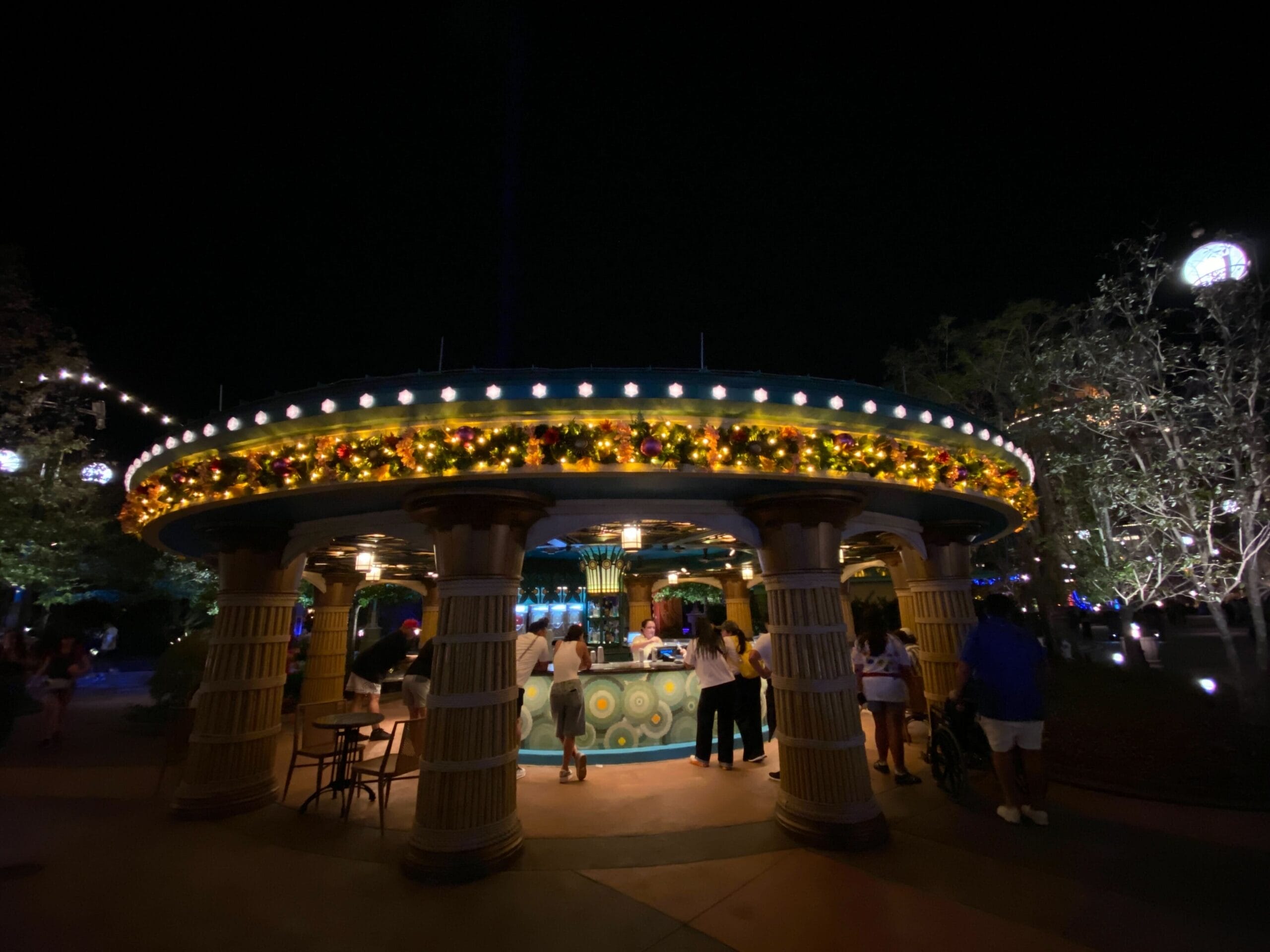 Moving further into Celestial Park, the many snack and beverage kiosks have been wrapped with garland along the rooflines.