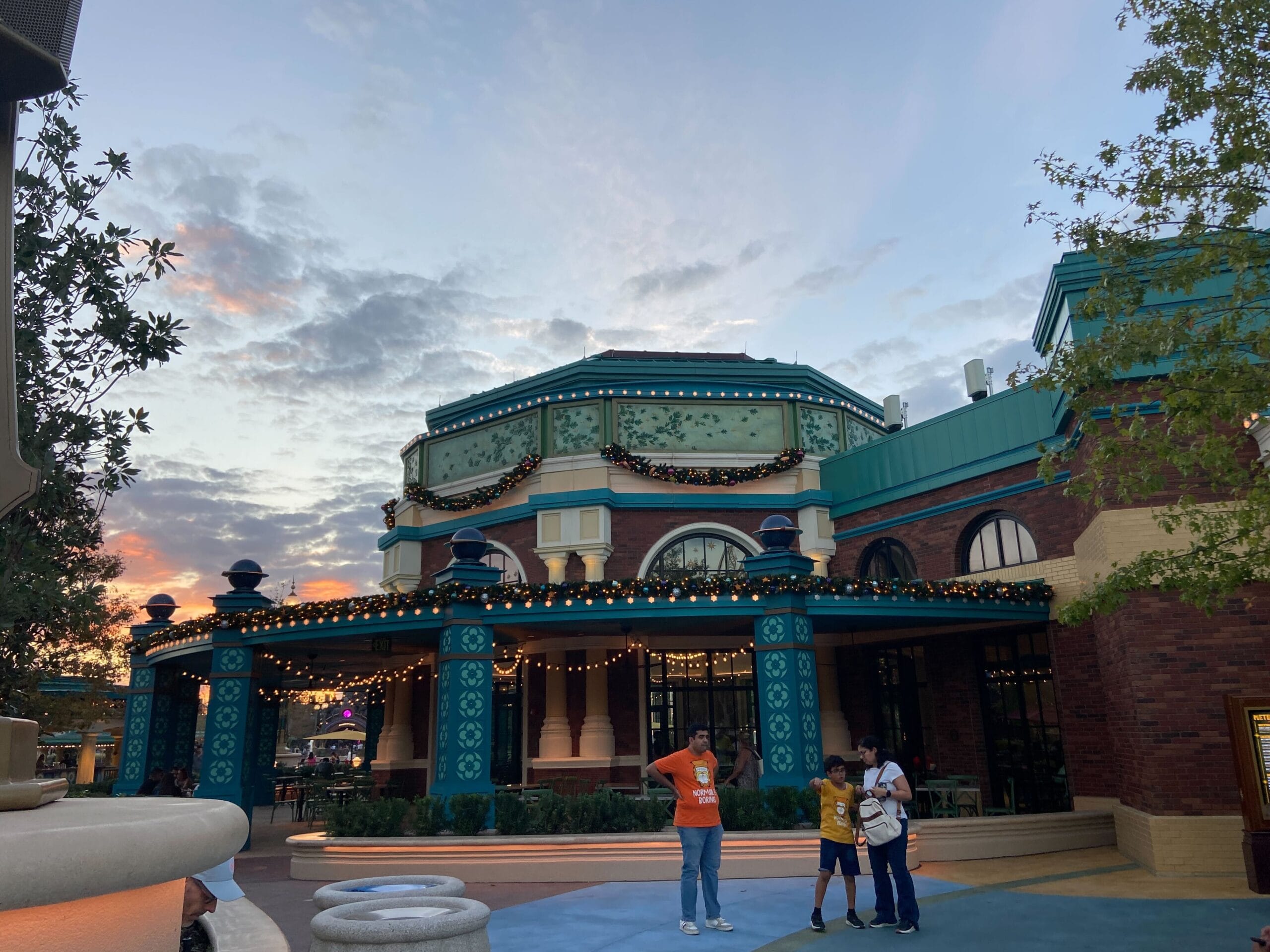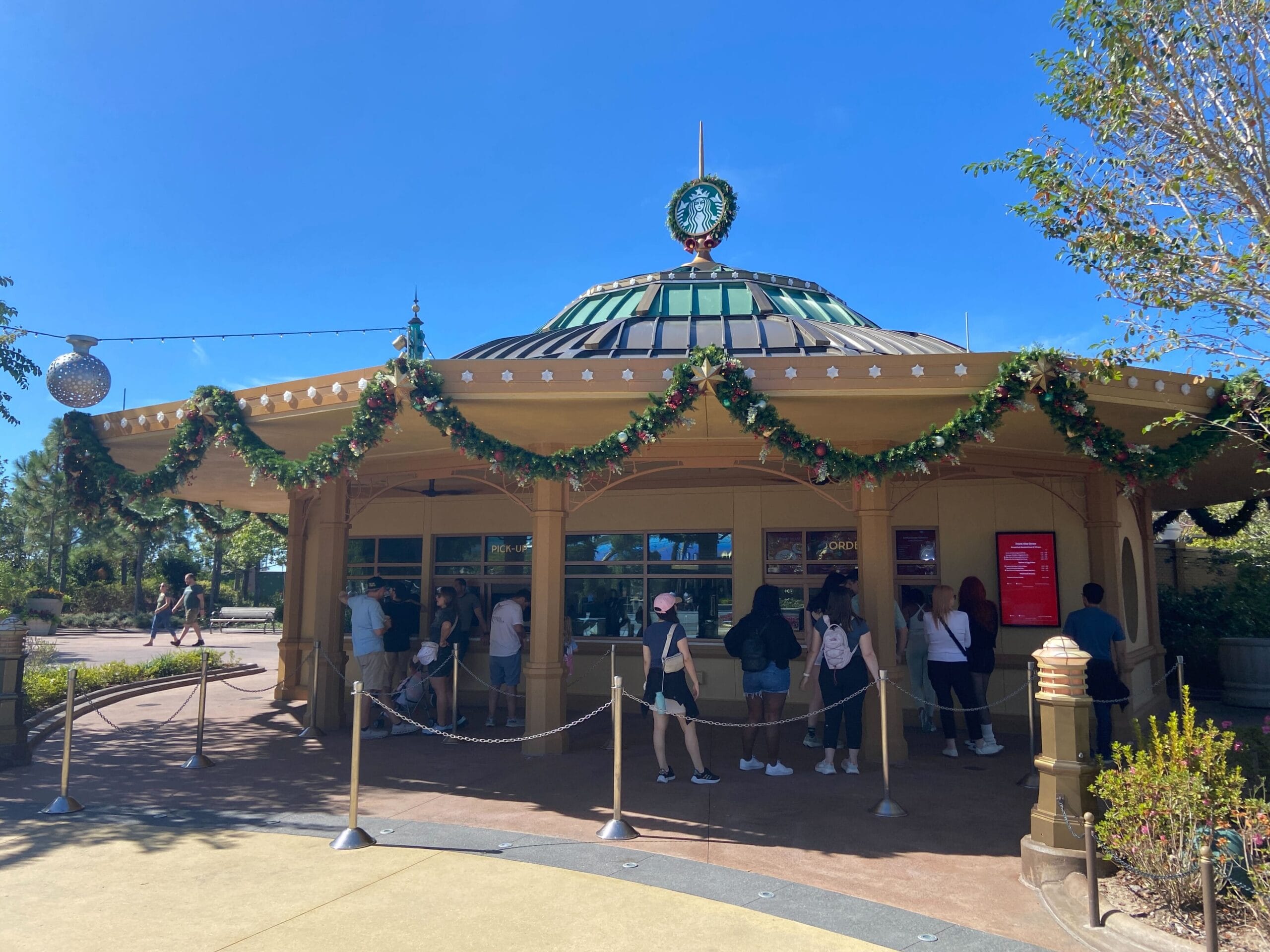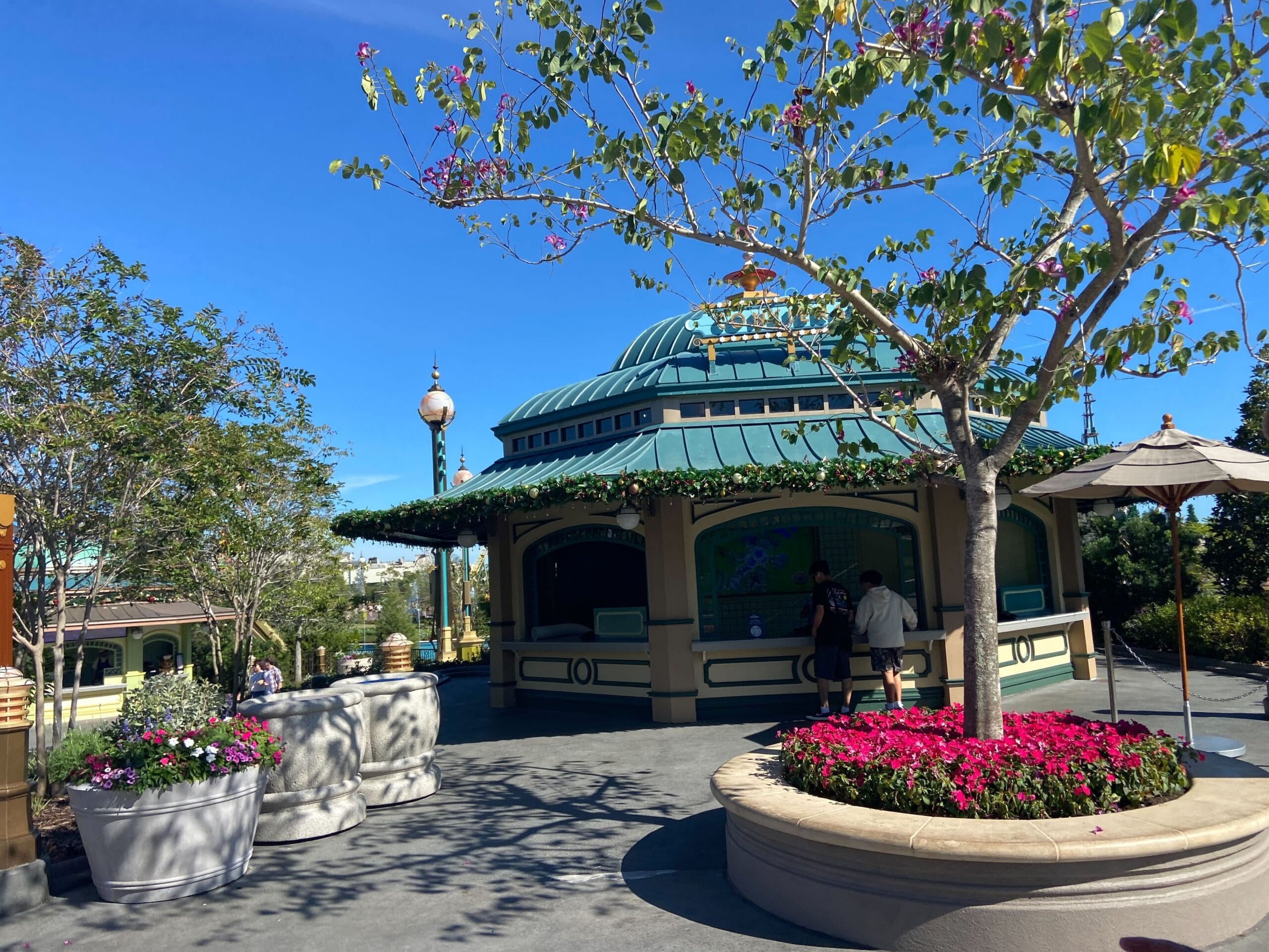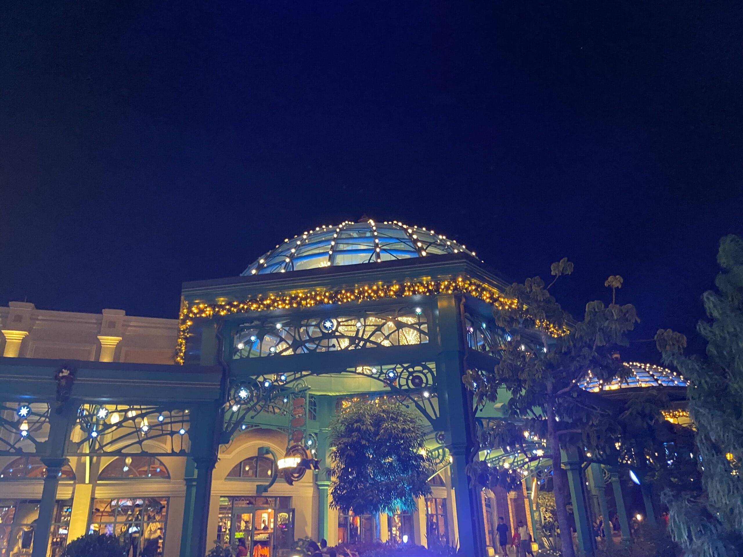 Moving further into Celestial Park, the many snack and beverage kiosks have been wrapped with garland along the rooflines.