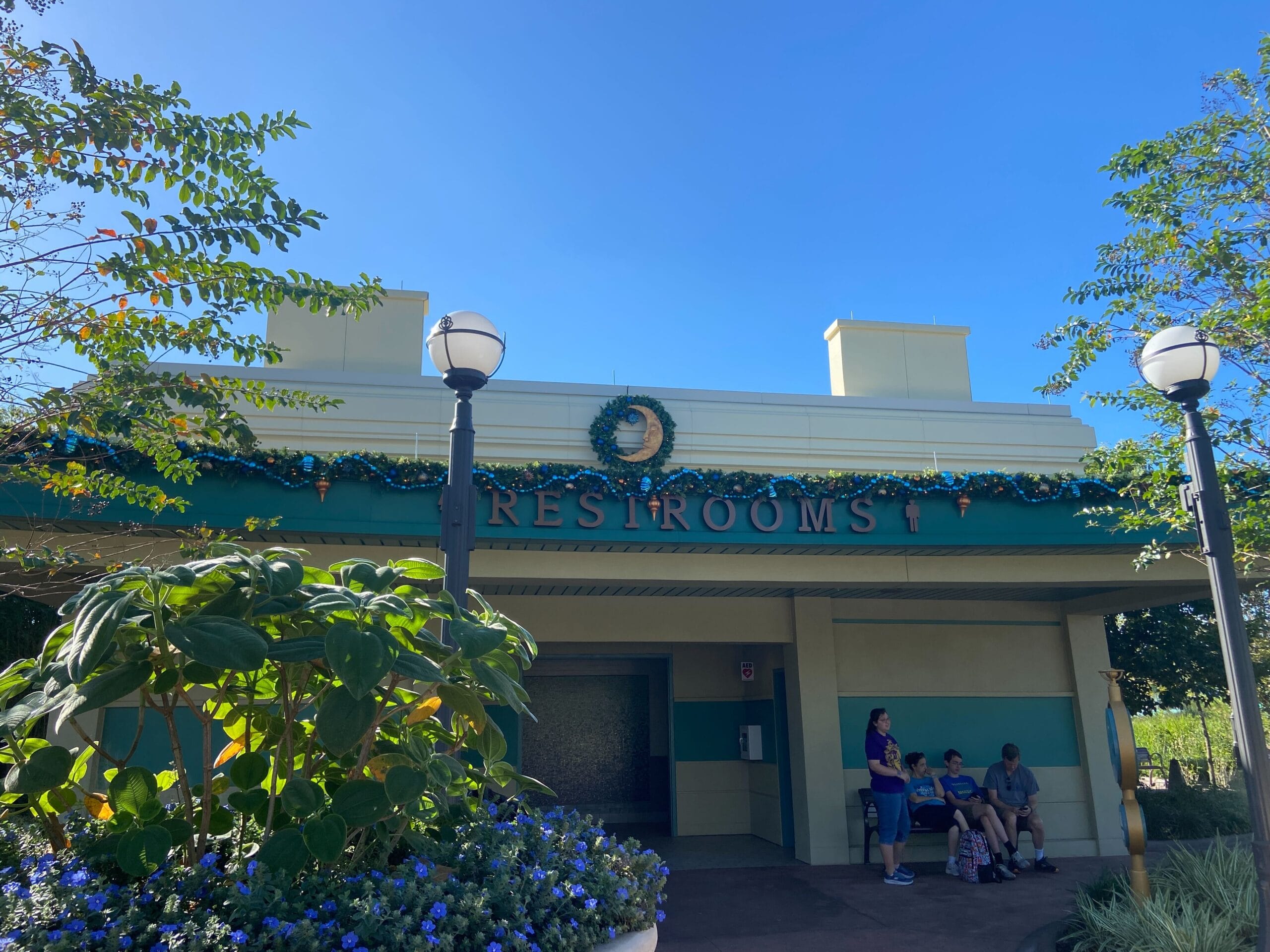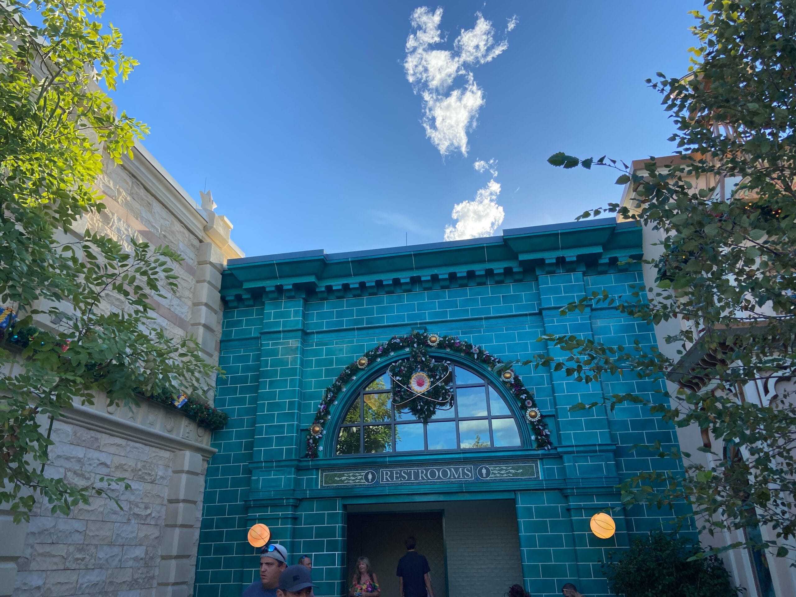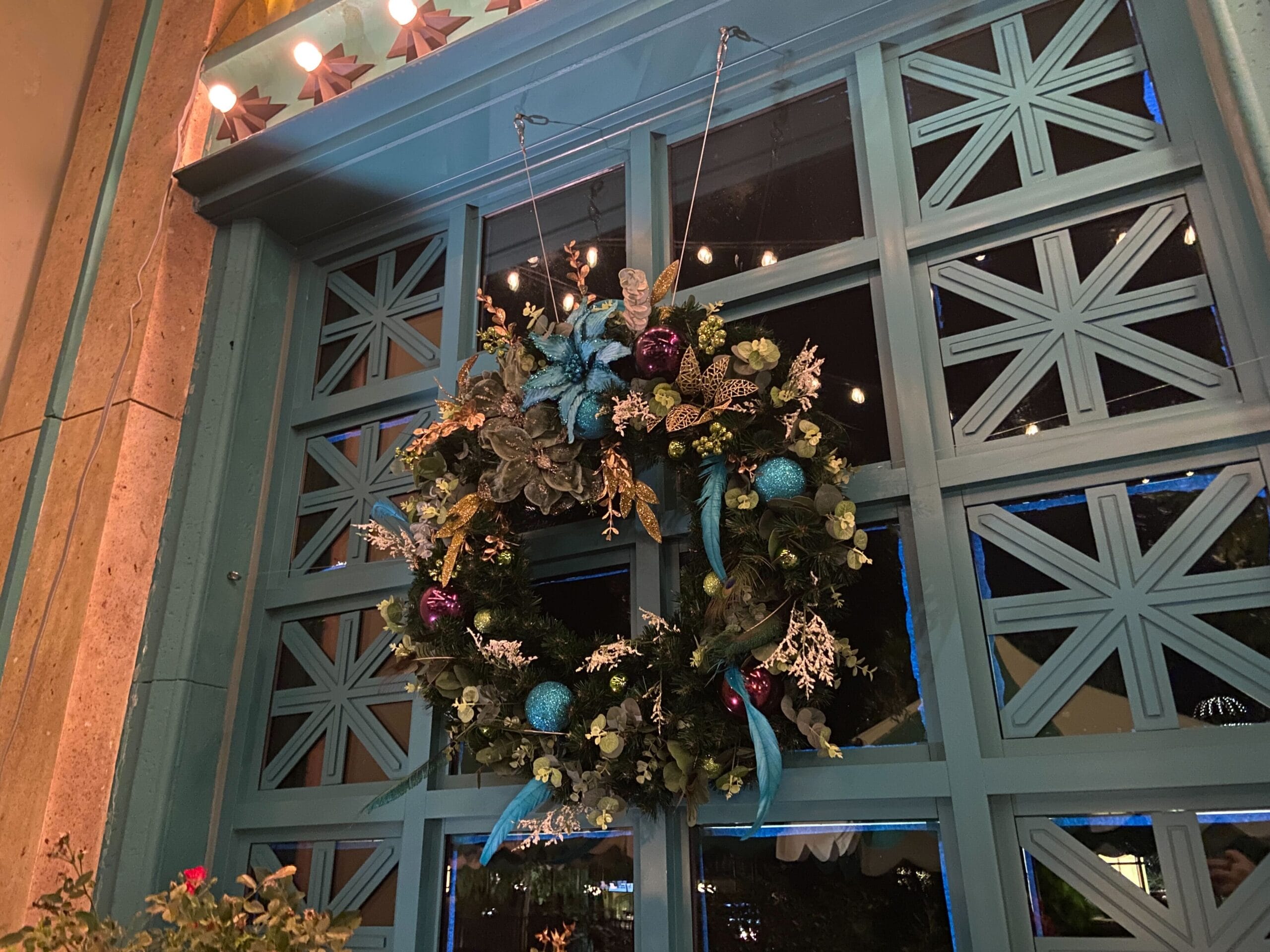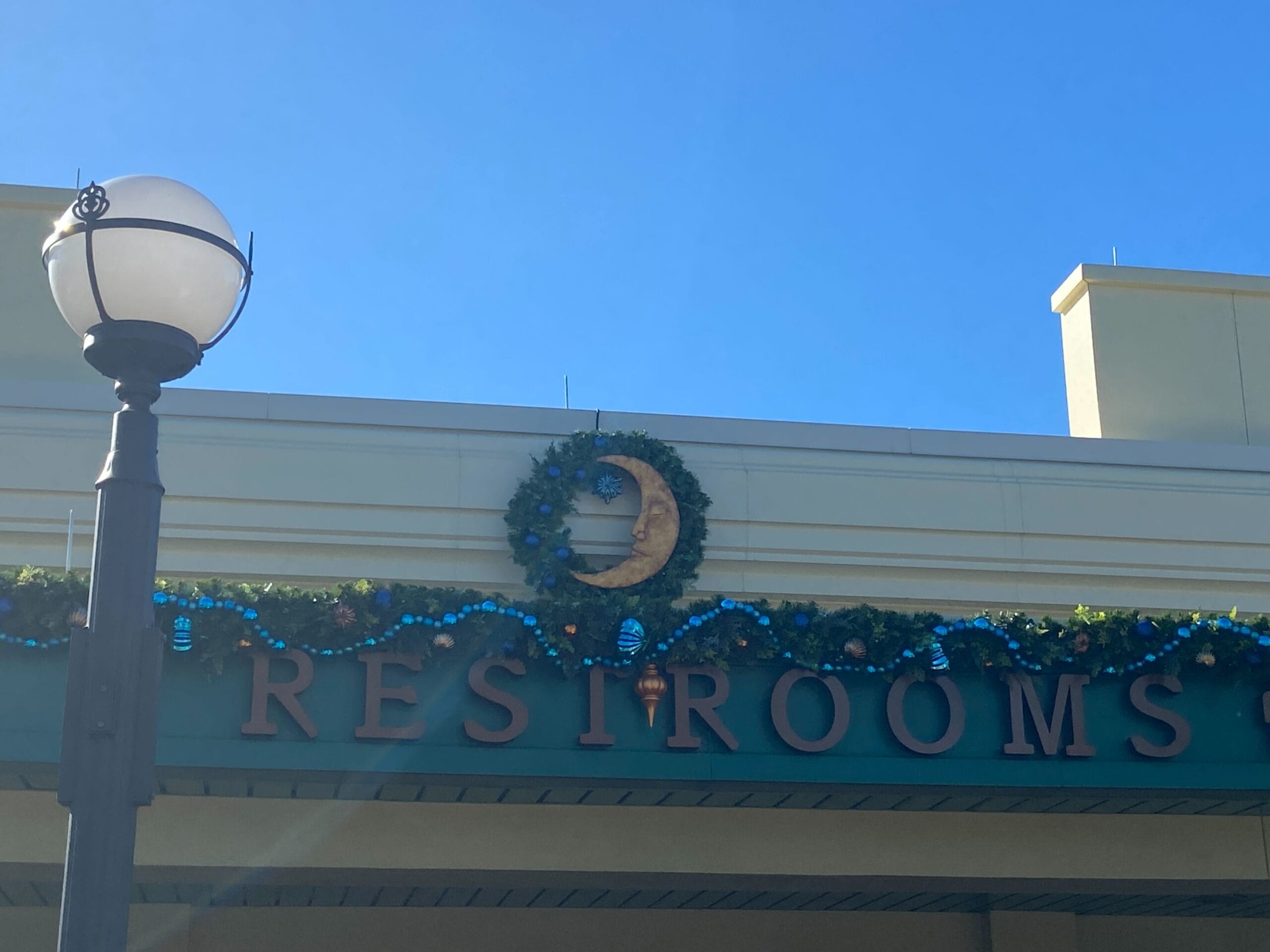 The restrooms just outside of the park have similar garland and a wreath above the entrance. The wreath has a crescent moon and blue baubles.
