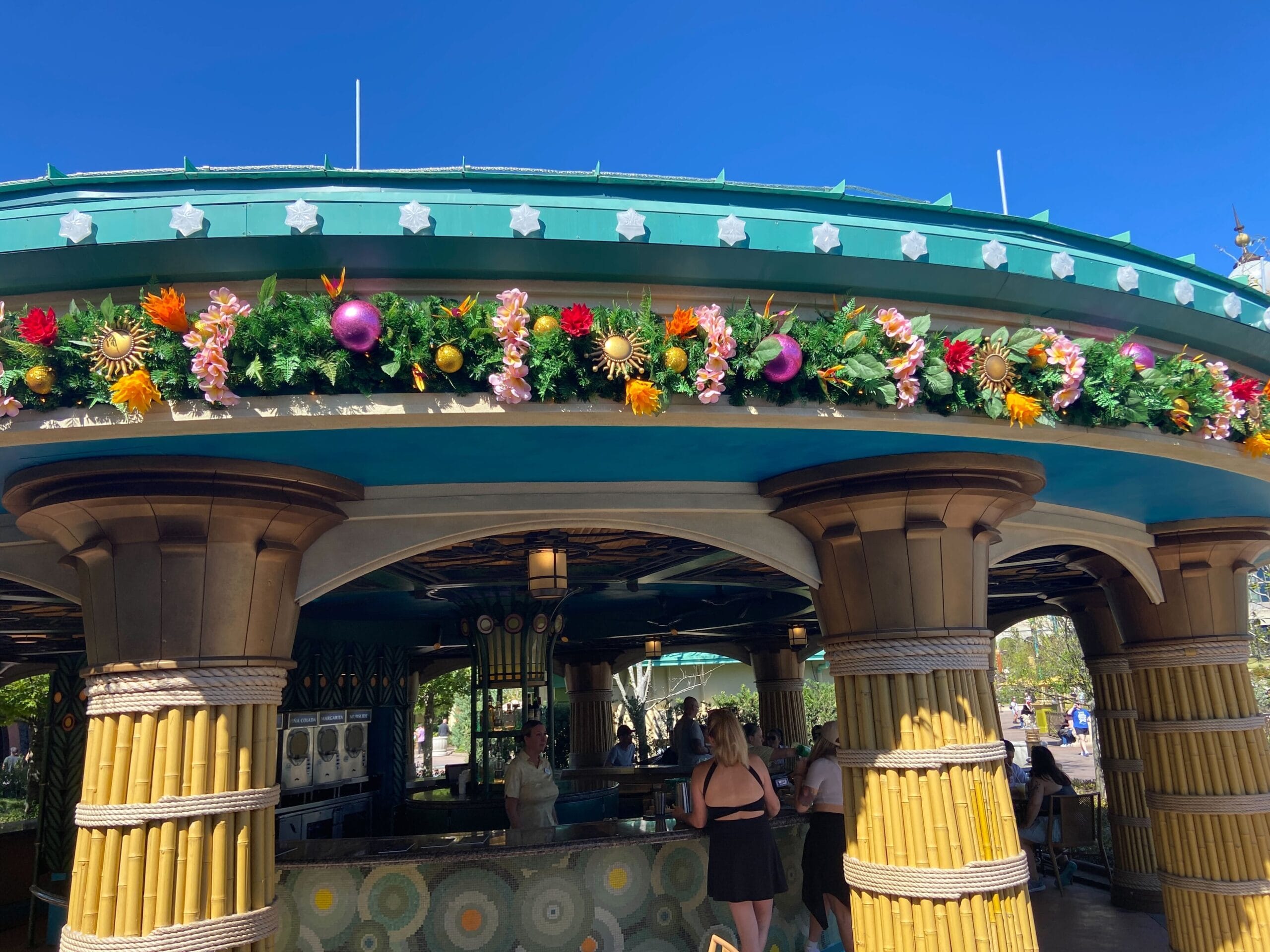 CelesTiki is near the back of Celestial Park, next to Frosty Moon and across from the Cosmos Fountain. The location sells tropical-inspired drinks, so it is fitting that the garland added to the exterior features tropical flowers in bright colors.