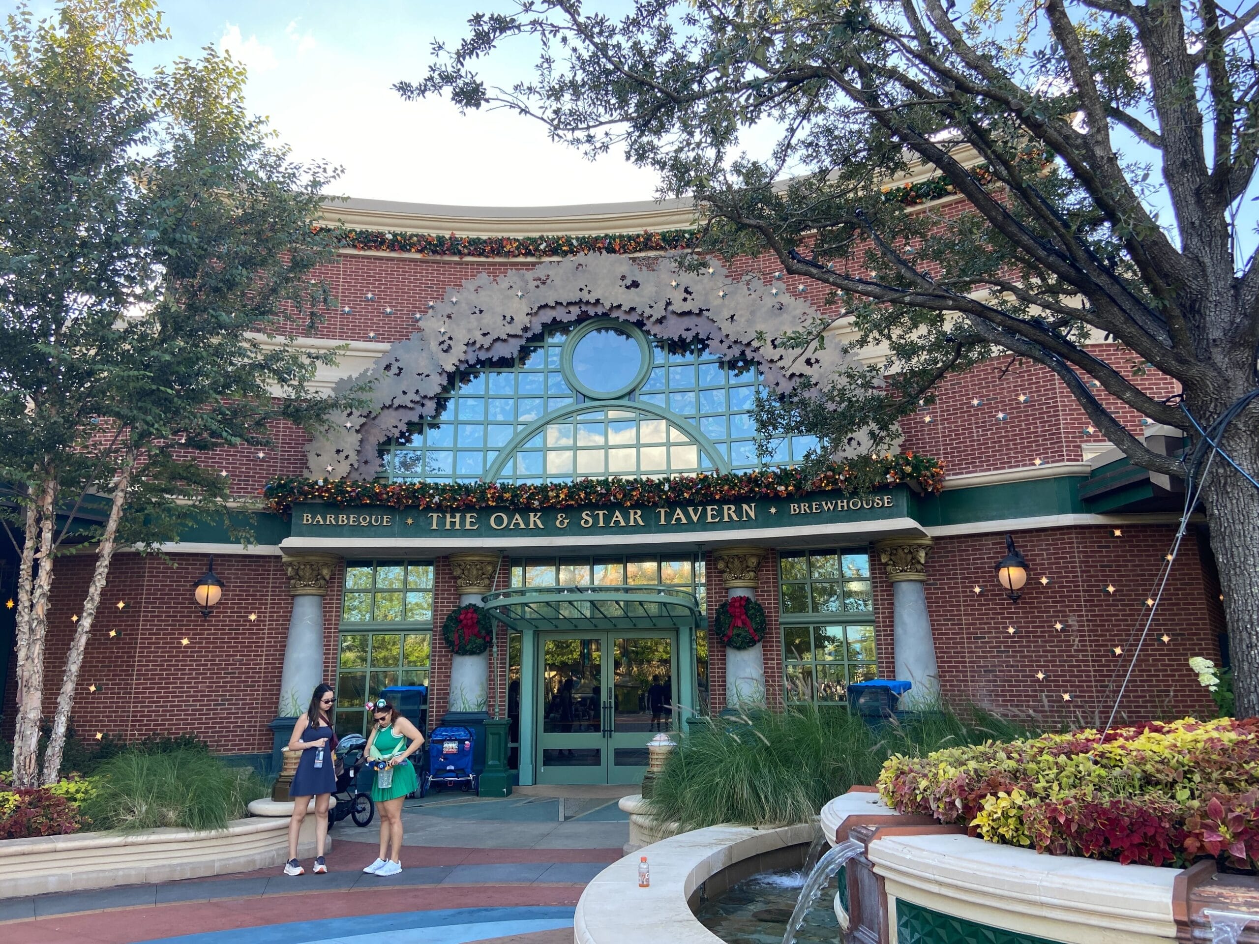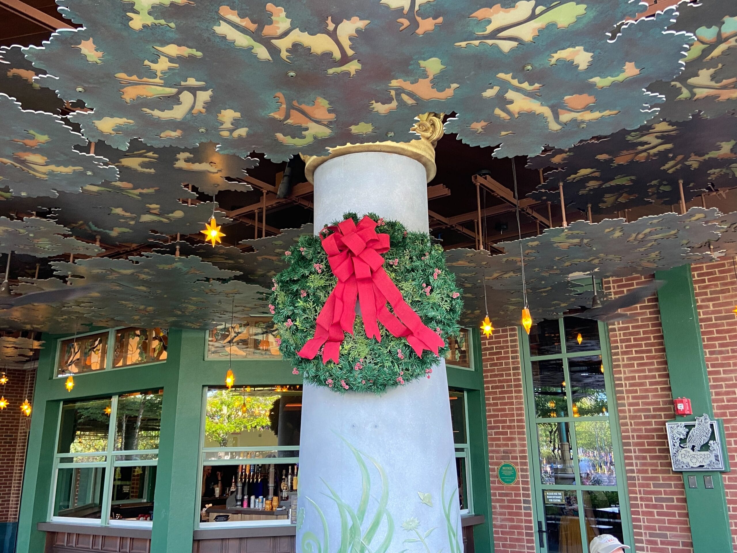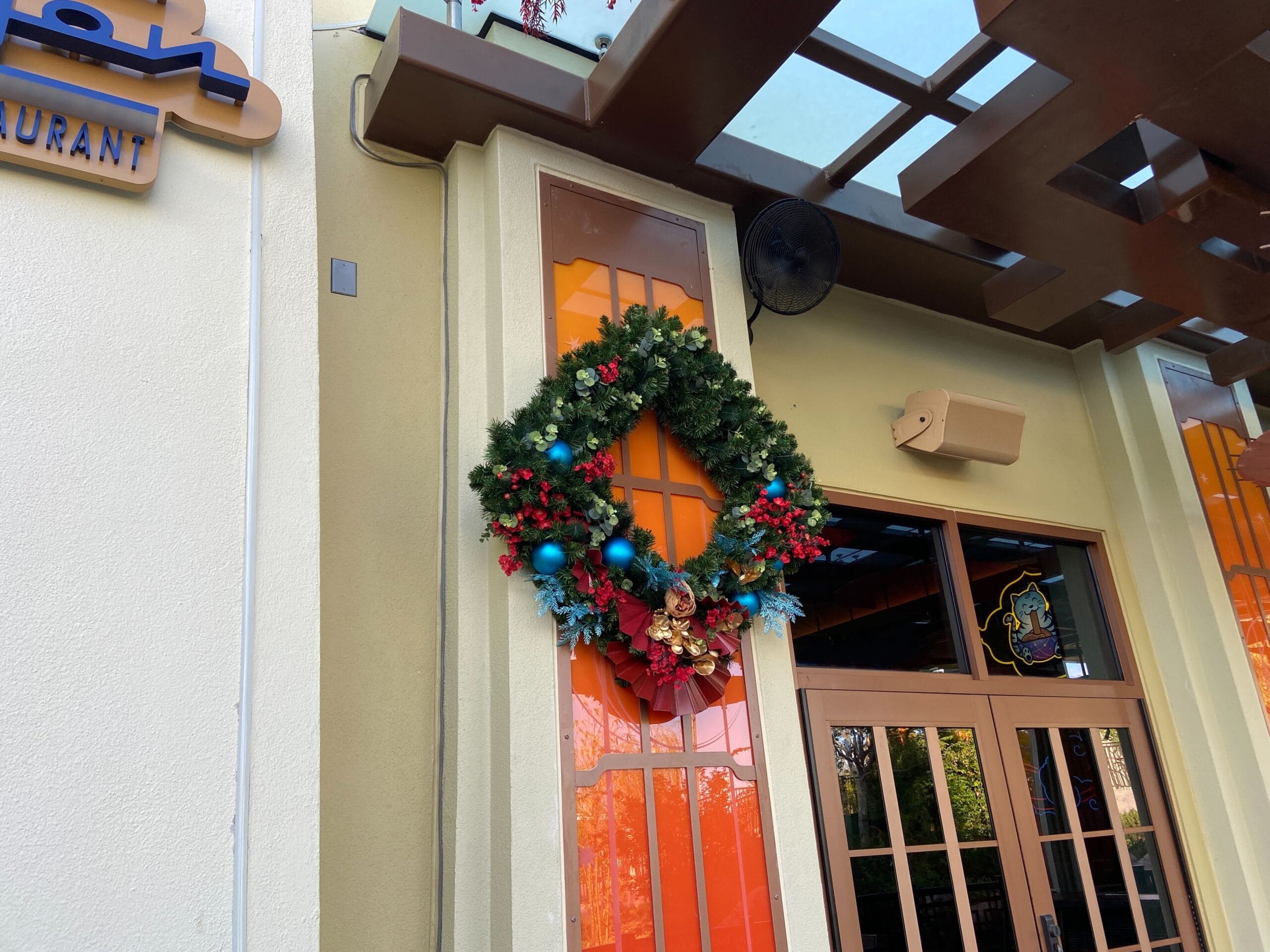 The Oak & Star Tavern is close to the Universal Helios Grand Hotel. The restaurant shares the same building as The Plastered Owl bar, which is across from Frosty Moon. The location has quite an extensive menu that includes several classic barbecue-inspired entrees. That said, the wreaths on the exterior are very classic in nature, with large red bows.