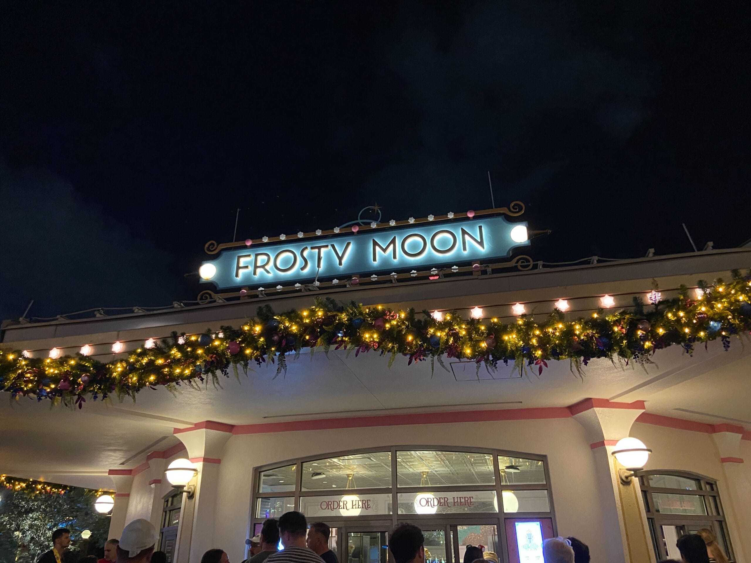 Frosty Moon is in Celestial Park, near the portal to Dark Universe and across from The Oak & Star Tavern. Garland with pink and blue baubles now drape around the exterior roofline.