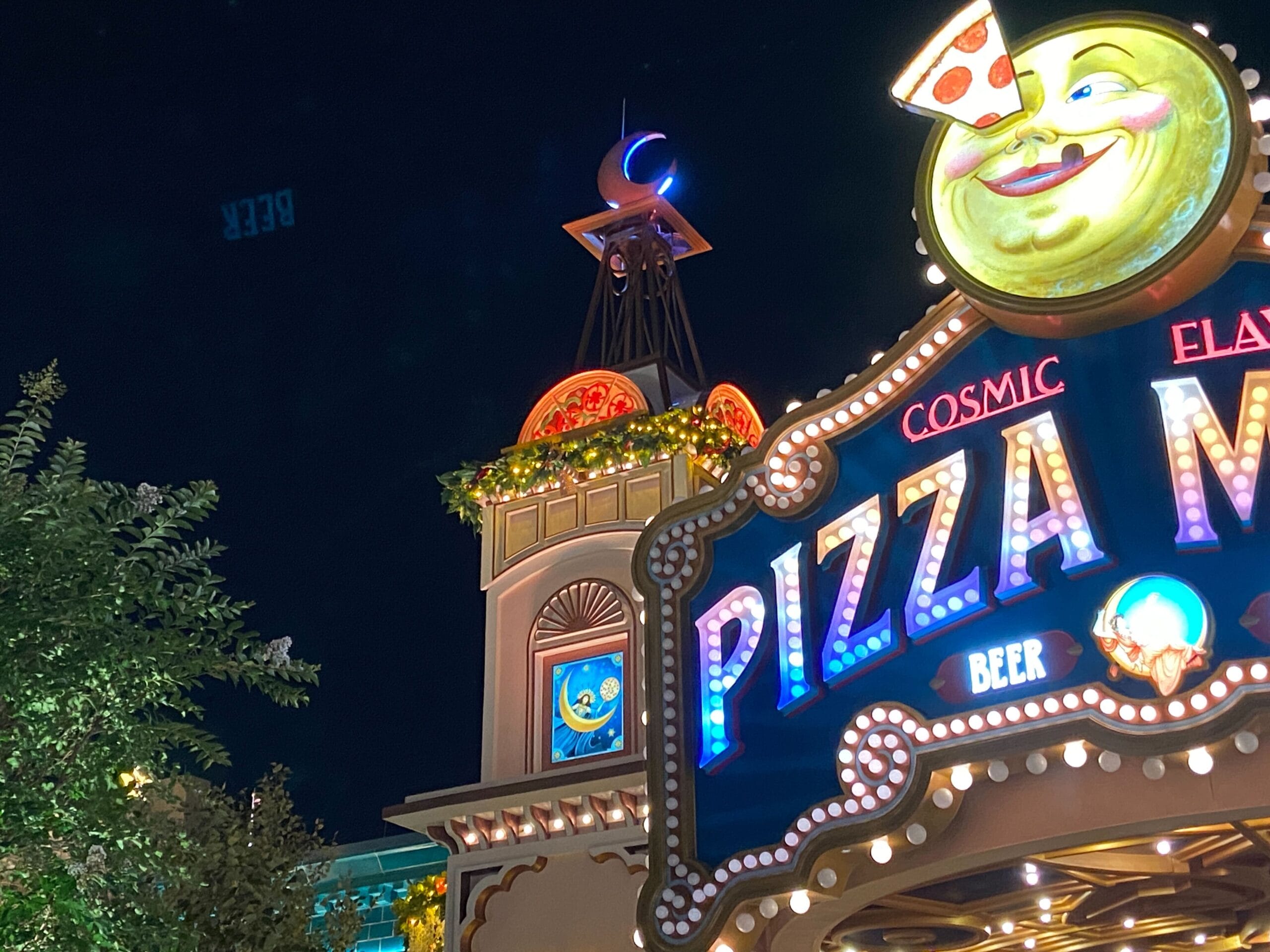 The windows of Pizza Moon and nearby bathrooms are wrapped with themed garland and an atom-shaped wreath.