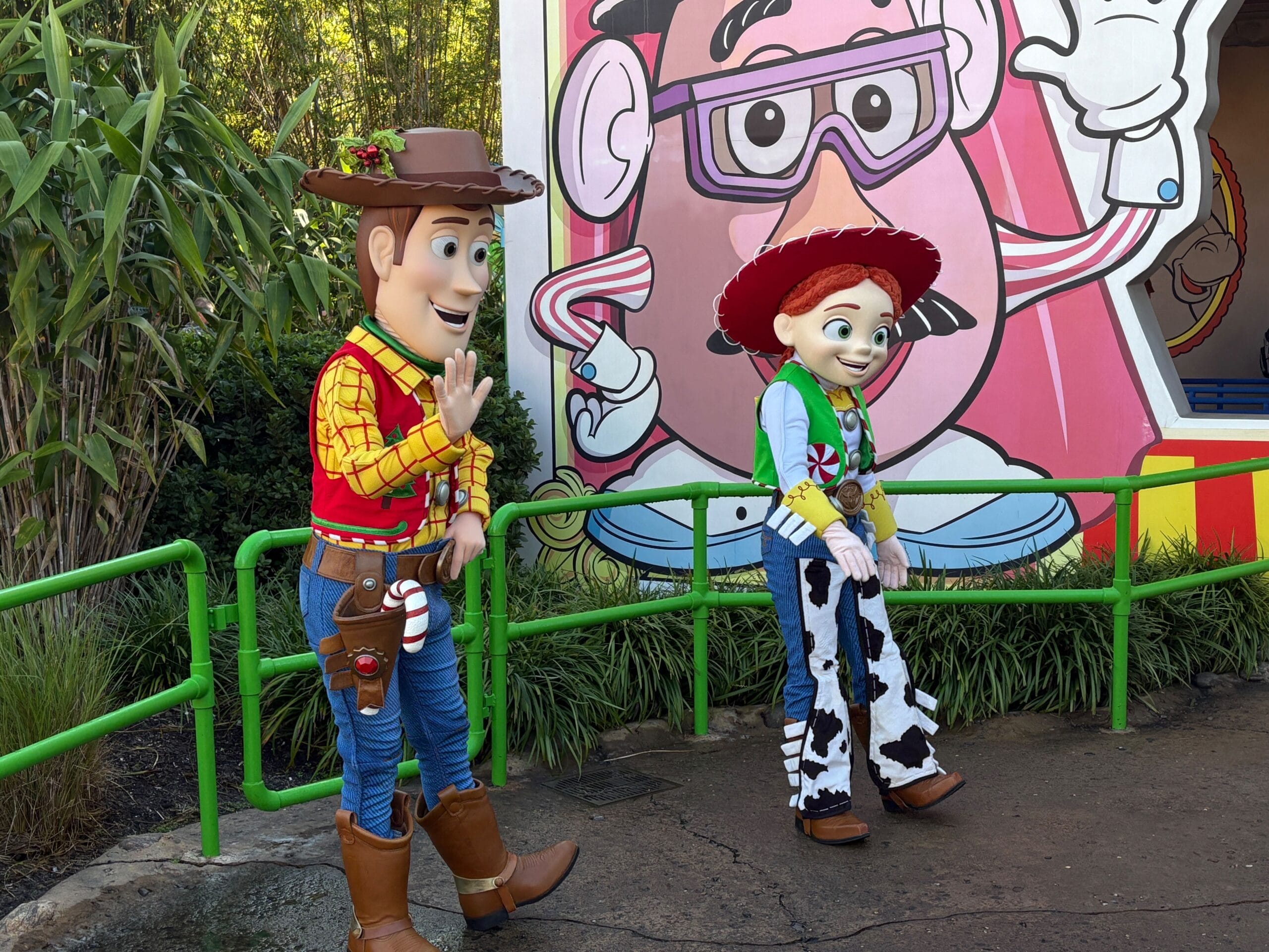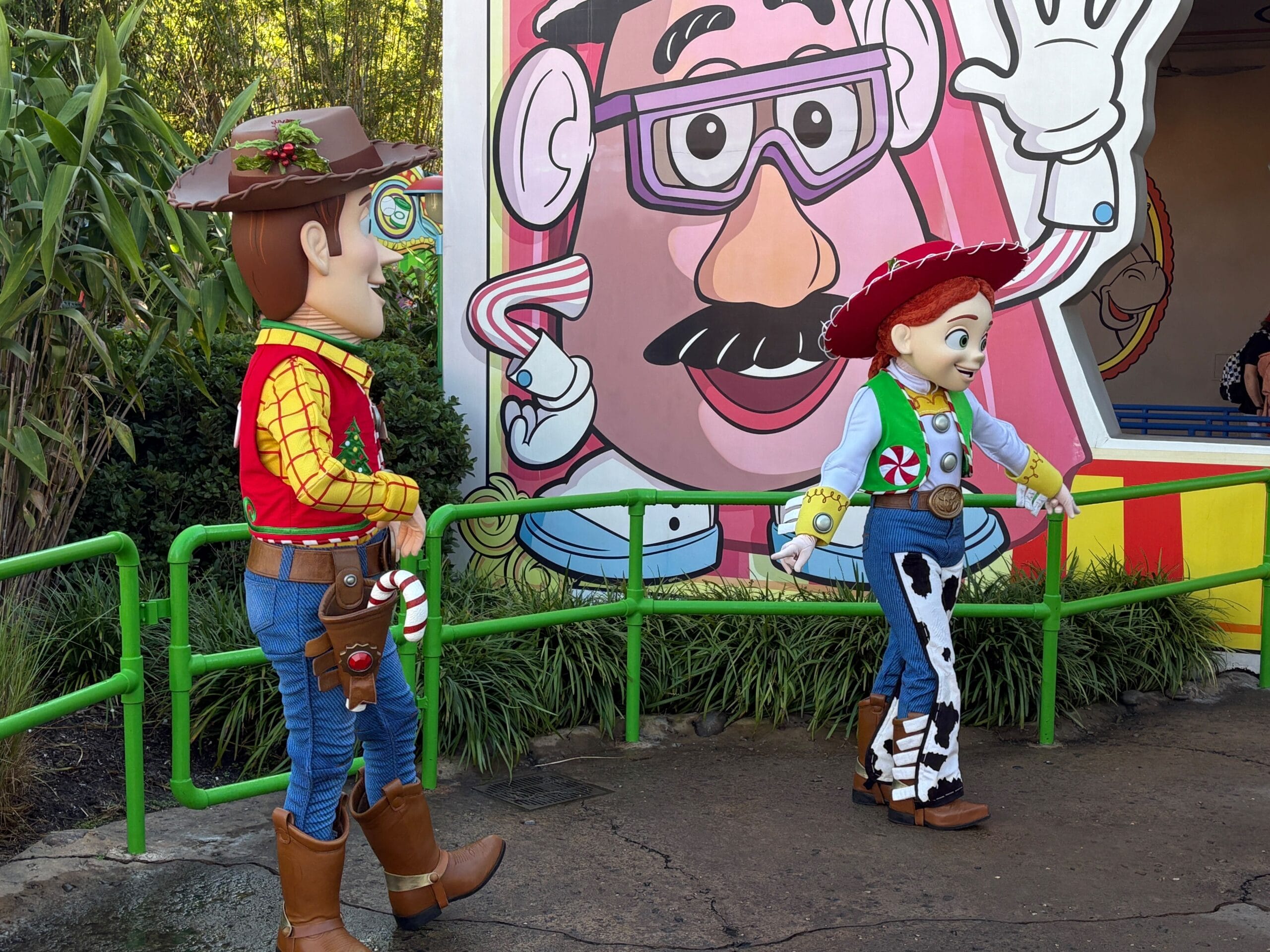 Woody and Jessie meet in Toy Story Land just outside of Toy Story Mania. They are both wearing festive vests with holiday icons like Christmas trees and peppermints.