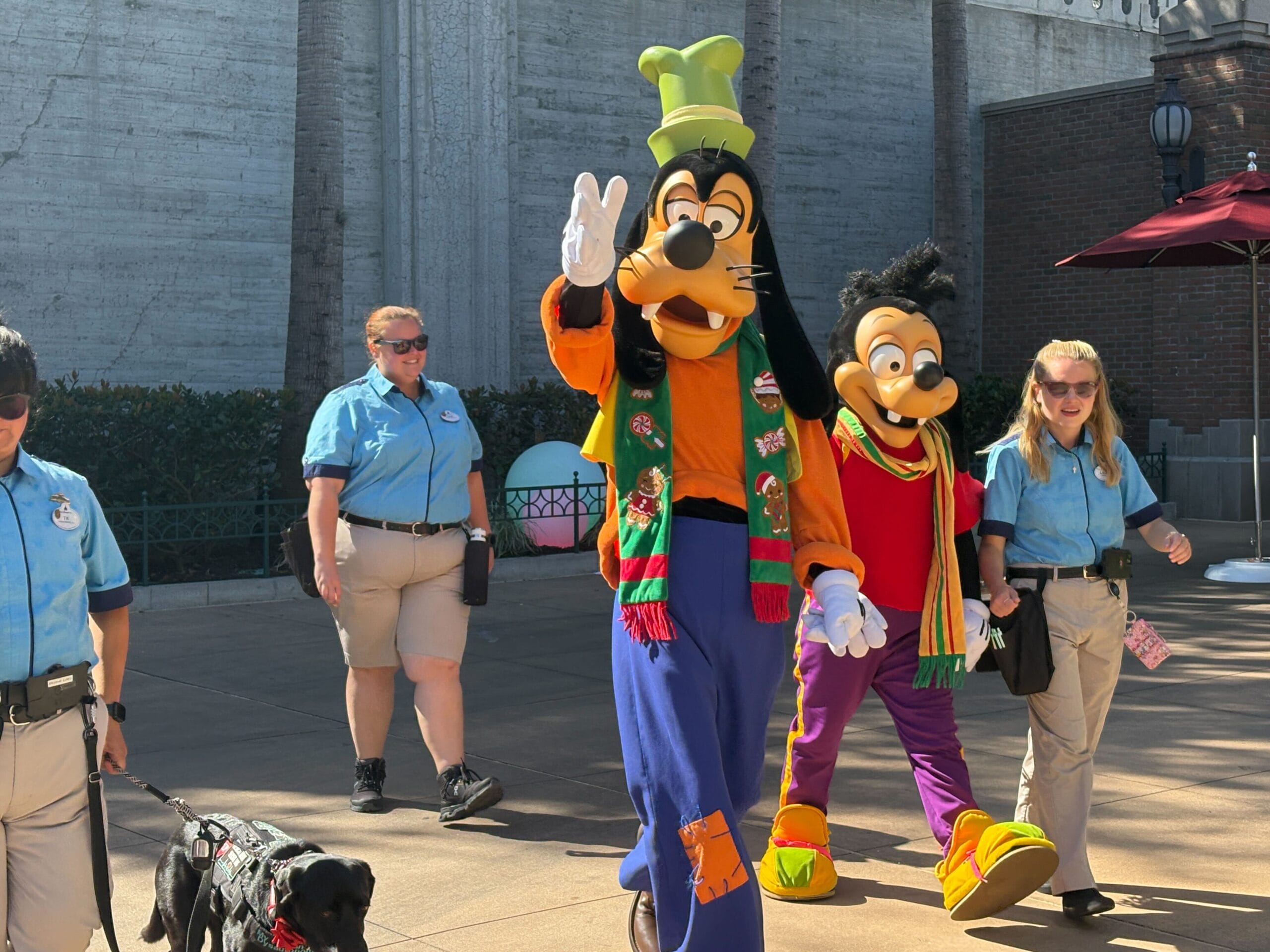 Goofy and Max meet on Grand Avenue near the portal to Galaxy’s Edge. Both have added themed holiday scarfs to their typical outfits.