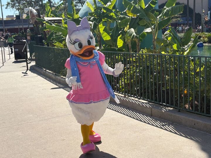 Daisy also meets around Echo Lake near Dinosaur Gertie’s Ice Cream of Extinction. She has added a blue scarf to her normal pink top outfit.
