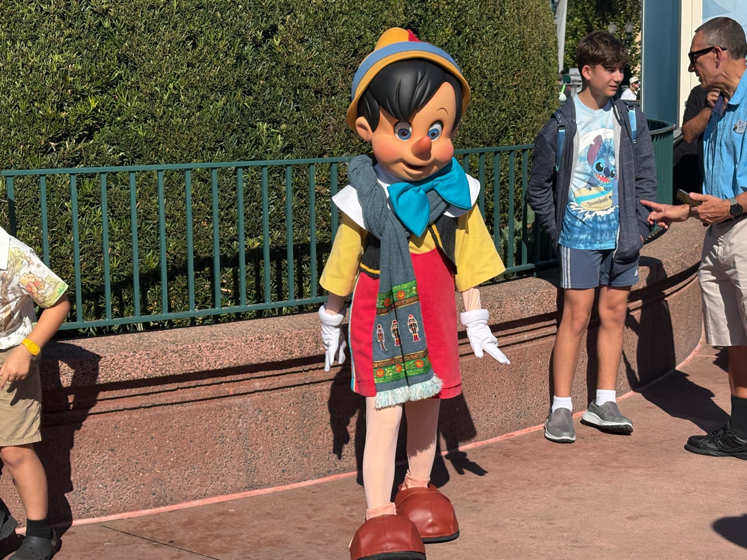 Pinocchio has added a German-style scarf with a nutcracker design to his normal outfit. He meets near Mickey & Minnie’s Runaway Railway on Hollywood Boulevard.