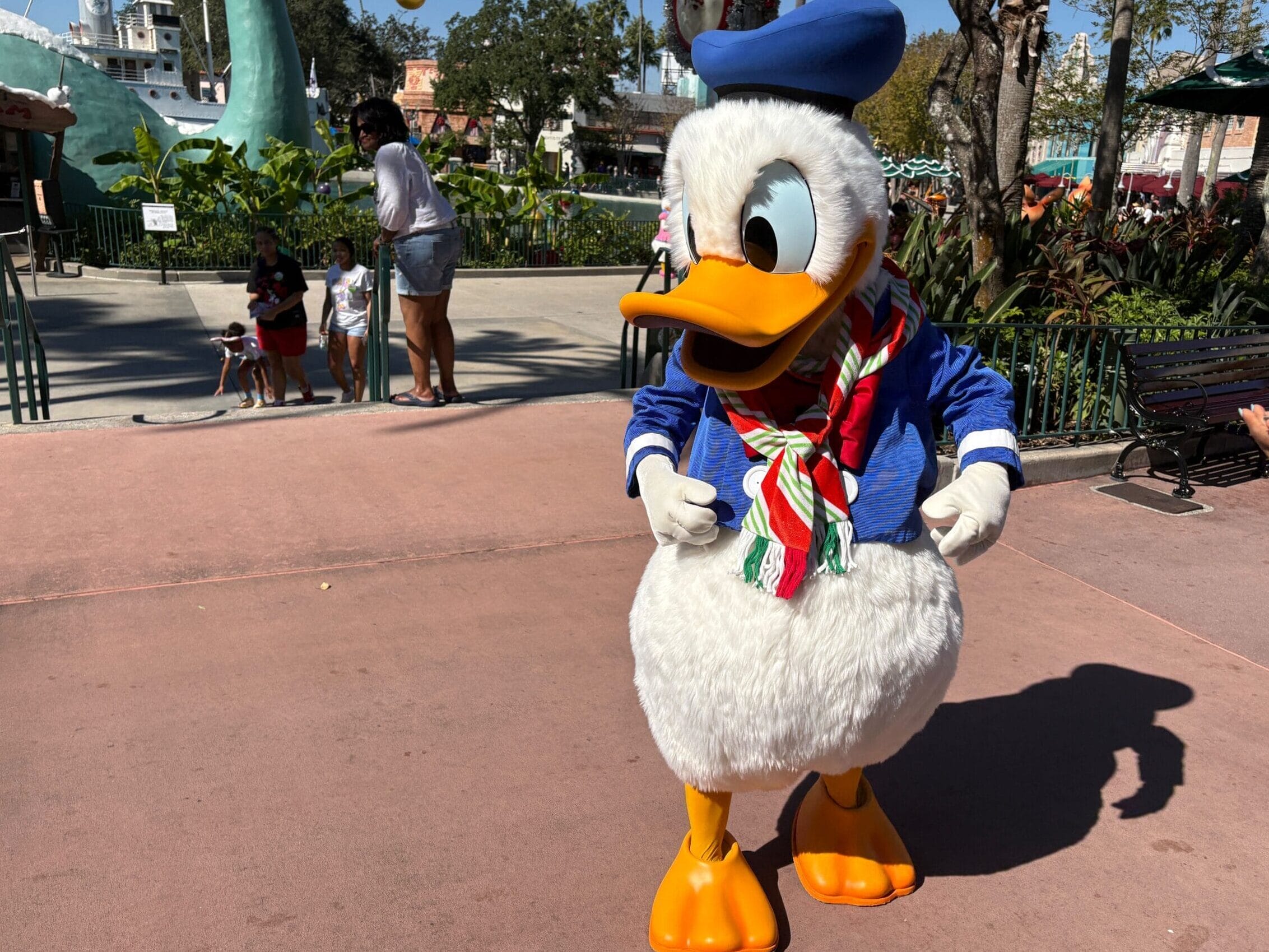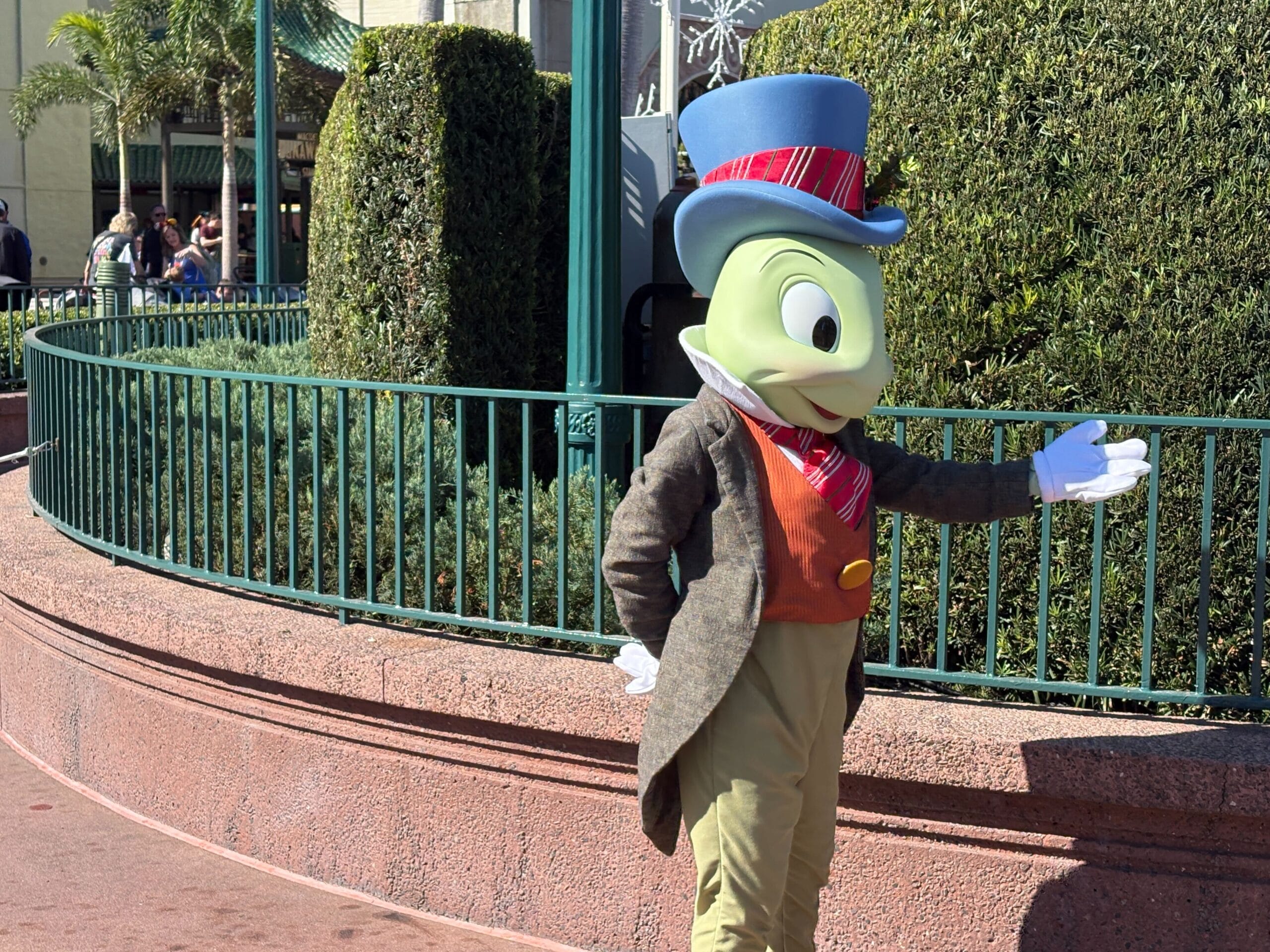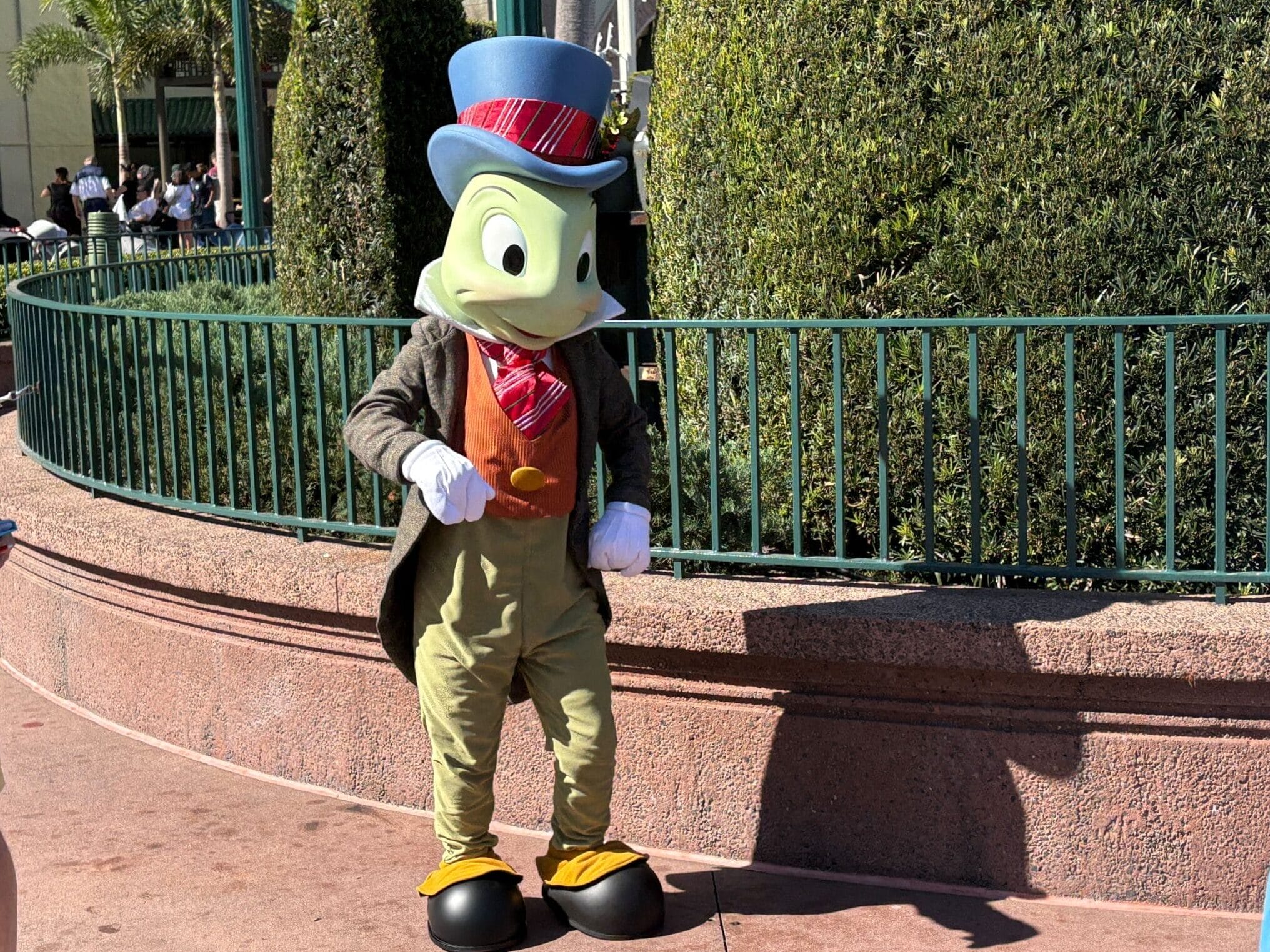 Jiminy Cricket meets on Hollywood Boulevard near Mickey & Minnie’s Runaway Railway as well. For the holidays, his hat band and ascot are red with white and green stripes.