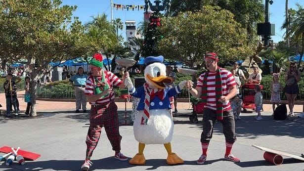 Donald meets near Dinosaur Gertie, but he is also participating in the new HollyGroove Swinging show wearing a festive scarf.