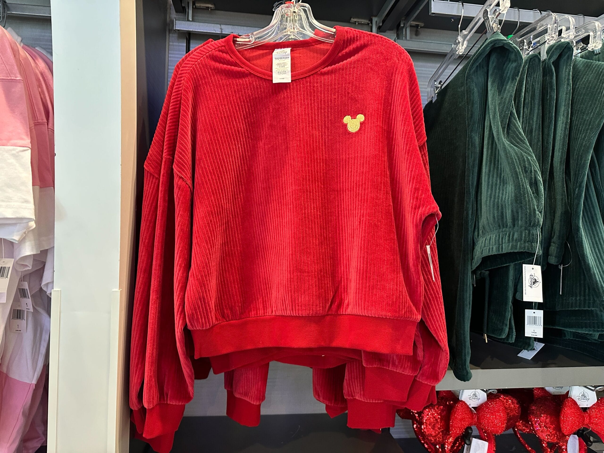 We first spotted the collection in Star Traders at Magic Kingdom. It includes three sweatshirts and three sweatpants in red, green, and white.