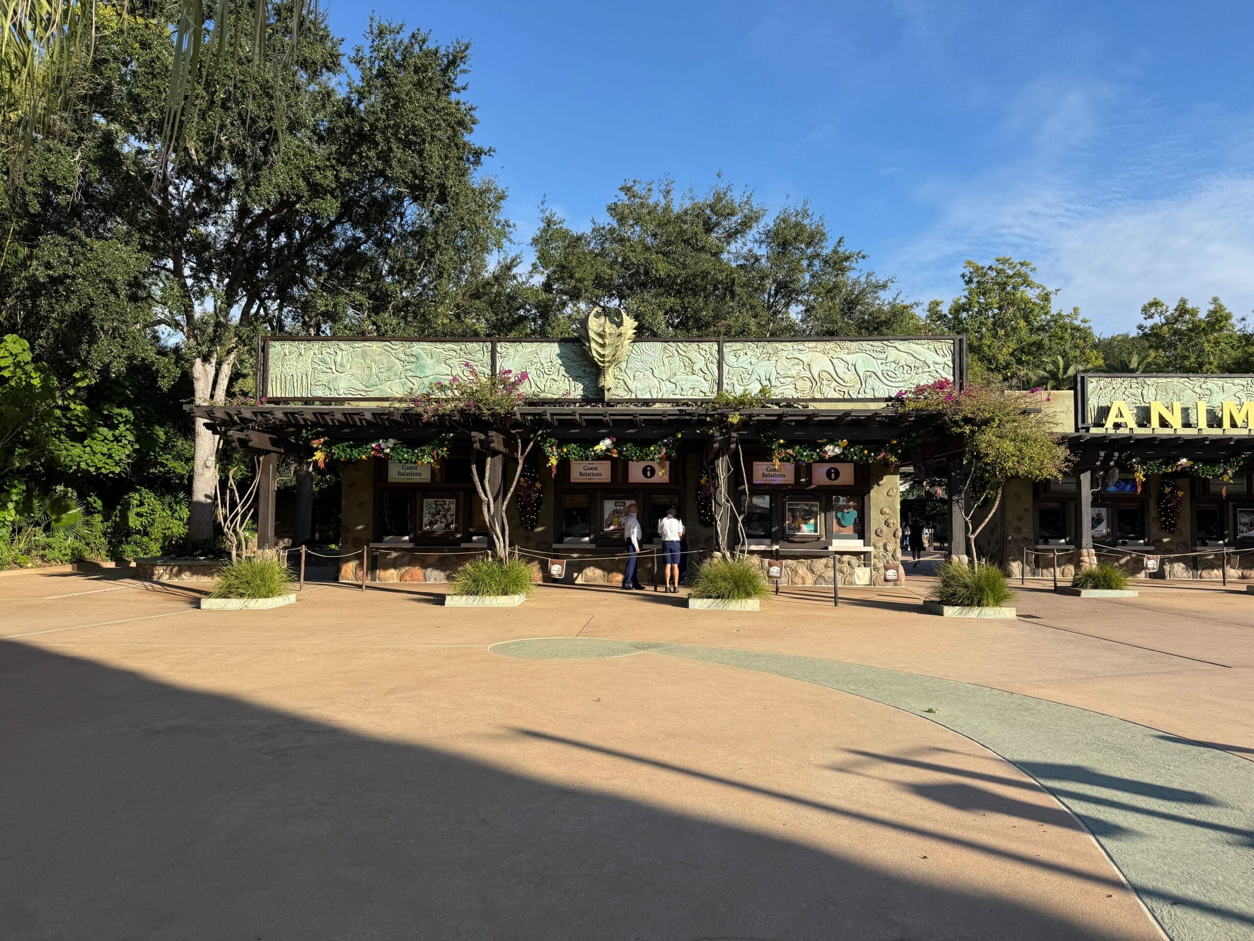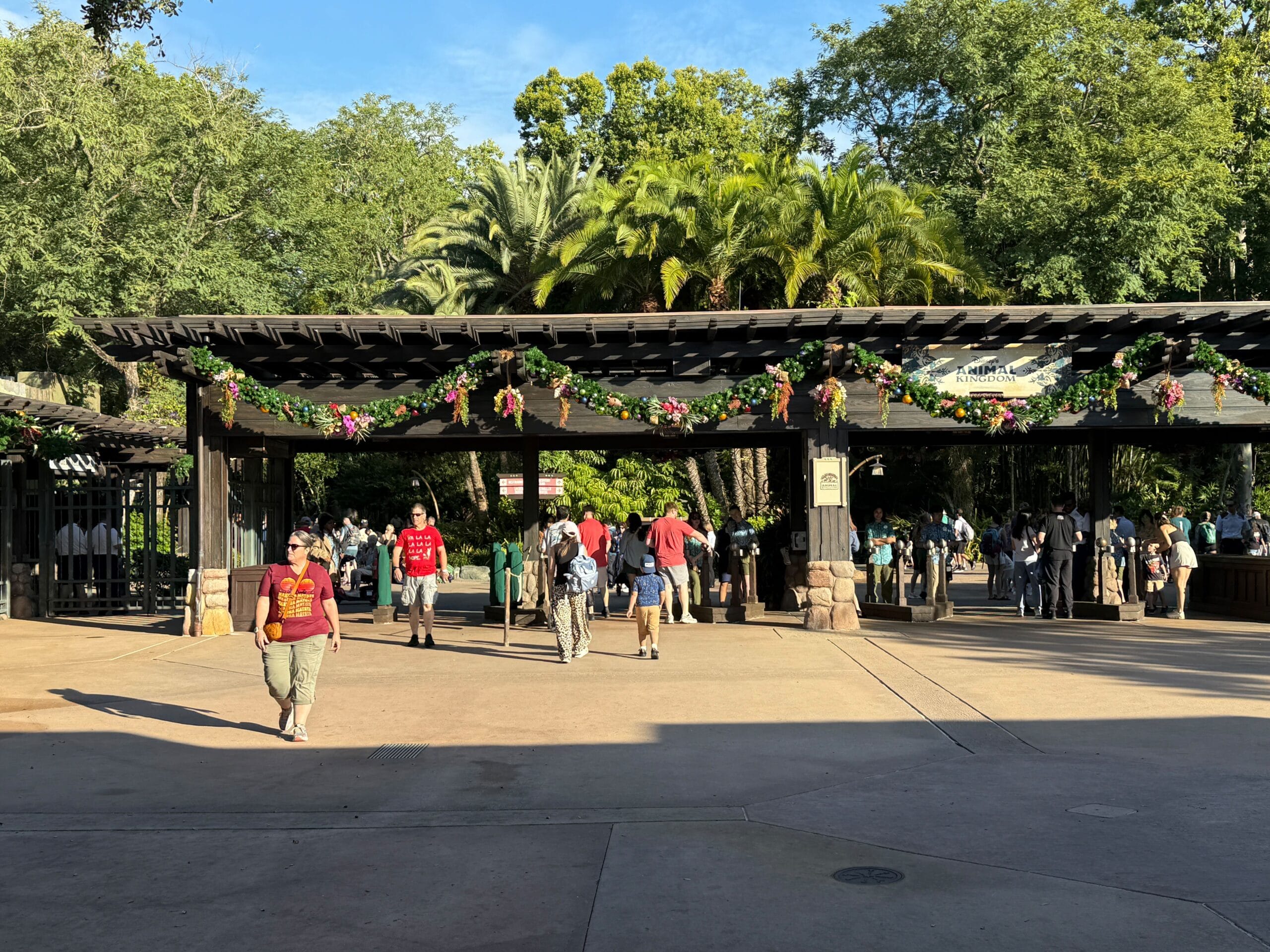 The overhangs on Disney’s Animal Kingdom ticket plazas are now adorned with light-up garlands.