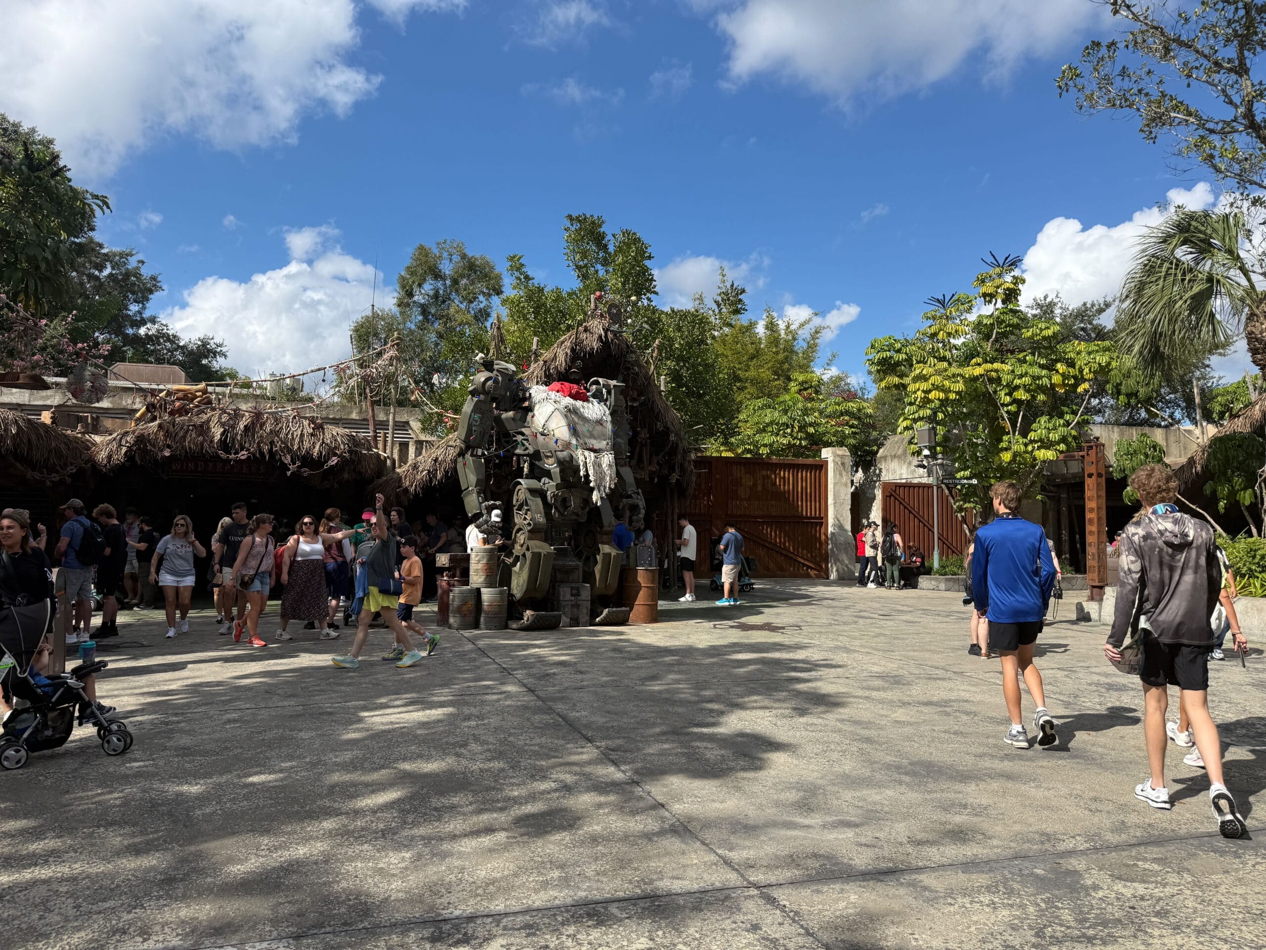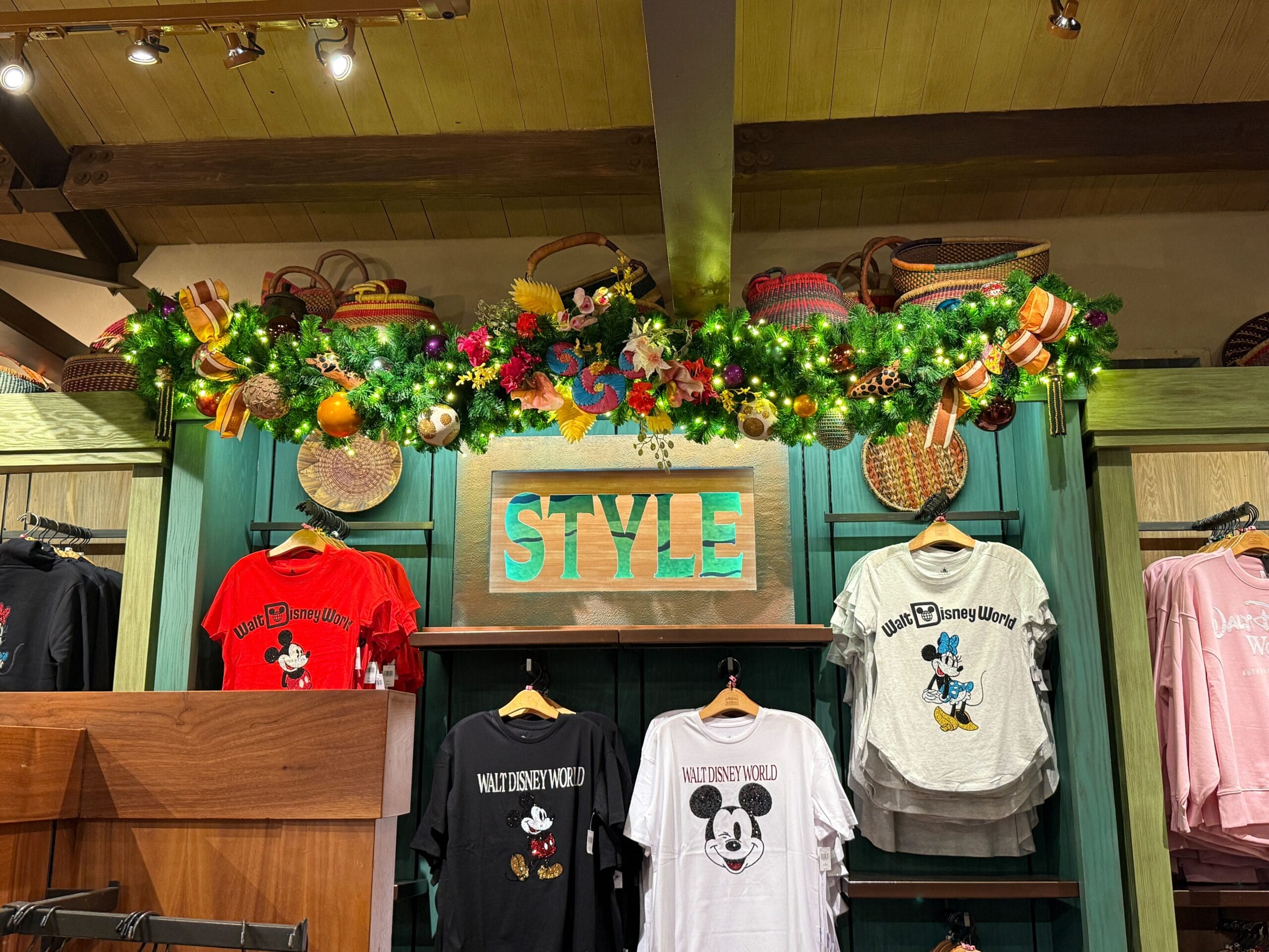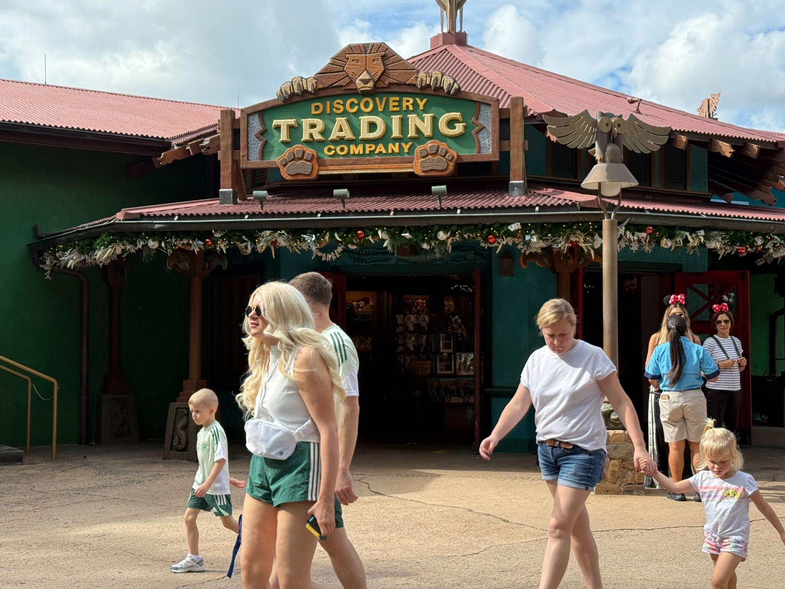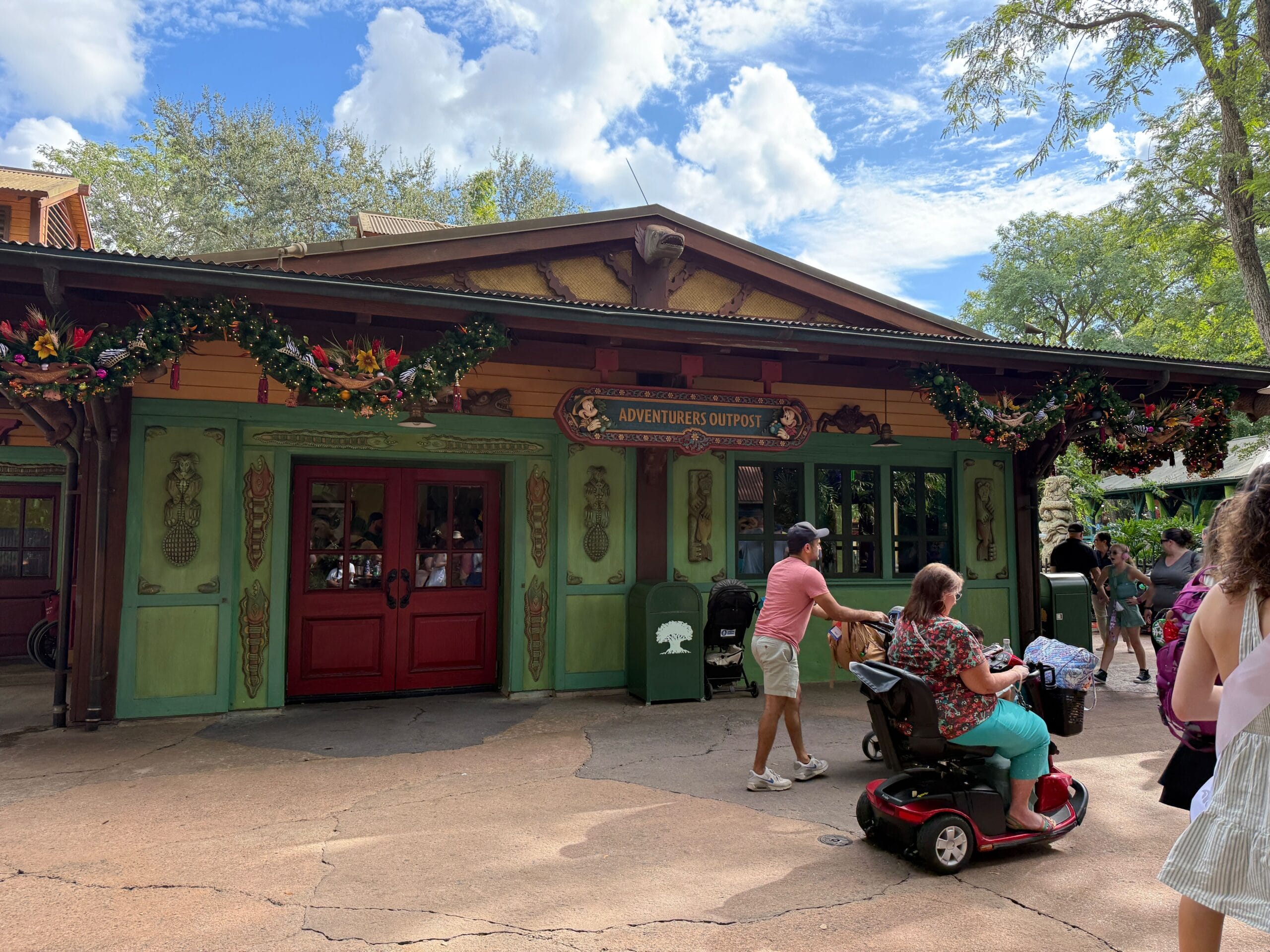 Adventurers Outpost, where guests meet Mickey and Minnie, has garland hanging from its roof. Mickey and Minnie will soon don holiday accessories for the season.