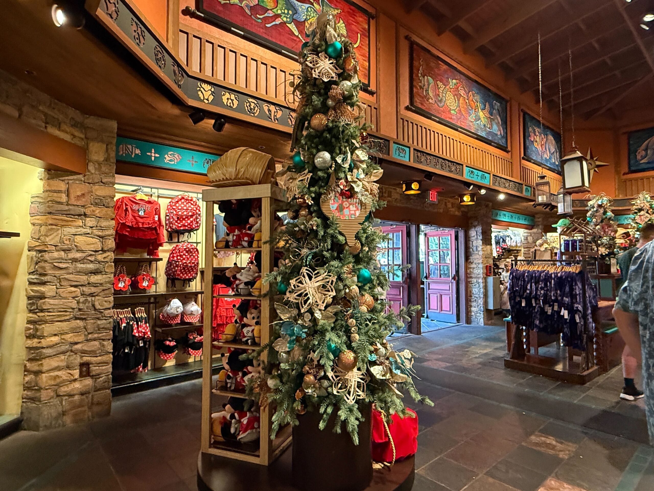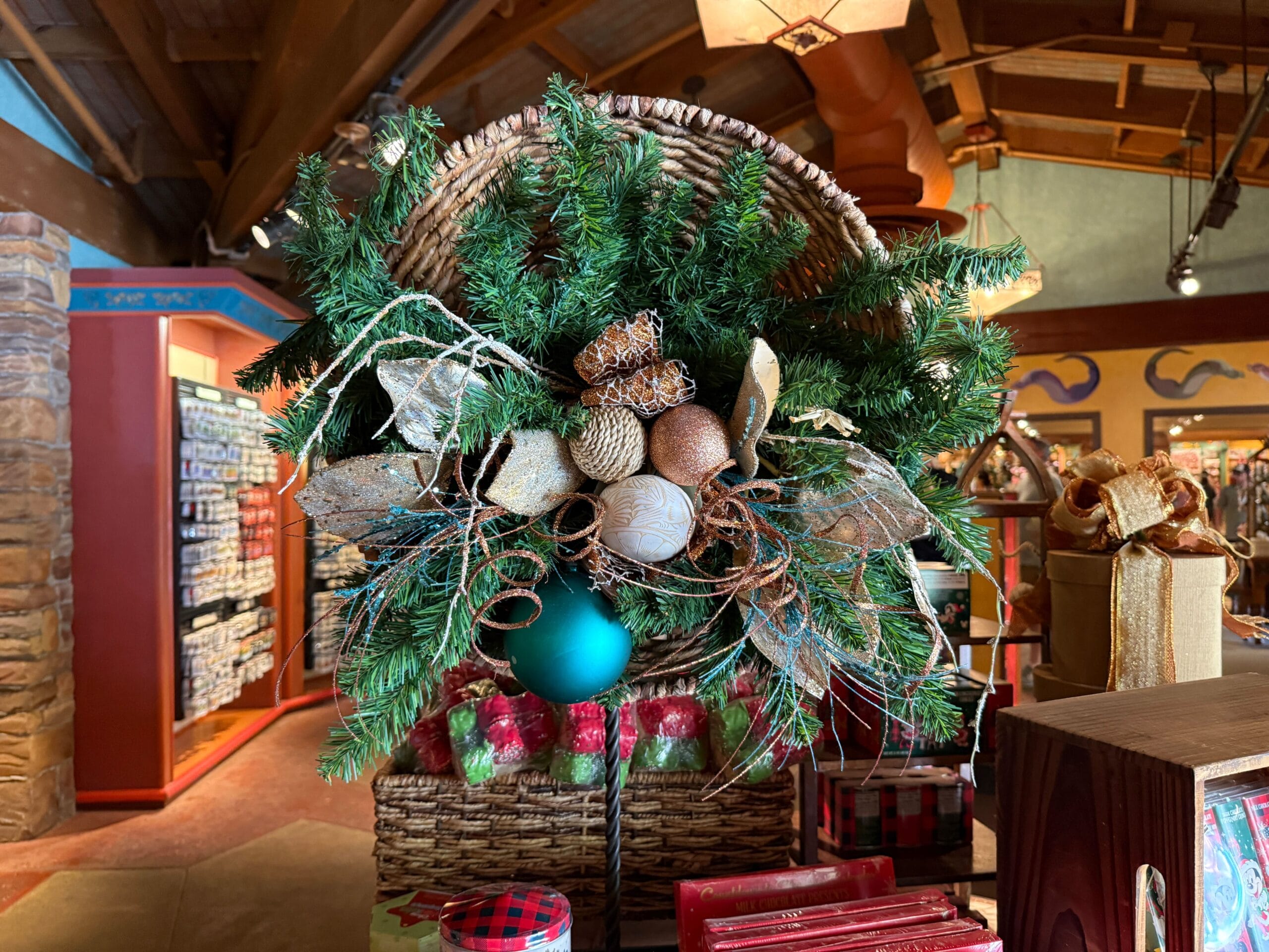 Inside the gift shop are Christmas trees, festive baskets, and garlands.