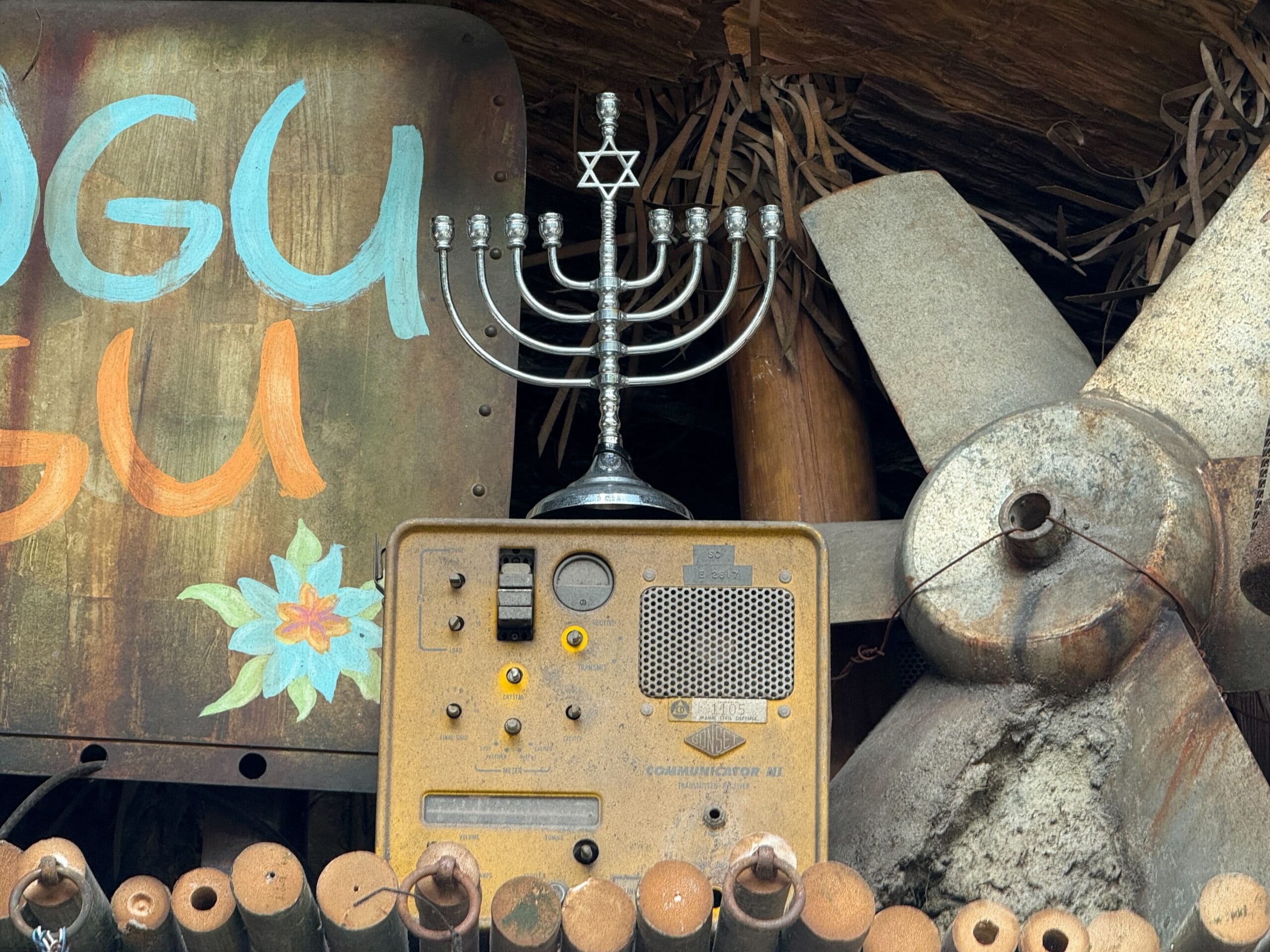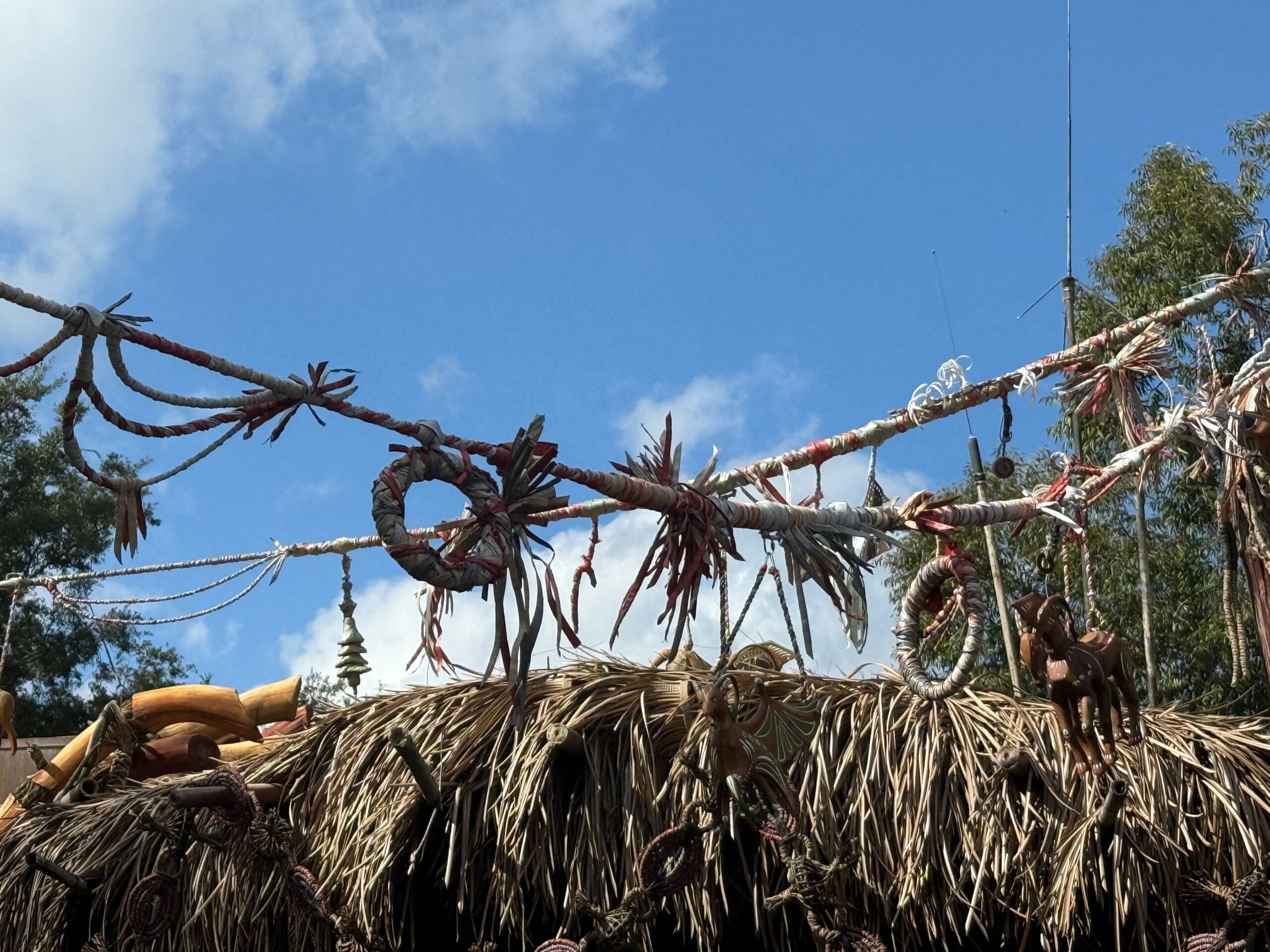 Small wreaths and ornaments hang between the suit and Pongu Pongu. Some resemble carved creatures native to Pandora.