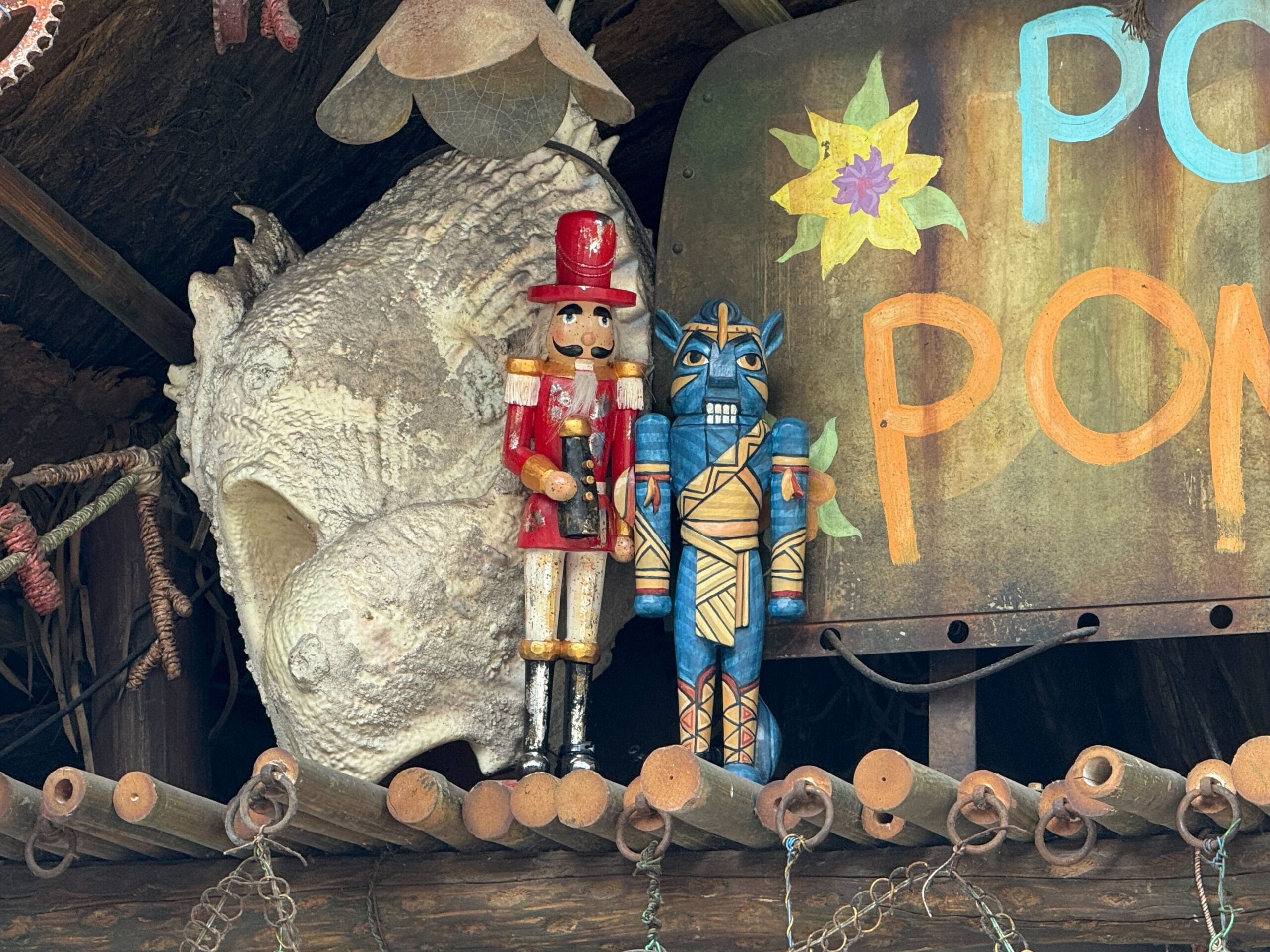 A pair of nutcrackers sits next to the bar’s sign. One is painted to look like a Na’vi.