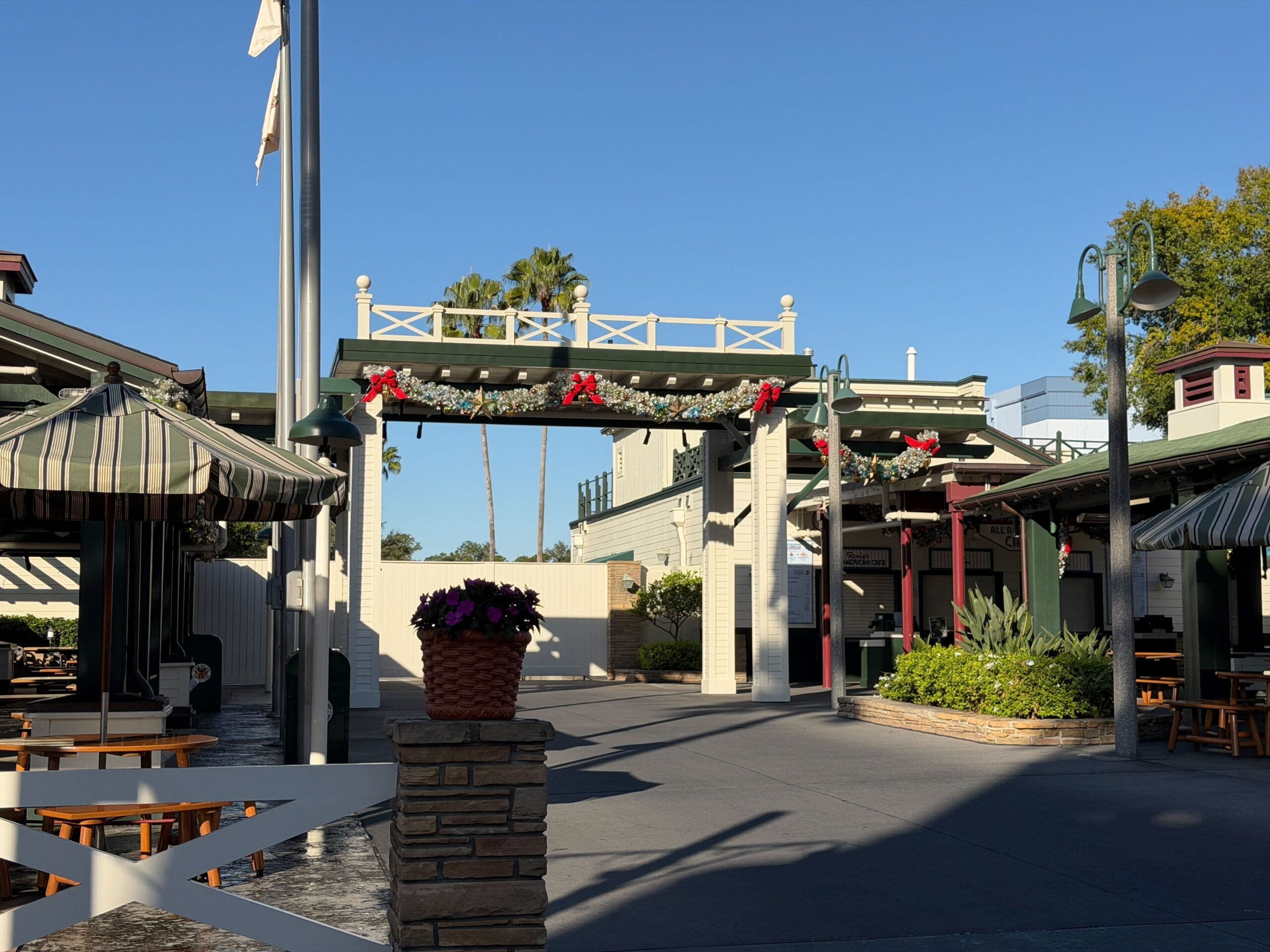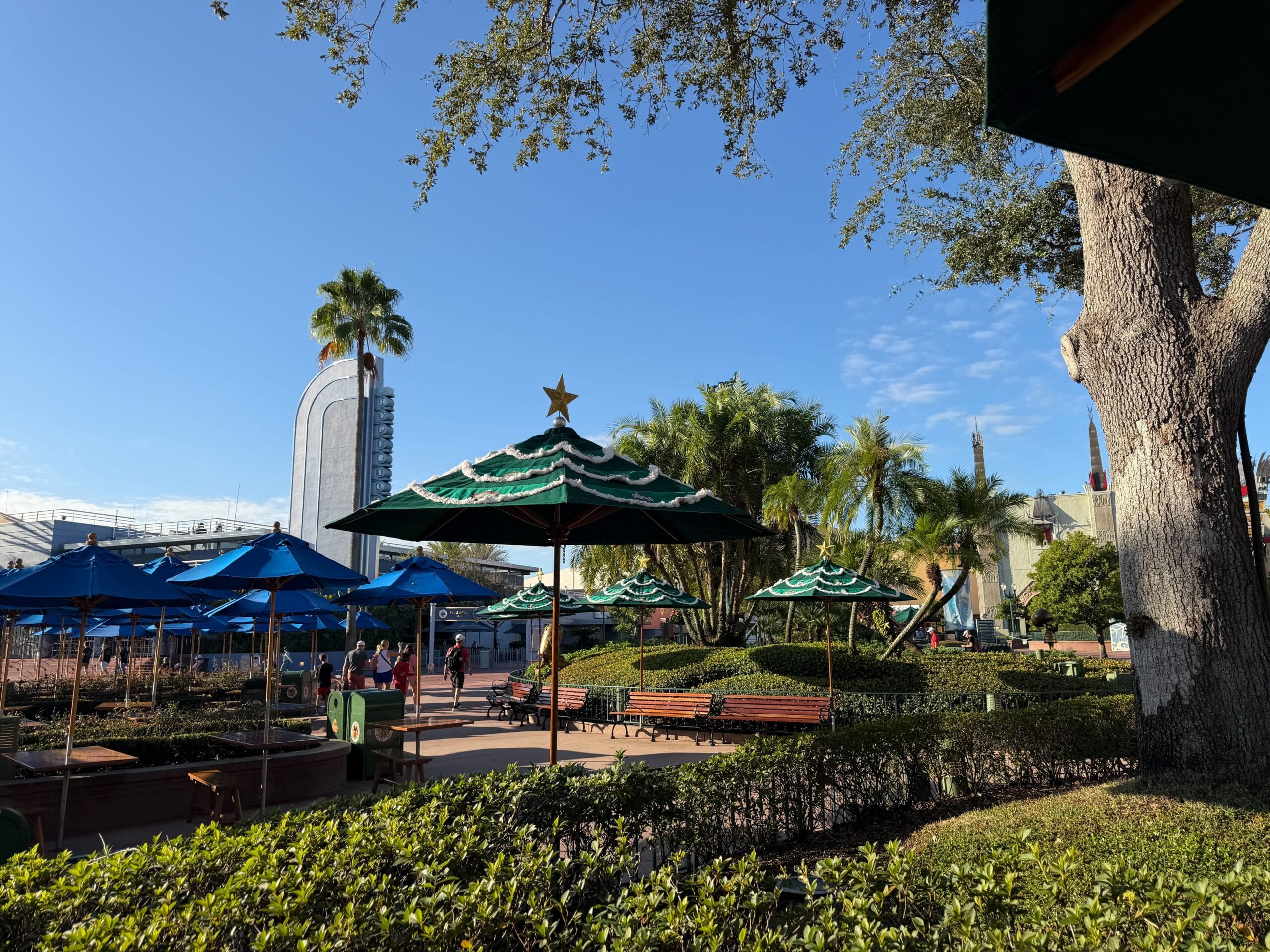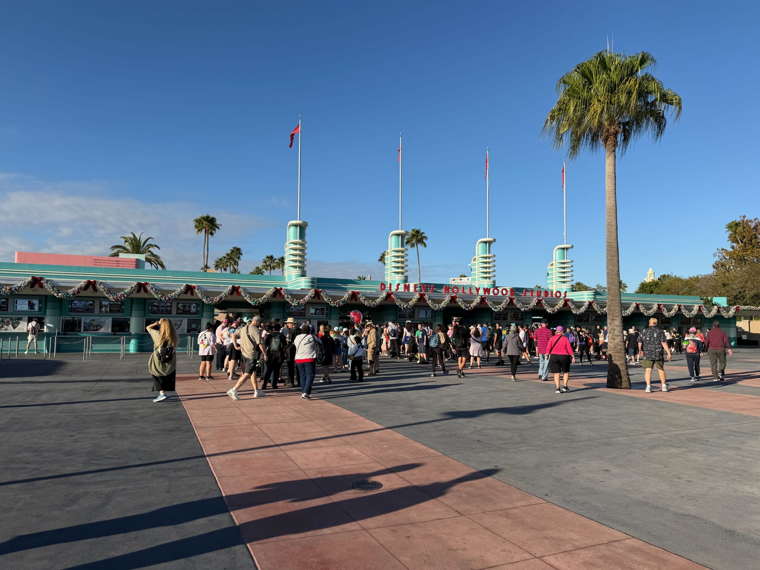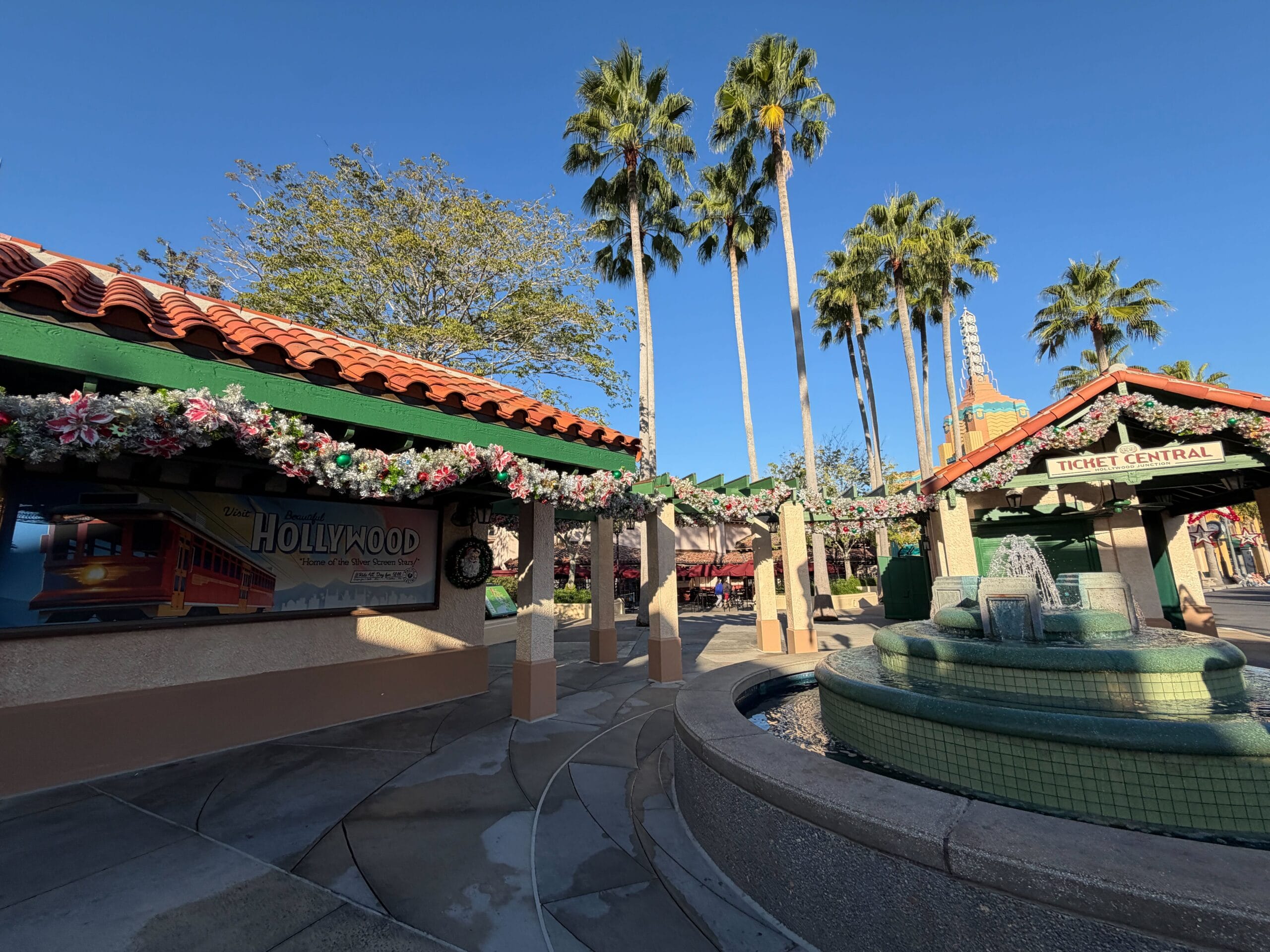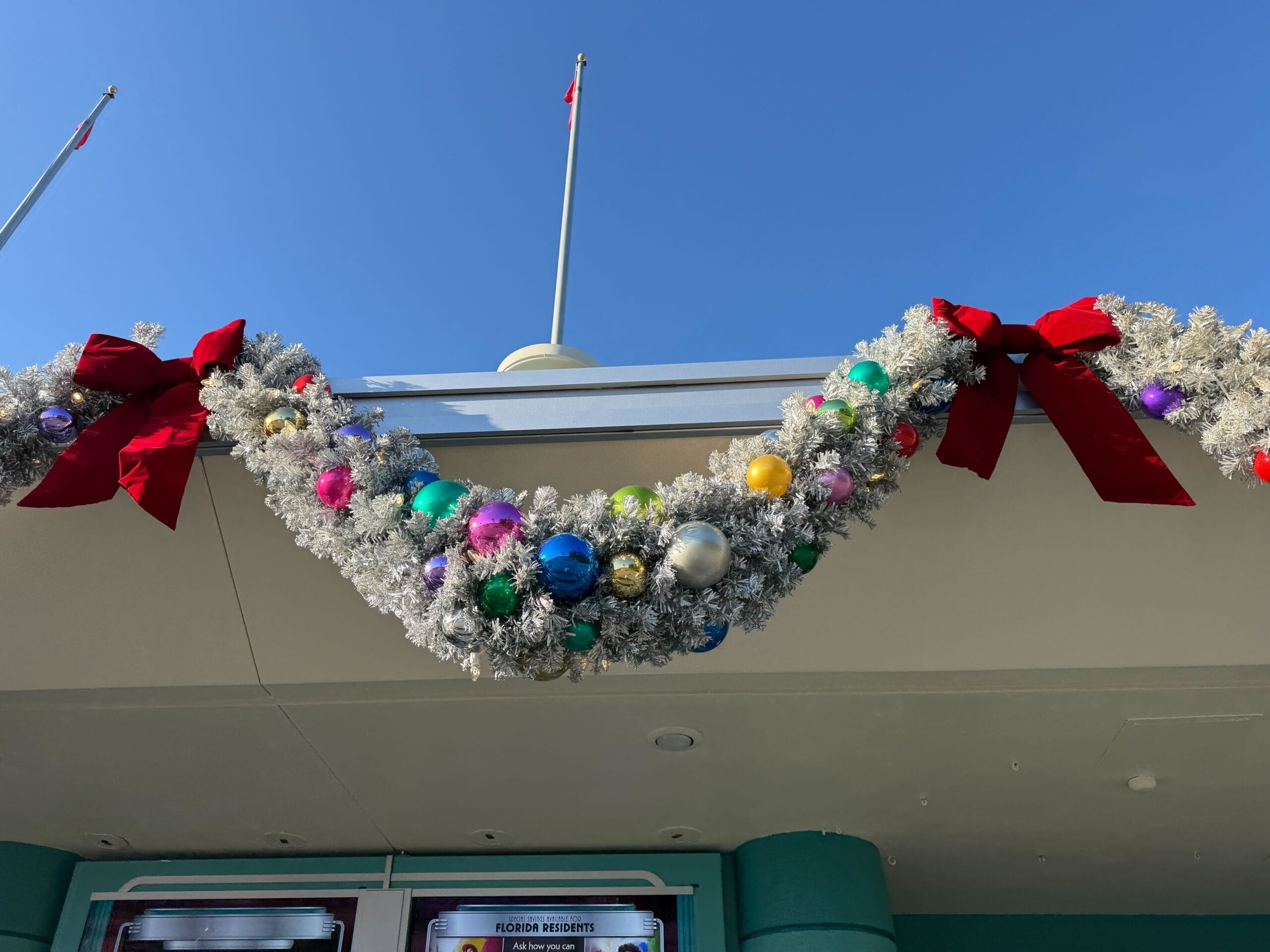 Silver garland now trims the Disney’s Hollywood Studios ticket plaza, welcoming guests to the park.